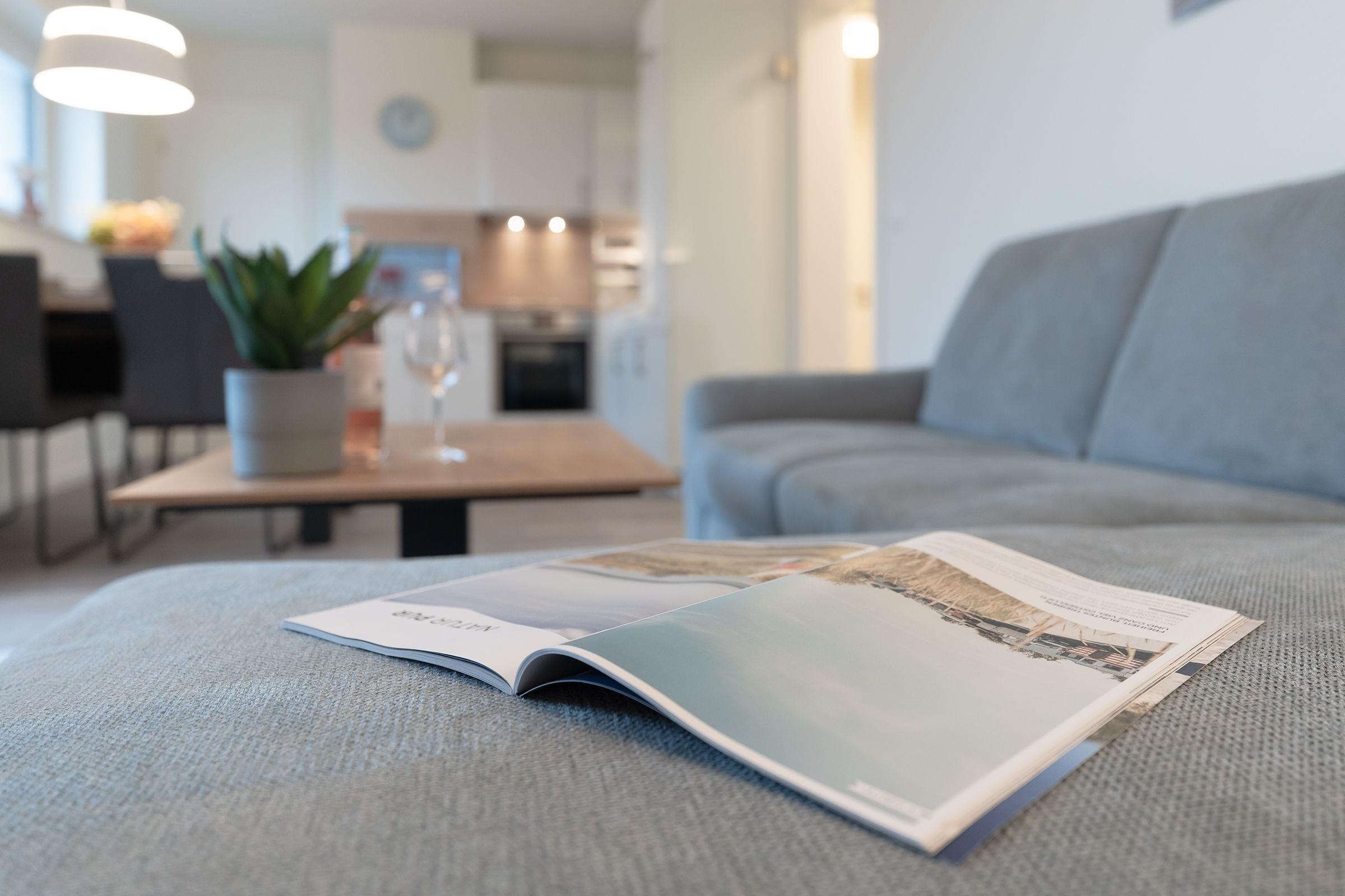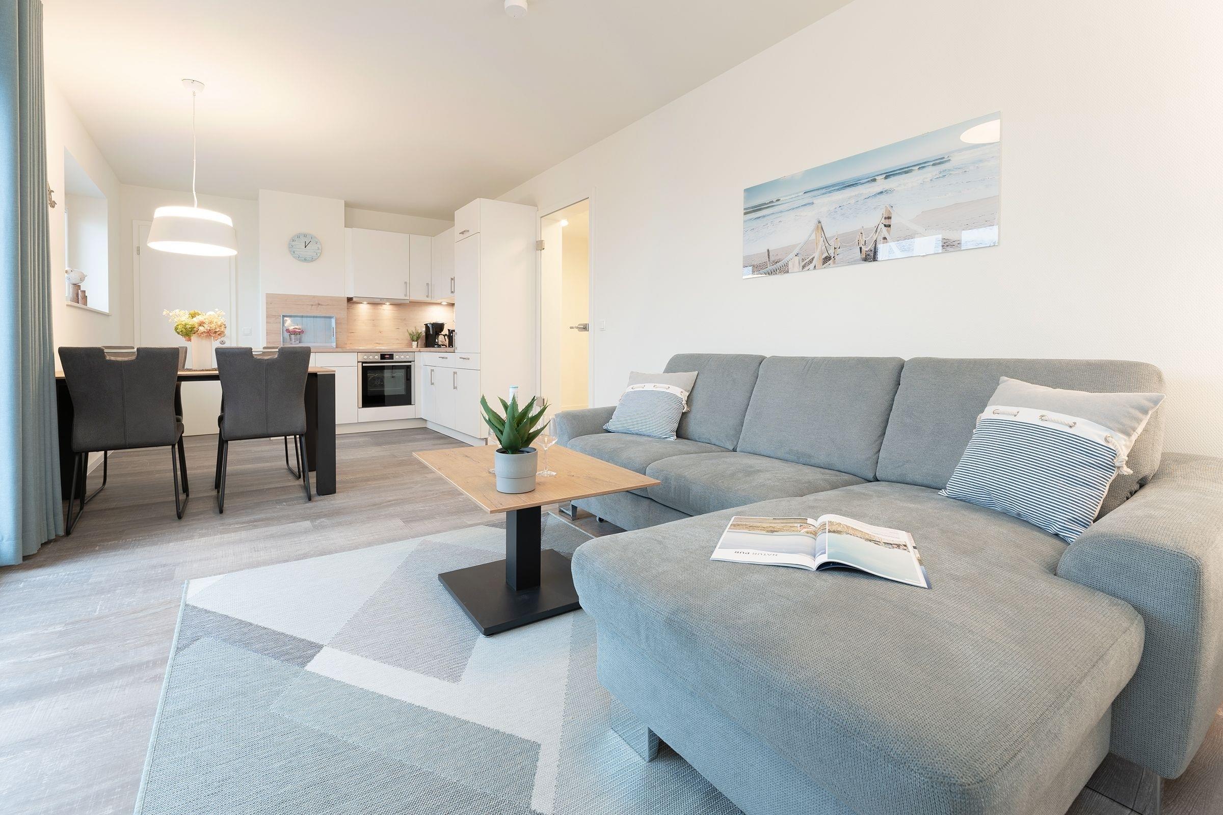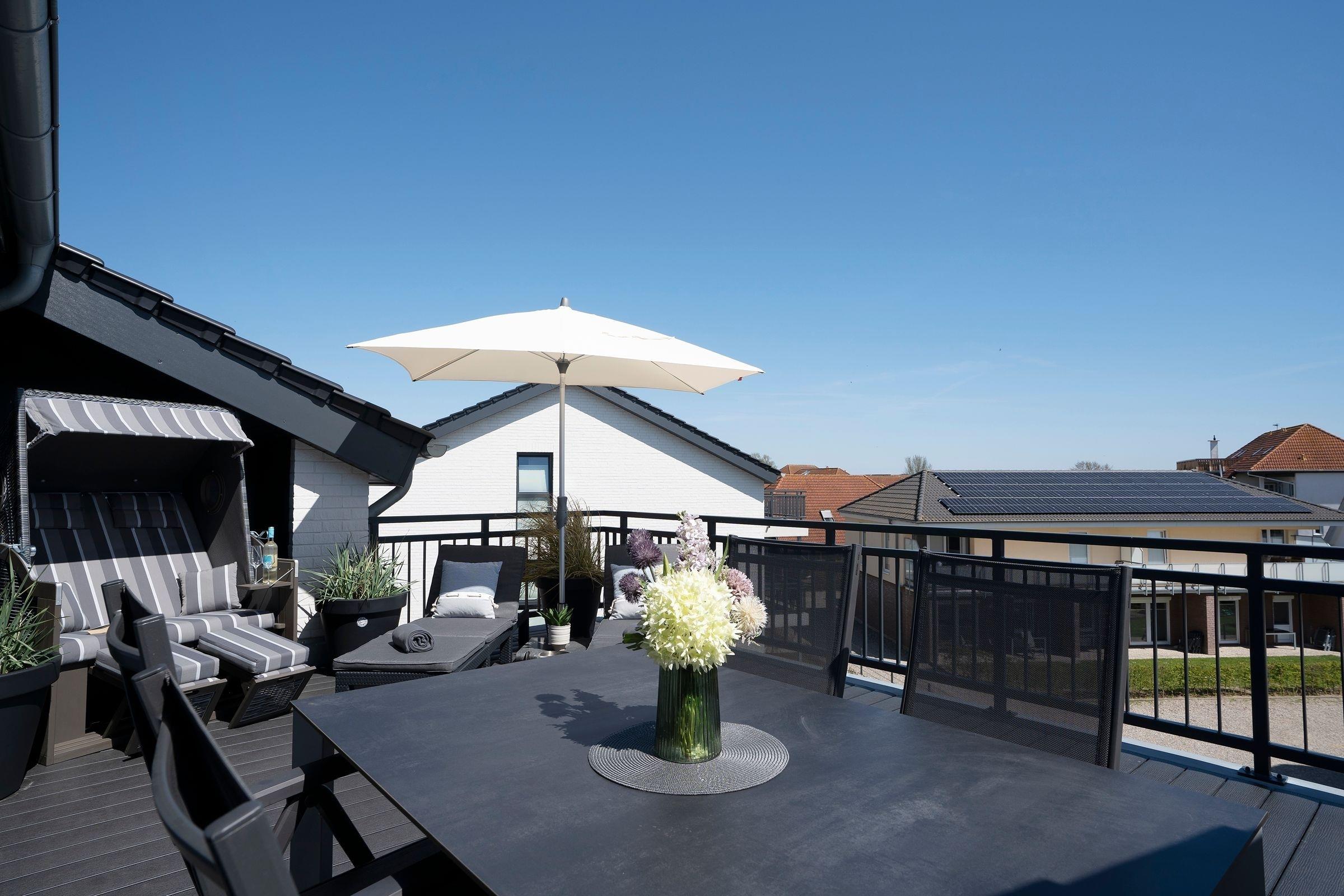 Der offene Wohn-, Ess- und Kochbereich empfängt Sie lichtdurchflutet und mit maritimer Gemütlichkeit. Auf dem kuscheligen Sofa, das sich mit wenigen Griffen zu einem weiteren Schlafplatz verwandeln lässt (ca. 140x200cm) können Sie den Urlaubstag entspannt vor dem TV ausklingen lassen. Durch die große Terrassentür gelangen Sie auf die möblierte Dachterrasse, auf der Sie ein Strandkorb zum Relaxen einlädt, hier lässt es sich an warmen Sommerabenden, als auch bei frischeren Temperaturen mit einer Decke gut aushalten.