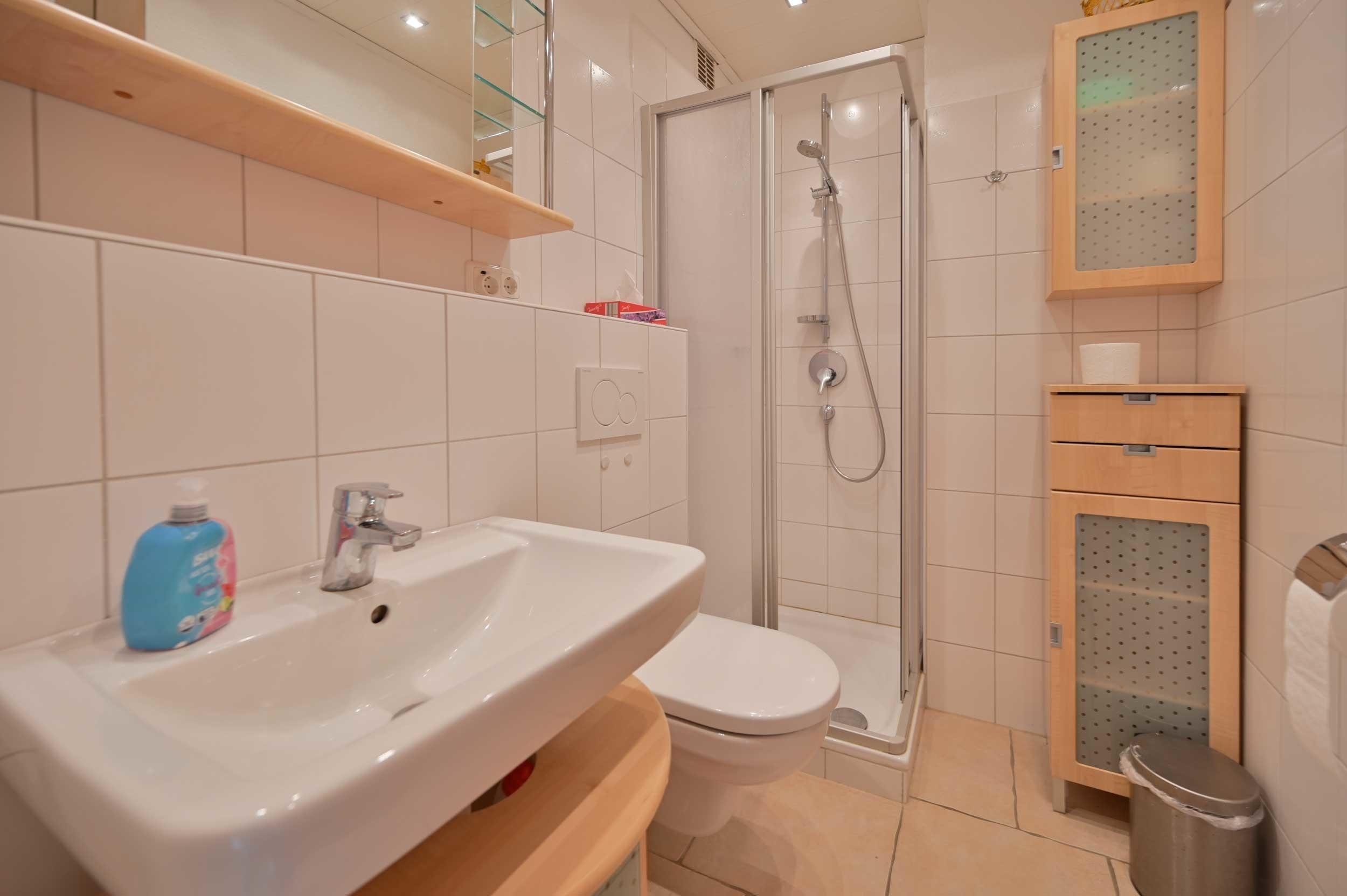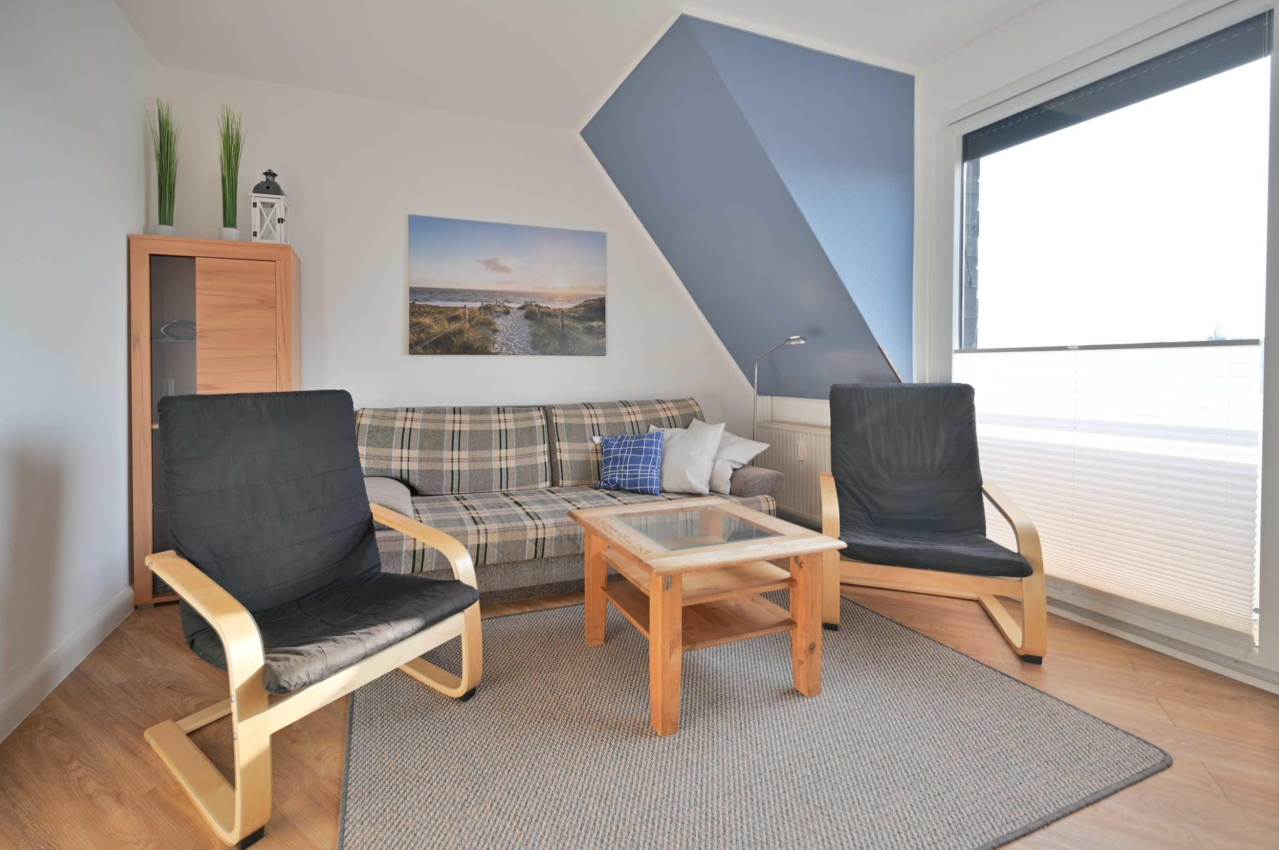 Die freundliche Ferienwohnung liegt in der ersten Etage und verfügt über einen hübschen Wohnraum mit integrierter Küchenzeile, einem Schlafsofa und frz. Balkon. Darüber hinaus finden Gäste in dieser Wohnung ein separates Schlafzimmer mit einem neuen in weiß gehaltenen Doppelbett im Breite 1,60m mit neuen Lattenrosten und Matratzen, Nachttischen und ein Bad mit Dusche/WC.