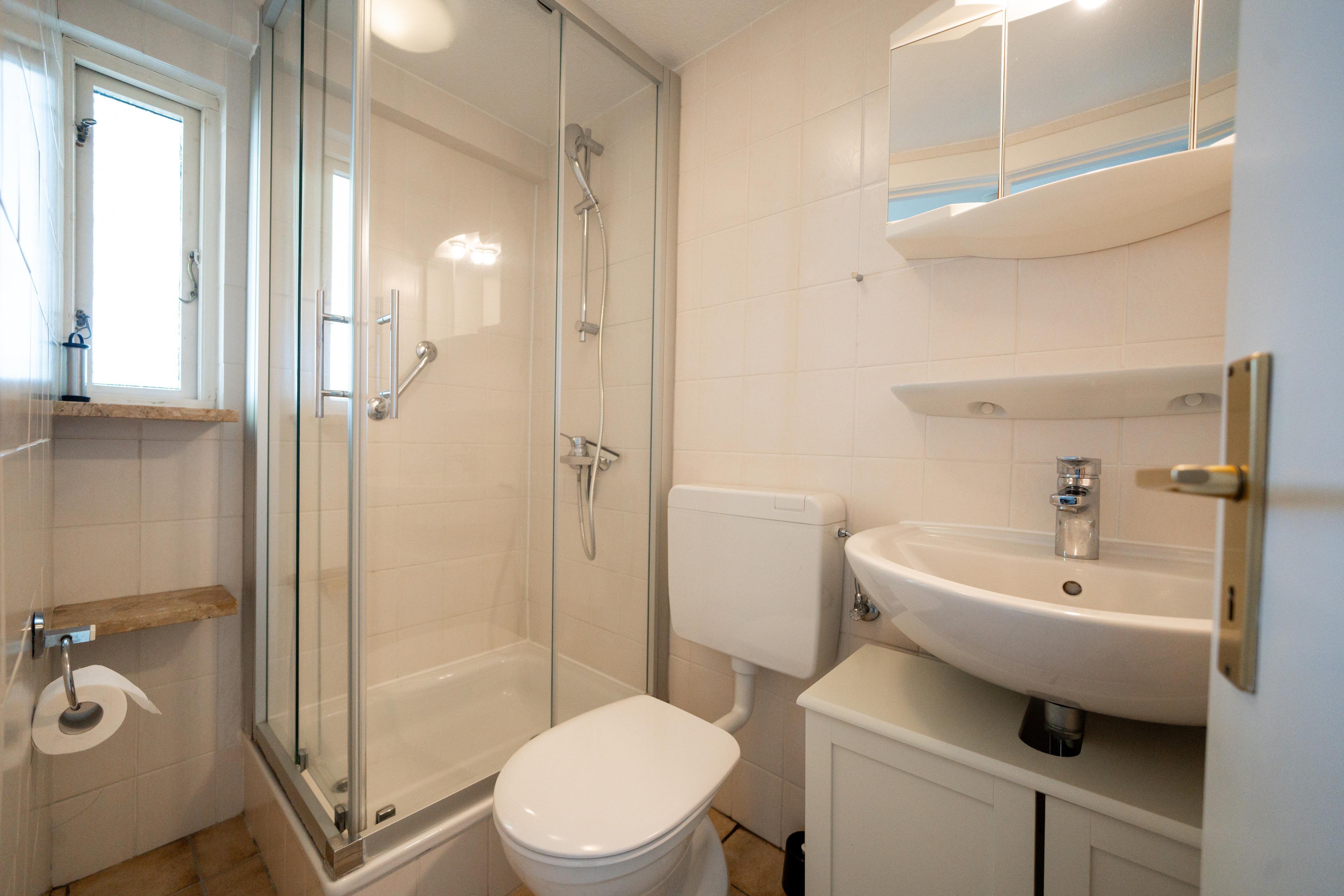 Das Badezimmer ist mit Dusche und WC ausgestattet.