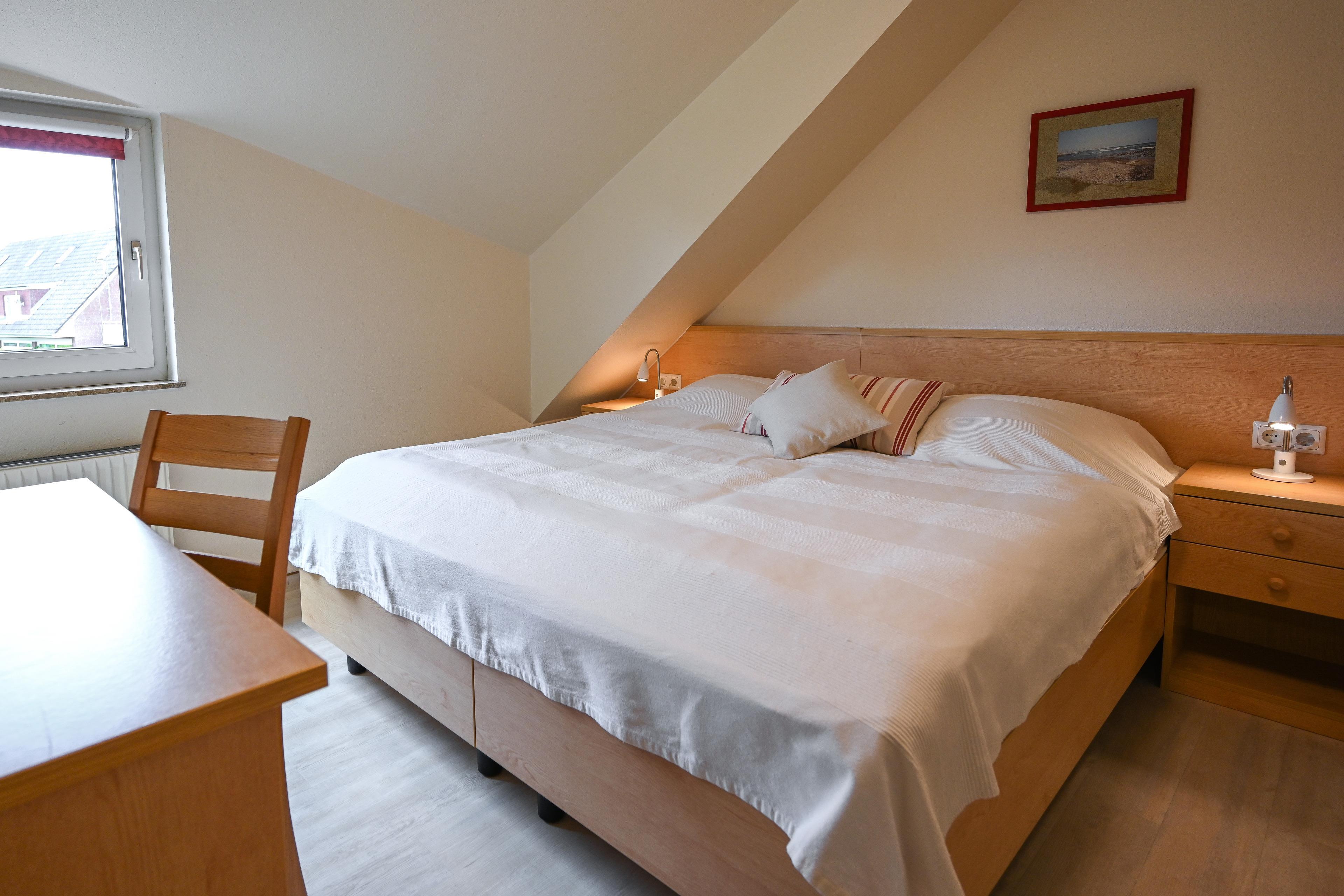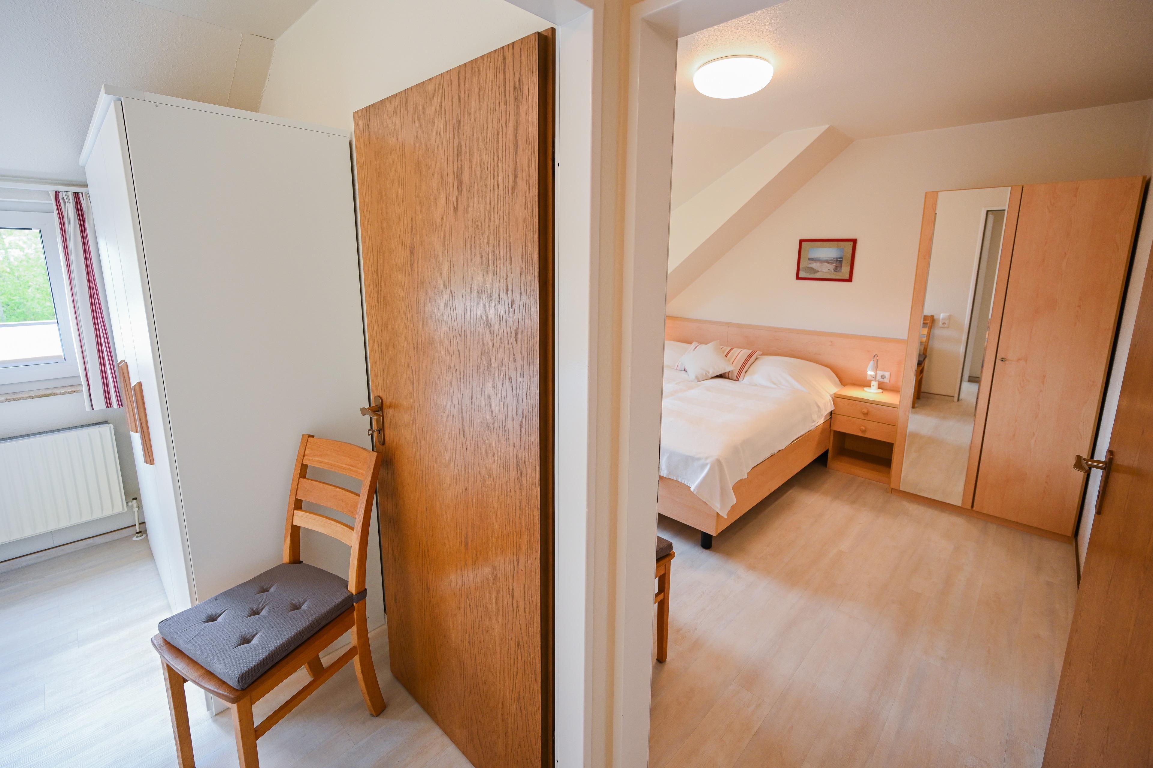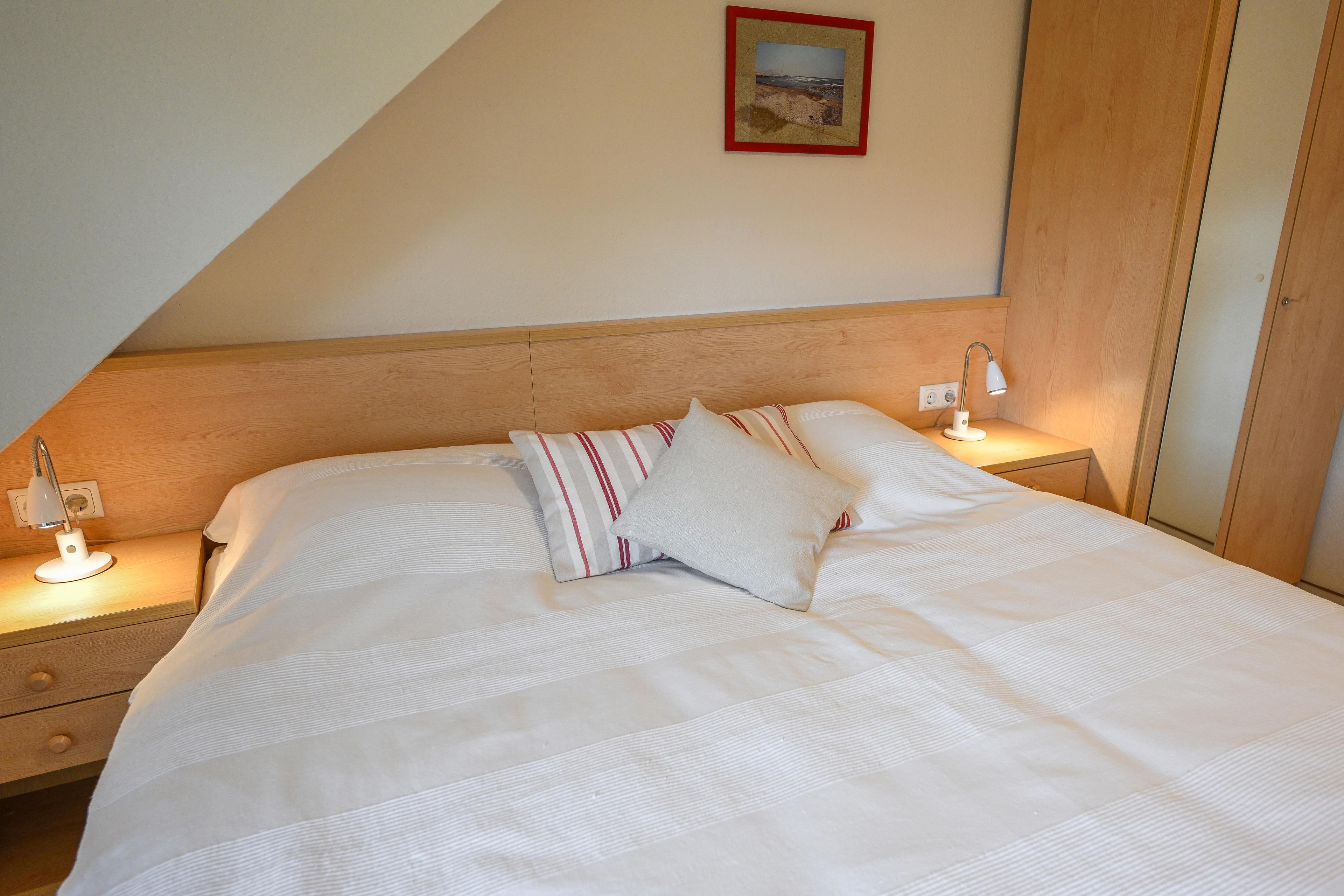 In der 1. Etage liegt unsere große 3-Raum-Ferienwohnung Nr.19 mit Südbalkon. Sie eignet sich für 2-4 Personen und ist mit einem Wohnschlafraum mit Schlafsofa, 2 Schlafräumen zum Teil mit Komfortbetten in Überlänge, Küche mit Geschirrspüler und Mikrowelle, Dusche/WC und Flur ausgestattet. Eine aufwendige Dachkonstruktion gibt der Wohnung ihren besonderen Charme.