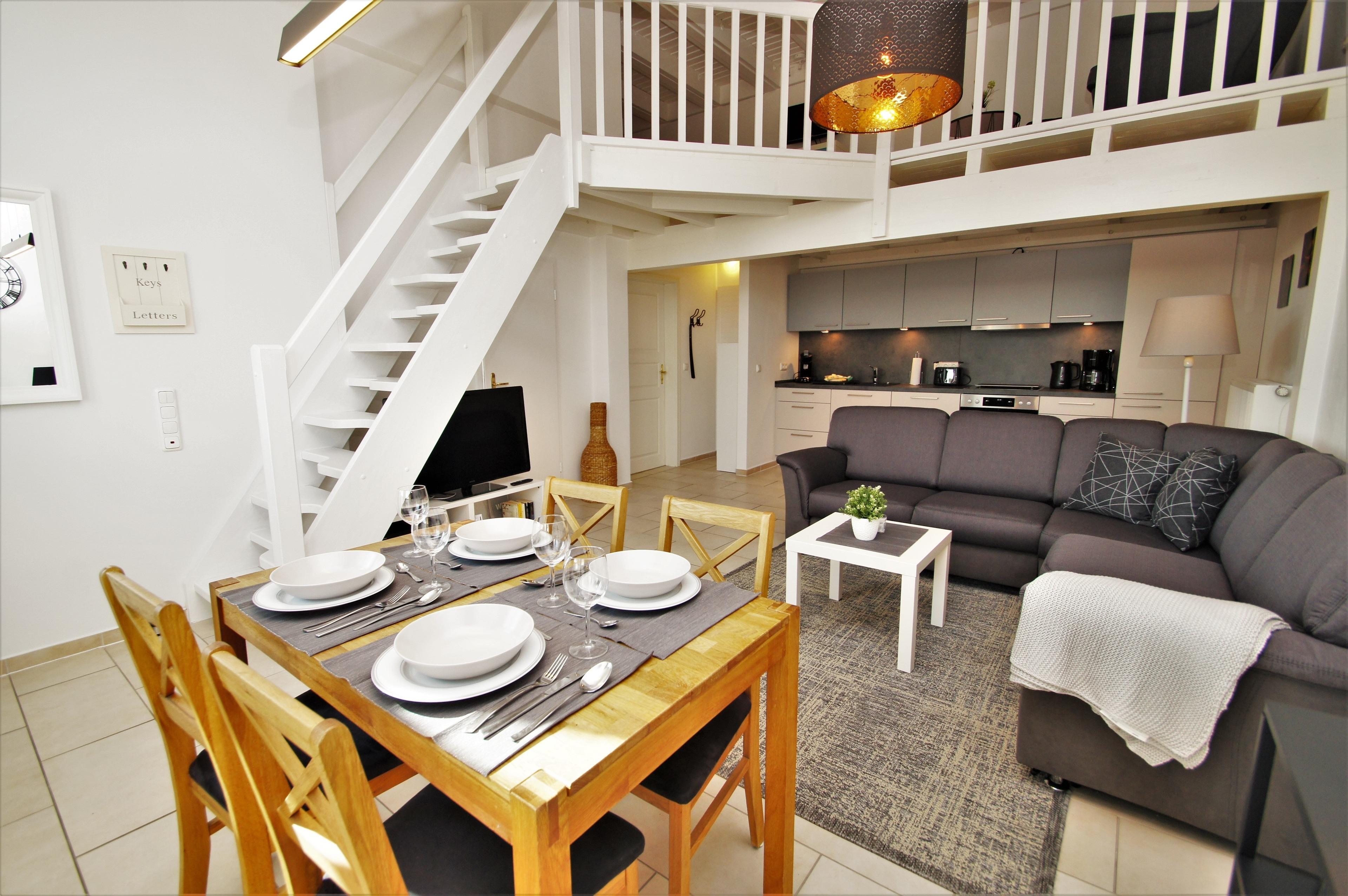 Moderne Ferienwohnung für 4 Personen, hell und freundlich eingerichtet mit Elternschlafzimmer, Schlafmöglichkeiten auf der 20 m² Galerie....2x LCD-TV, Terrasse...