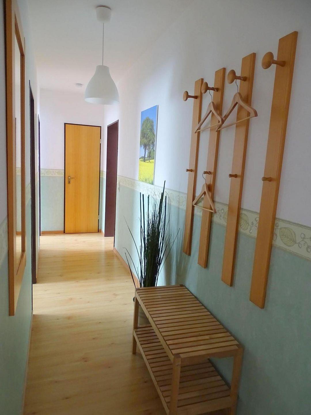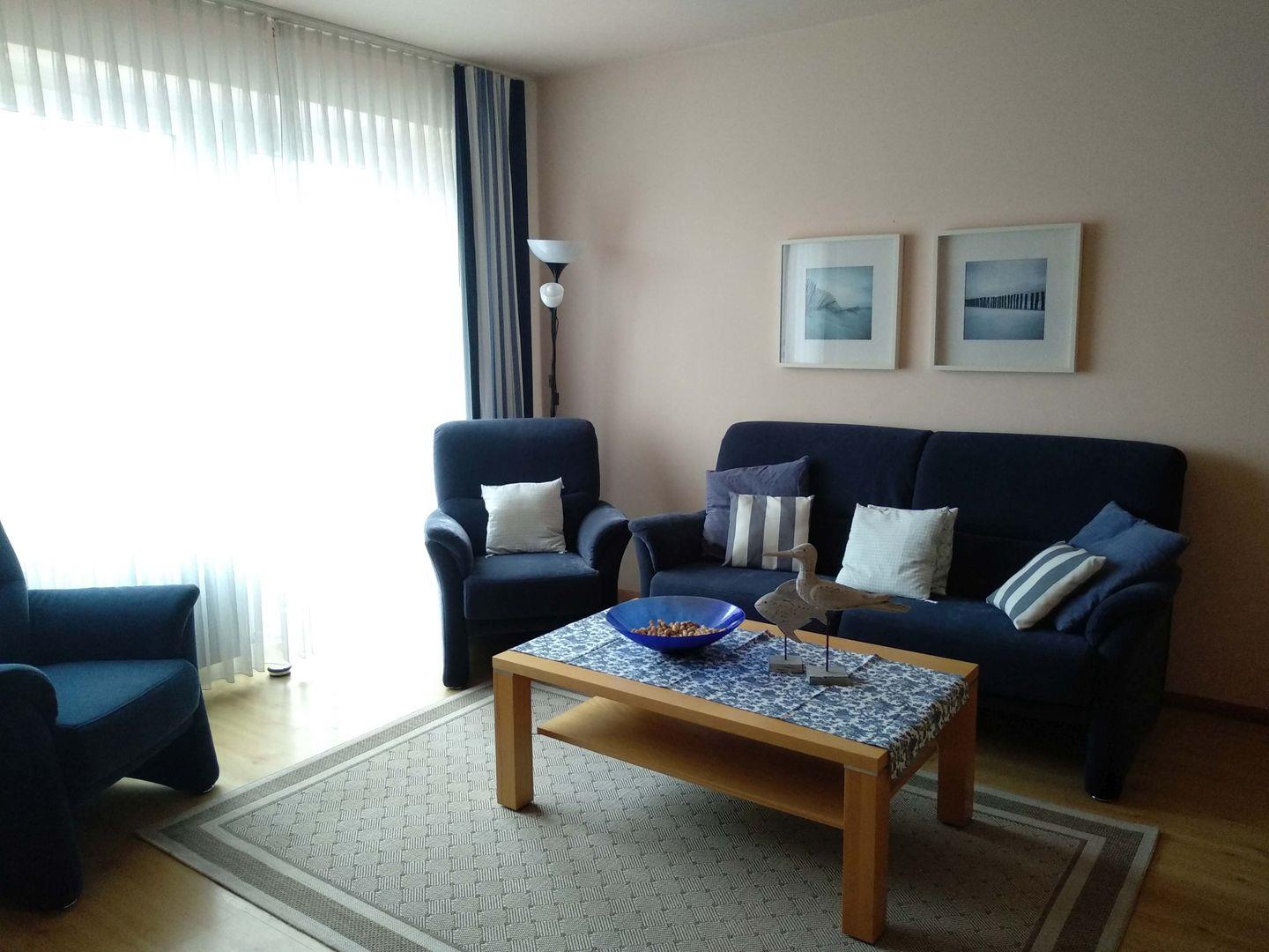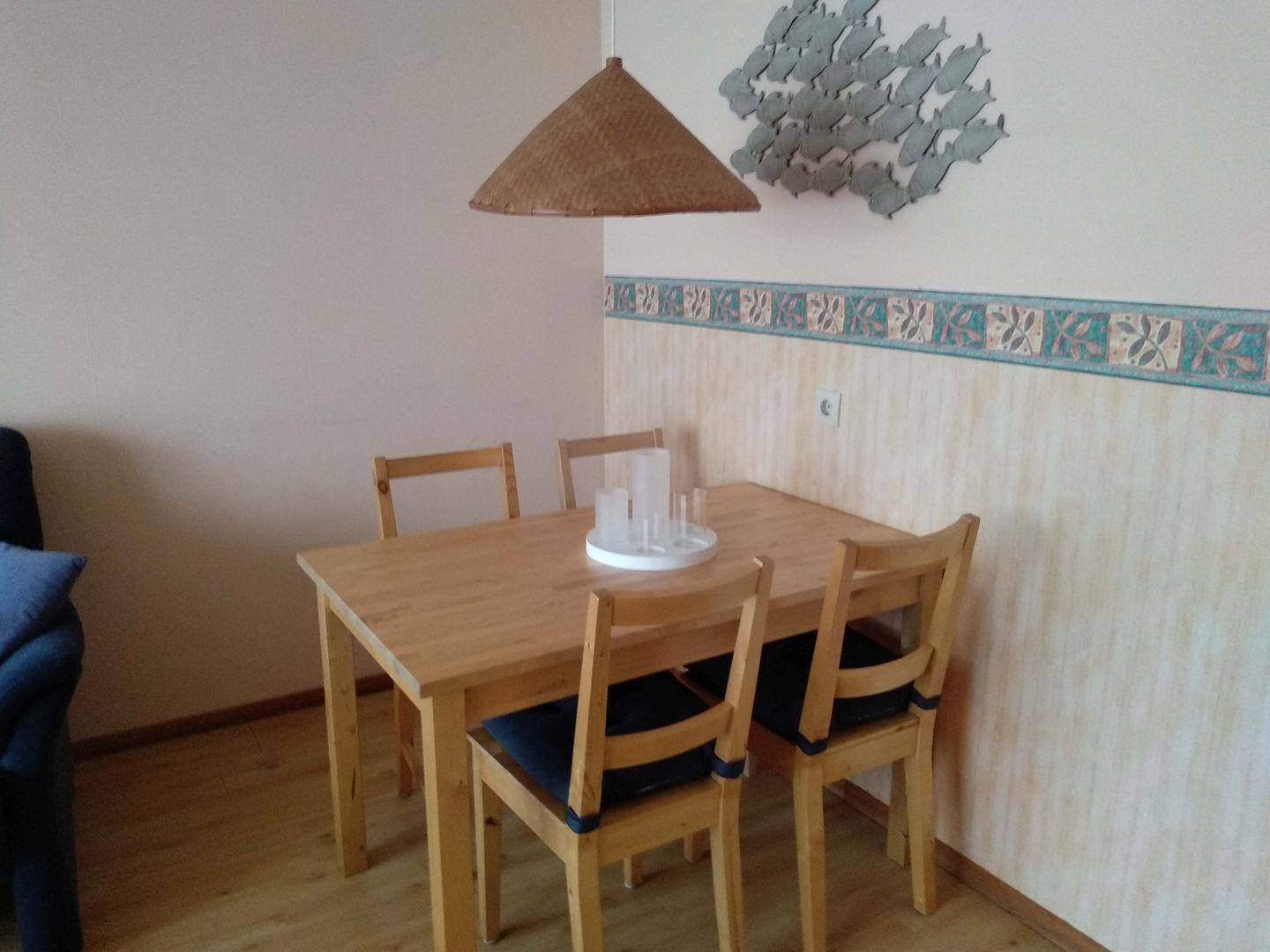 Diese zwei Zimmer Ferienwohnung mit zirka 55 m² im 1.OG mit W-LAN bietet Platz für bis zu vier Personen. Sehr gemütlich und geschmackvoll eingerichtet für eine entspannte Atmosphäre Die Wohnung ist wie folgt aufgeteilt: Flur, ein Duschbad, ein Schlafzimmer mit Doppelbett (160x200 cm), eine separate Küche, ein Wohn-/Esszimmer mit Schrankbett für zwei Personen und Zugang zum großem Süd-Westbalkon mit Terrassenmöbeln und Strandkorb. Zur Wohnung gehört ein fester PKW Stellplatz und im Keller kann gegen Gebühr die Waschmaschine genutzt werden. Ein Kinderreisebett ist Bestandteil der Wohnungseinrichtung. Ein Kinderhochstuhl kann bei Bedarf evtl. gestellt werden. Ihr wohlerzogener Hund bzw. zwei kleine Hunde dürfen hier gerne auch den "Hundeurlaub" verbringen.