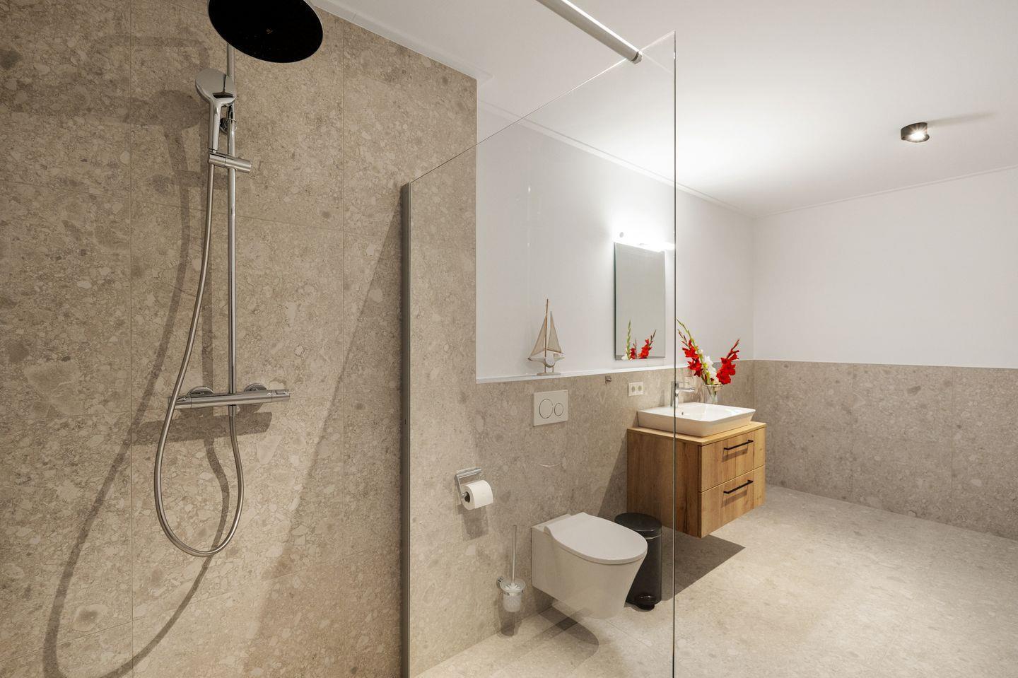 Das Badezimmer lässt Dank eines Tageslichtfensters viel natürliches Licht herein und ist mit einem stilvollen Waschtisch und einer modernen, ebenerdigen Dusche ausgestattet.