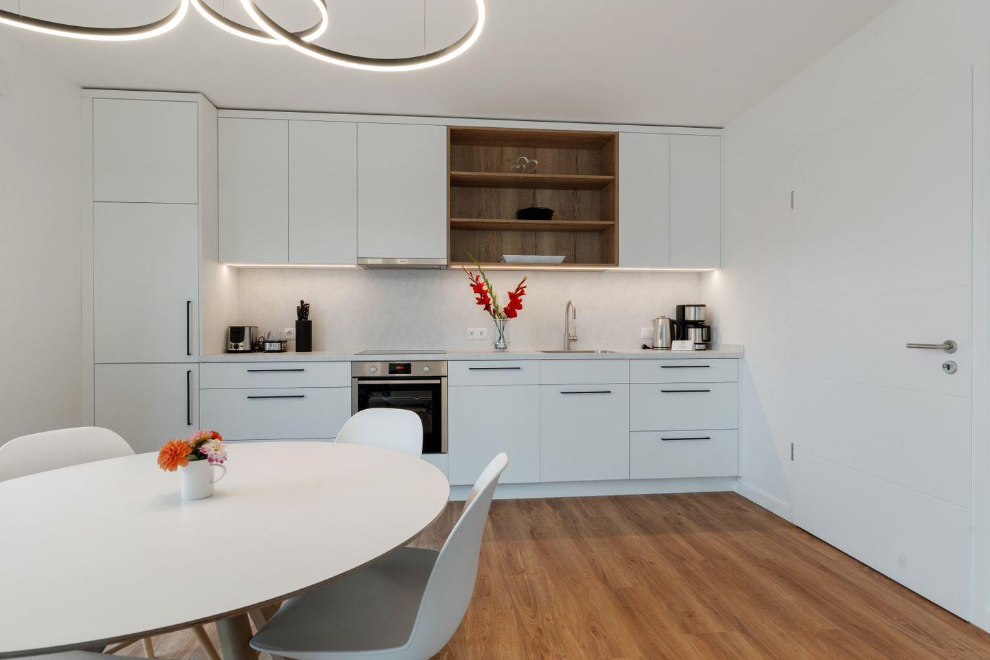Diese Wohnung besticht durch einen offenen Wohnbereich, der durch seine helle und moderne Gestaltung einladend wirkt. Die voll ausgestattete Küchenzeile lässt keine Wünsche offen und bietet alles, was für die Zubereitung von Mahlzeiten benötigt wird. Im Wohnbereich lädt ein großes, gemütliches Sofa zum Entspannen ein, und der Esstisch bietet Platz für gemeinsame Mahlzeiten. Für Unterhaltung sorgt ein TV-Gerät, der den Wohnbereich komplettiert.