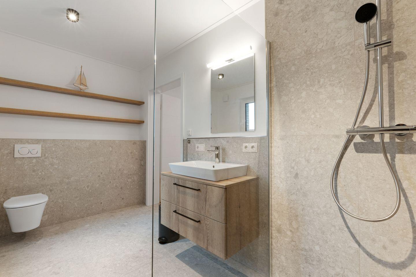 Das Badezimmer verfügt über ein Fenster, das viel Tageslicht hereinscheinen lässt. Es ist modern eingerichtet, mit einem stilvollen Waschtisch und einer ebenerdigen Dusche für höchsten Komfort.