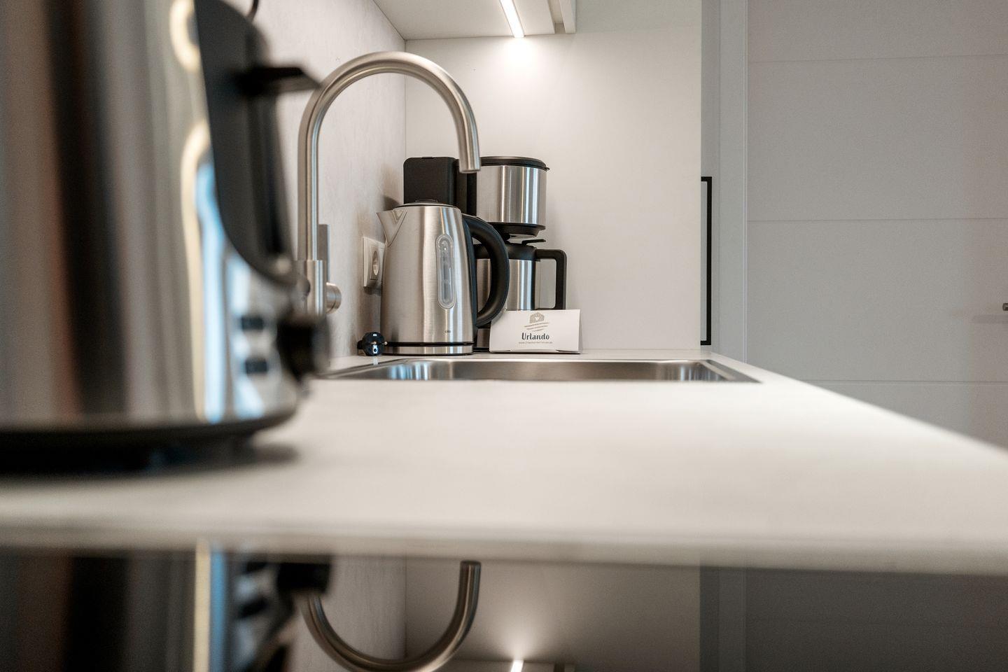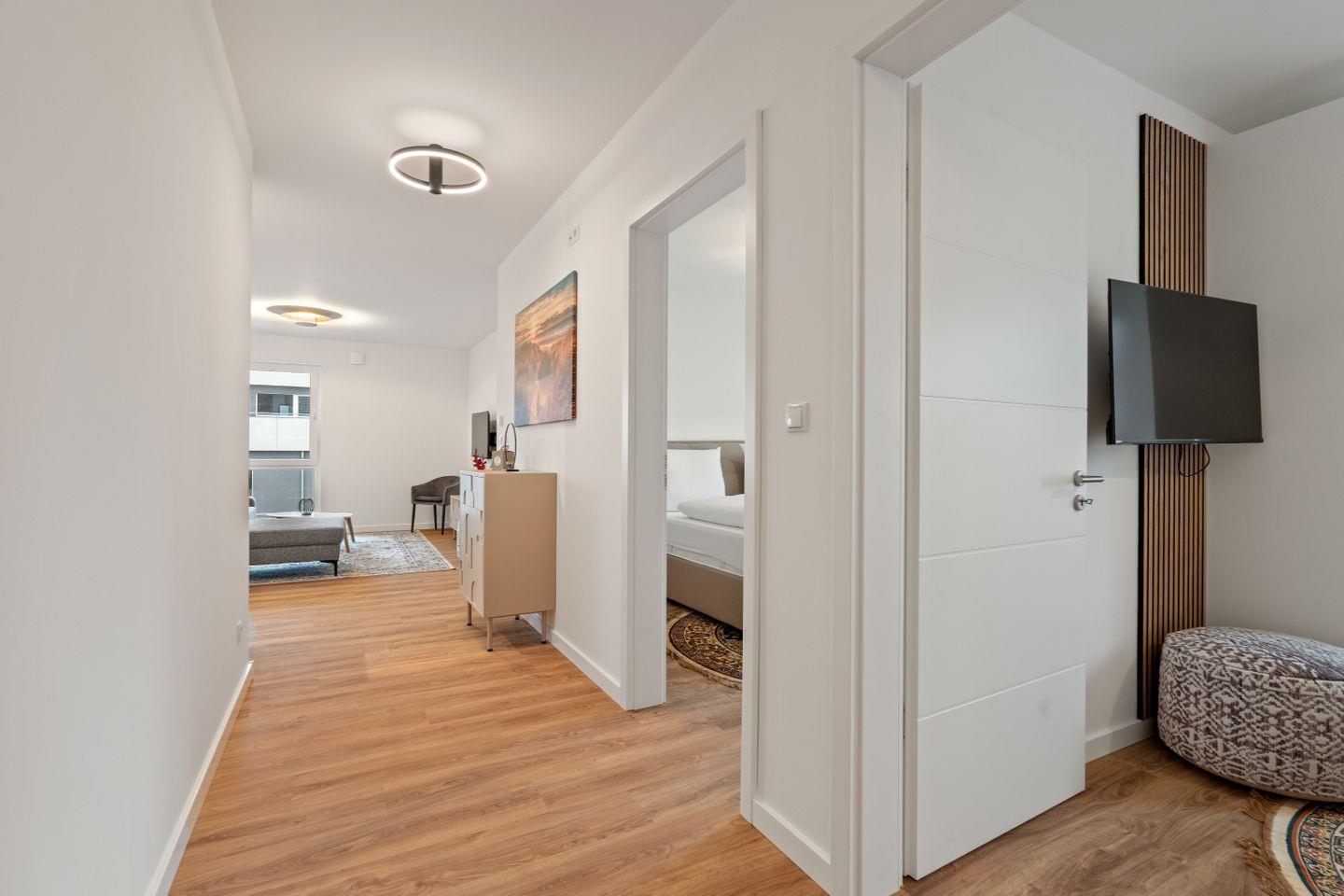 Dieses Apartment besticht durch einen offenen Wohnbereich, der durch seine helle und moderne Gestaltung einladend wirkt. Die voll ausgestattete Küchenzeile lässt keine Wünsche offen und bietet alles, was für die Zubereitung von Mahlzeiten benötigt wird. Im Wohnbereich lädt ein großes, gemütliches Sofa zum Entspannen ein, und der Esstisch bietet Platz für gemeinsame Mahlzeiten. Für Unterhaltung sorgt ein TV-Gerät, der den Wohnbereich komplettiert.