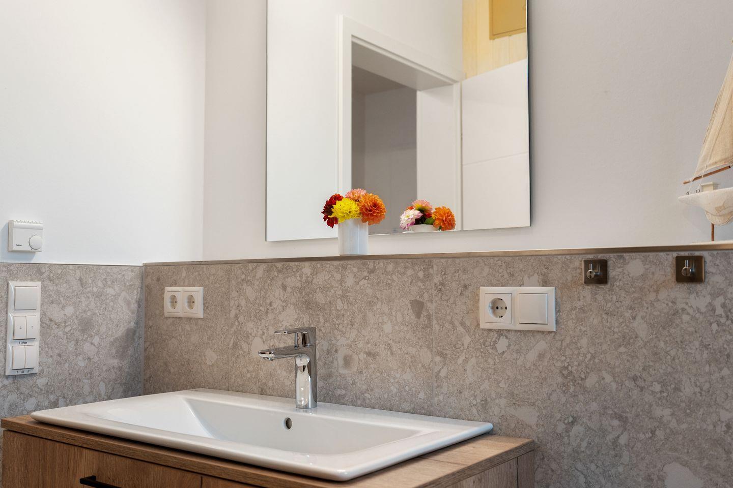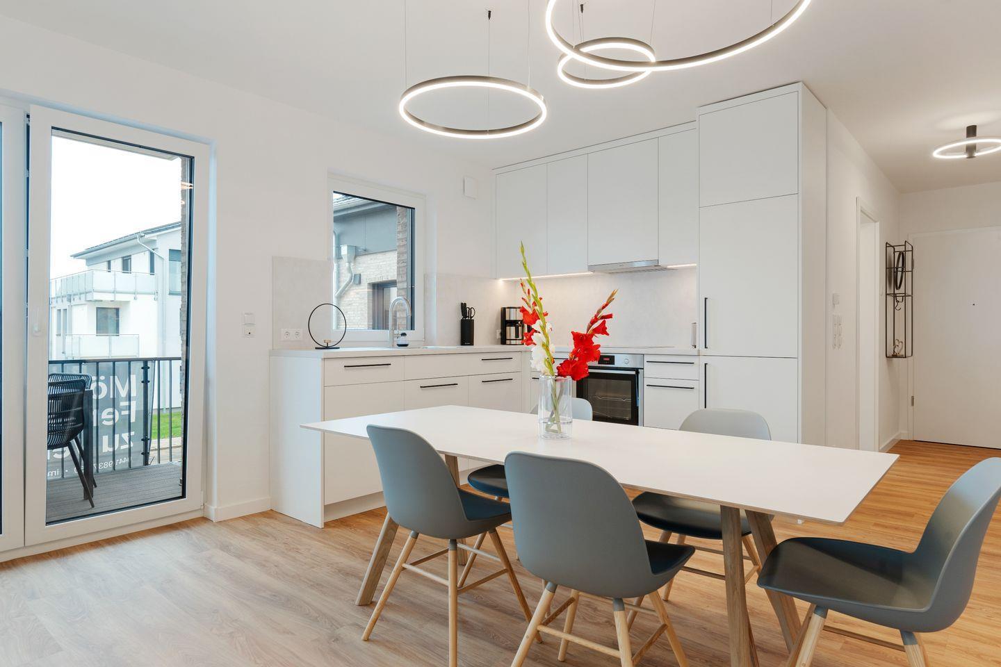 Entdecken Sie diese stilvolle Ferienwohnung, die modernen Komfort und durchdachte Details vereint. Die offene Küche mit extra hoher Arbeitsplatte bietet viel Platz für gemeinsame Kochabende und geselliges Beisammensein.