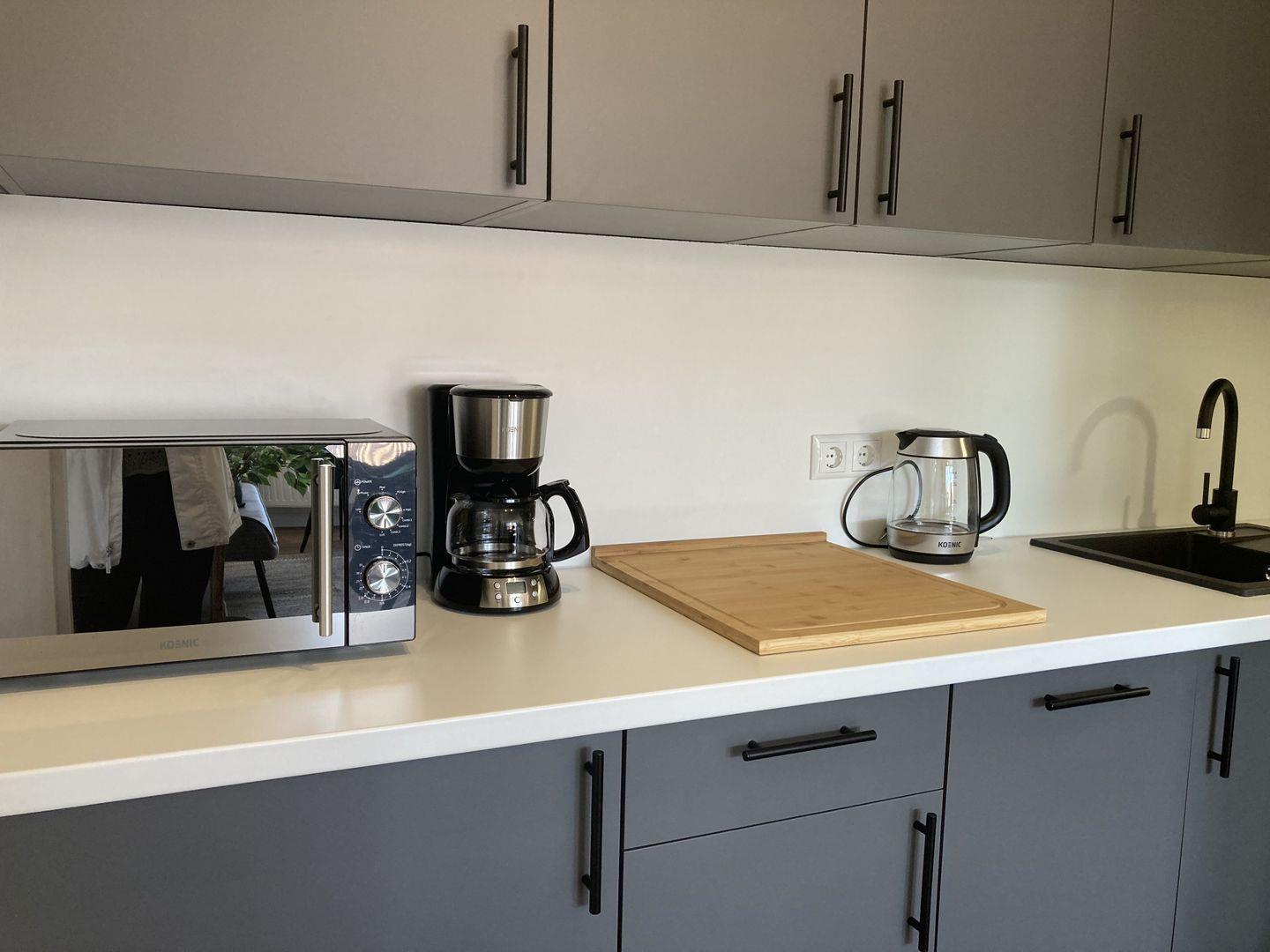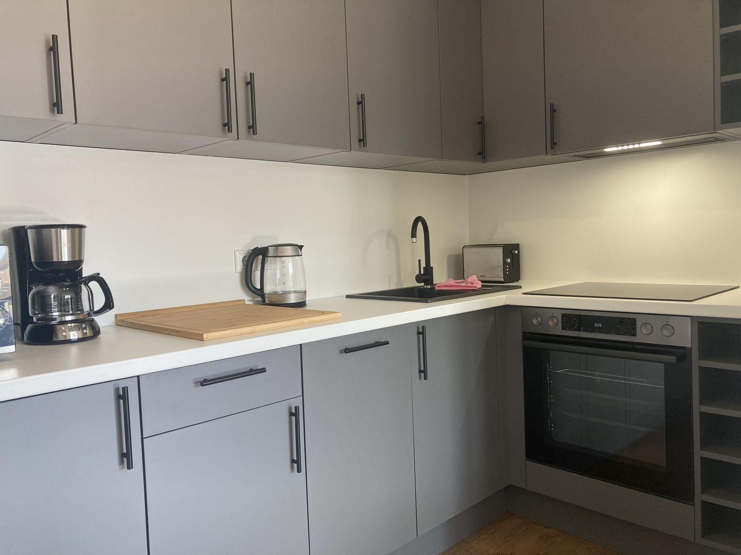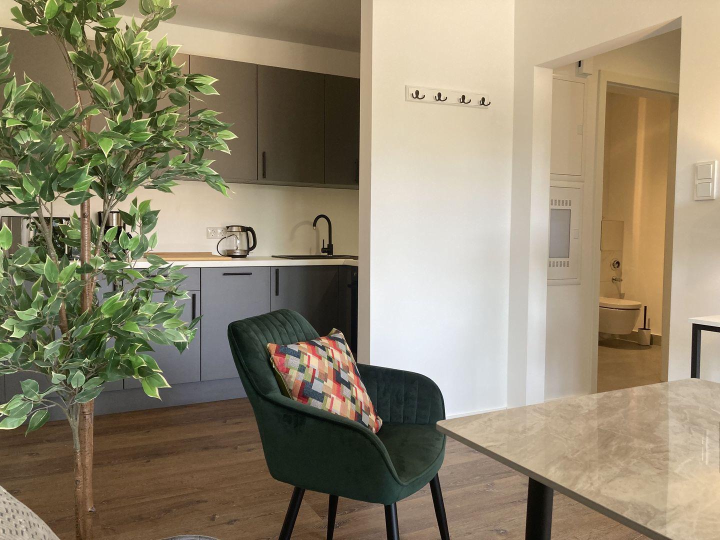integrierte voll ausgestattete Küche mit Backofen, Herd, Geschirrspüler und Mikrowelle