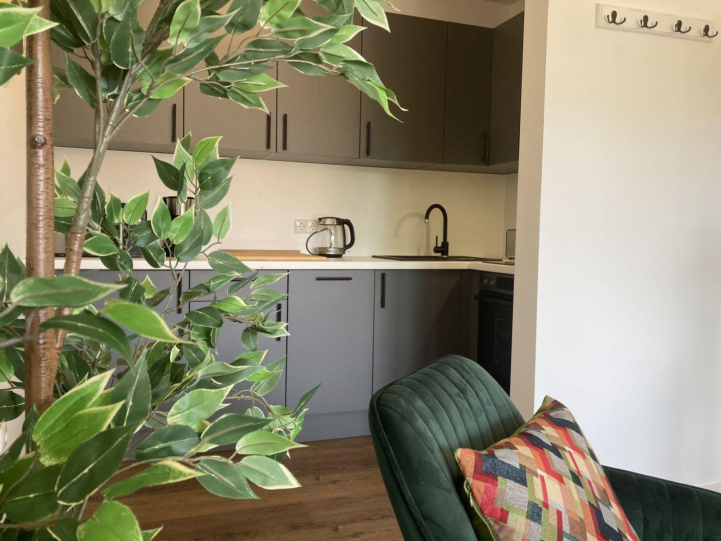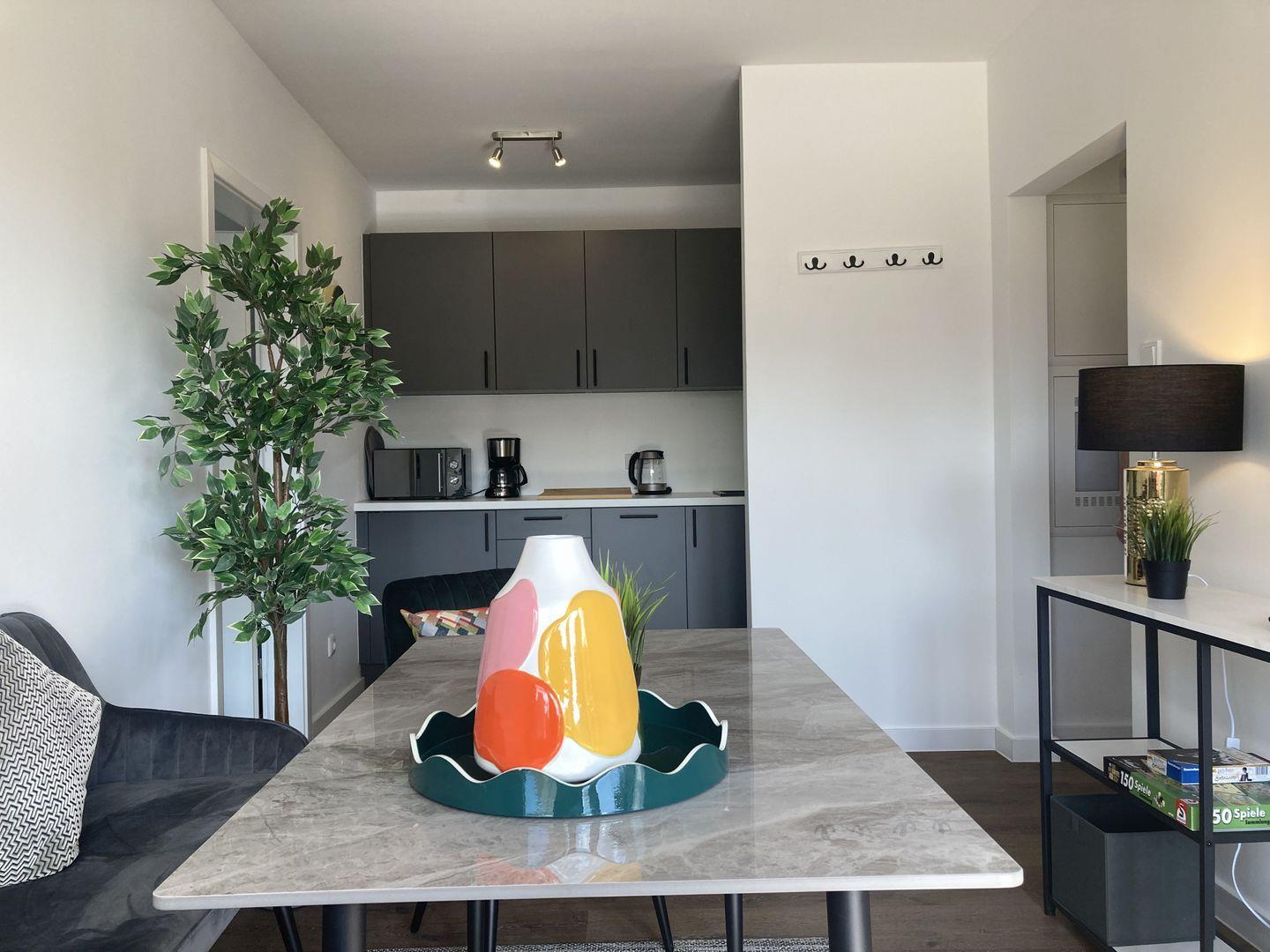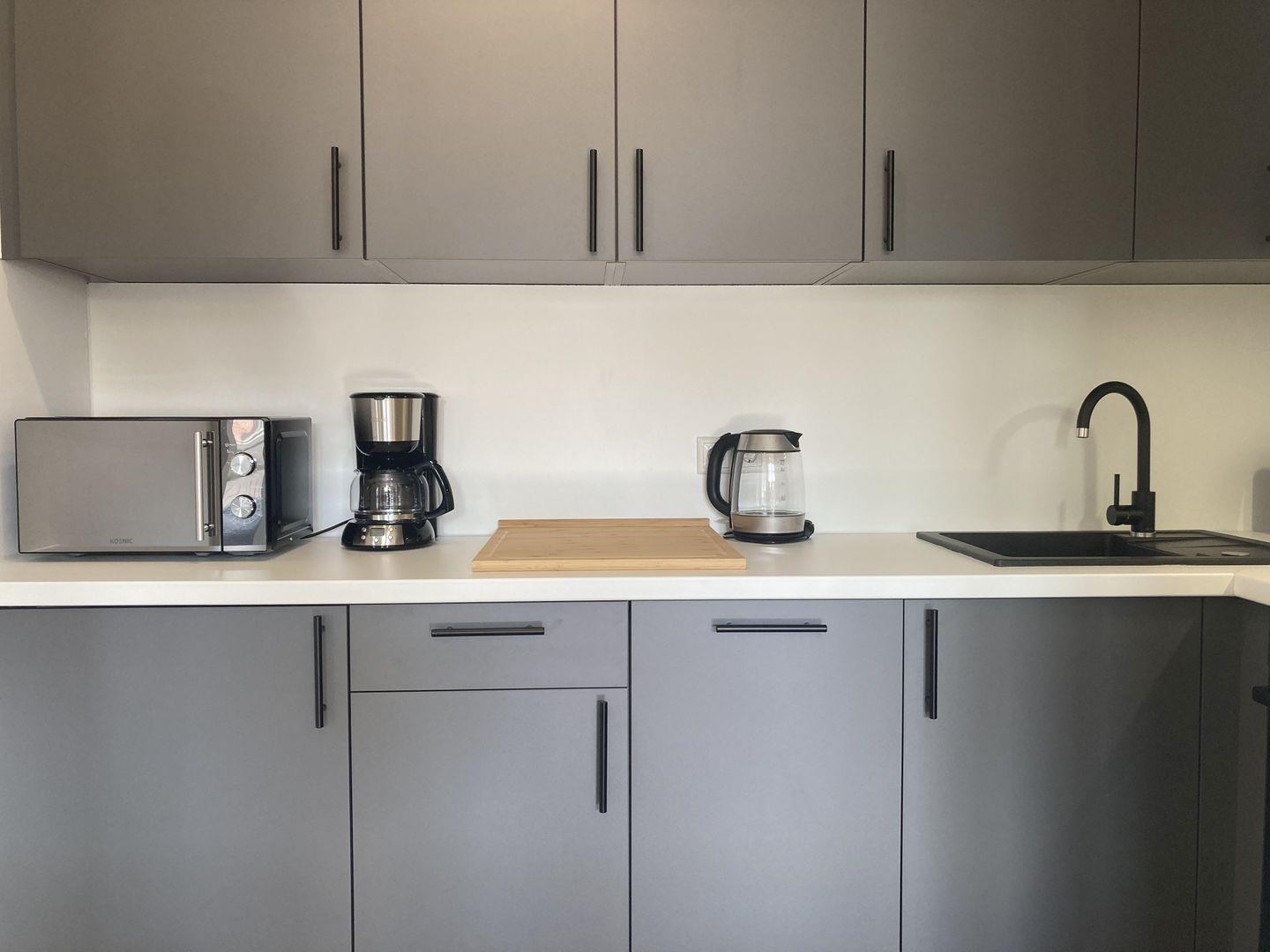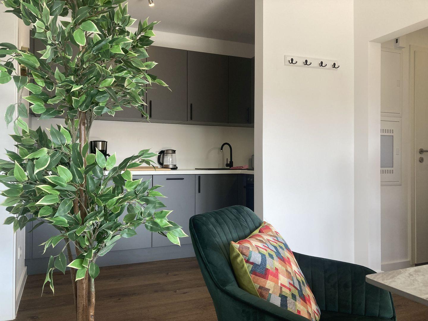 integrierte voll ausgestattete Küche mit Backofen, Herd, Geschirrspüler und Mikrowelle