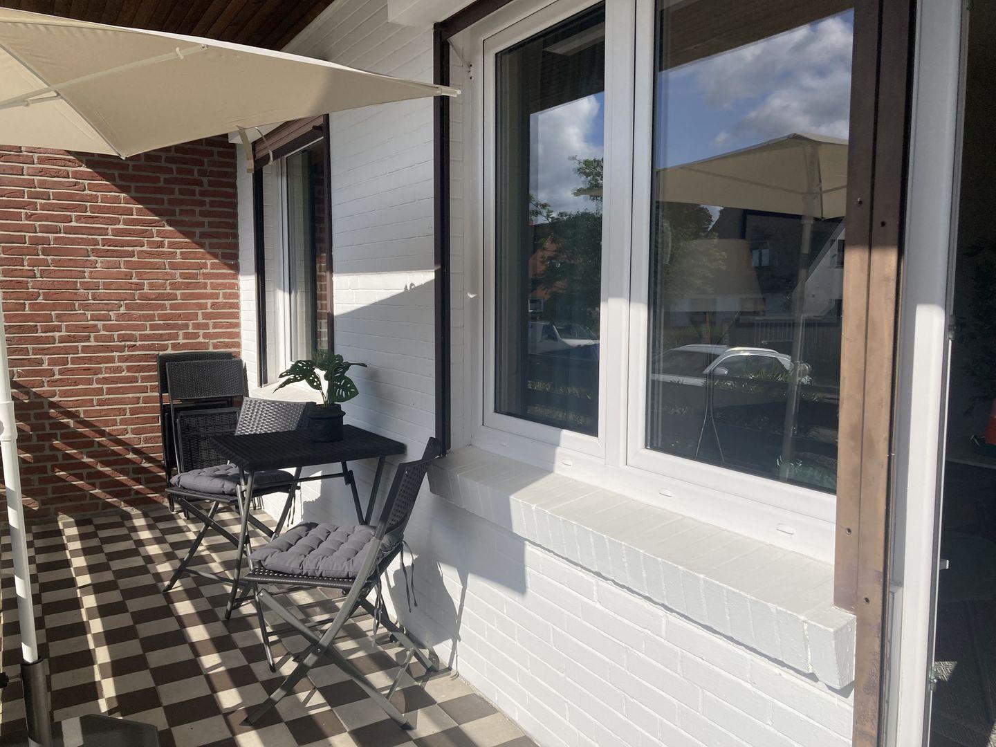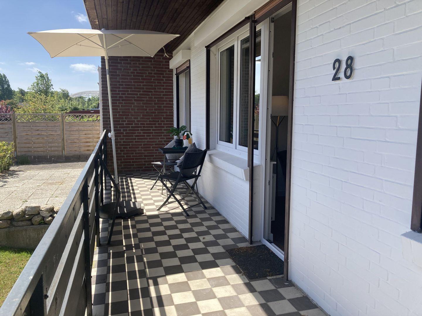 - Balkon mit Bestuhlung und Sonnenschirm vom Wohnzimmer aus begehbar