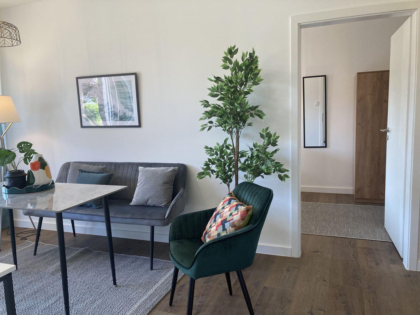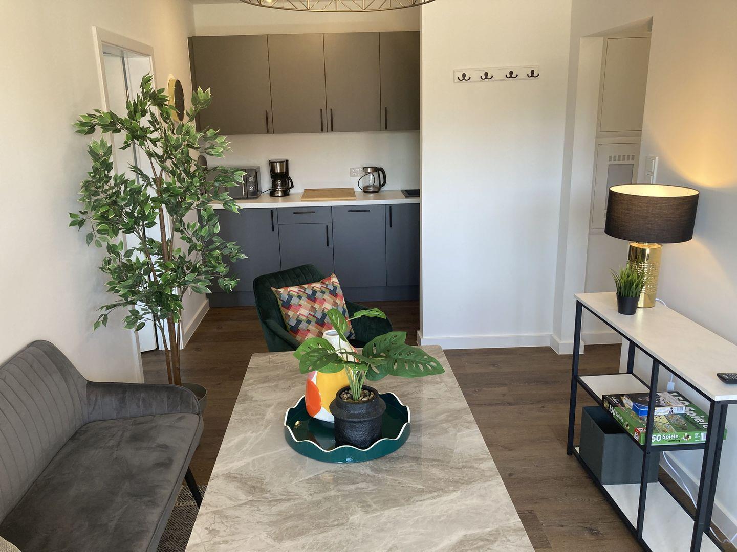 - Wohnzimmer mit Sofa, Tisch, 2 Sesseln und TV,