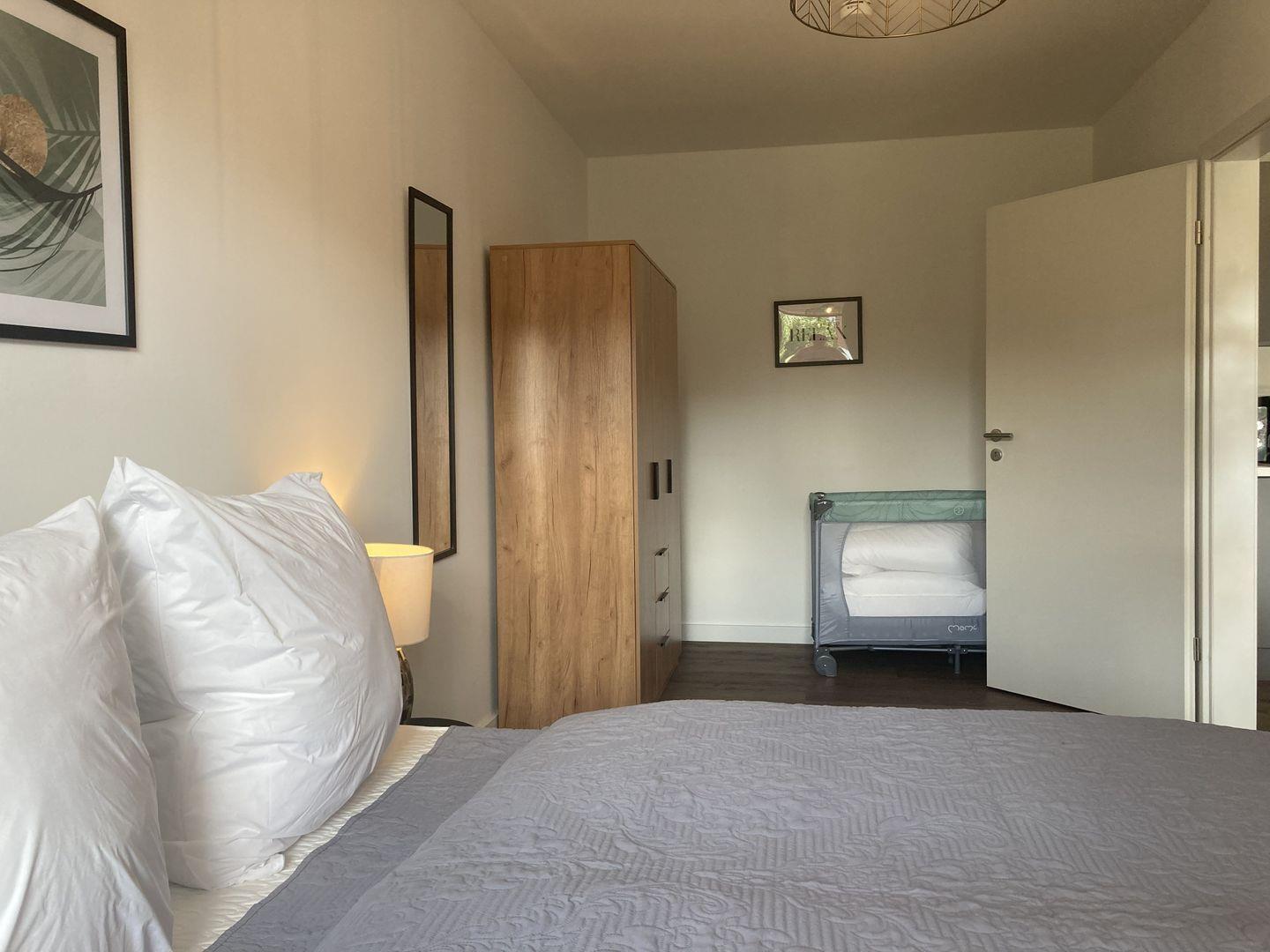 - Schlafzimmer mit Doppelbett, Kleiderschrank und Kinderreisebett