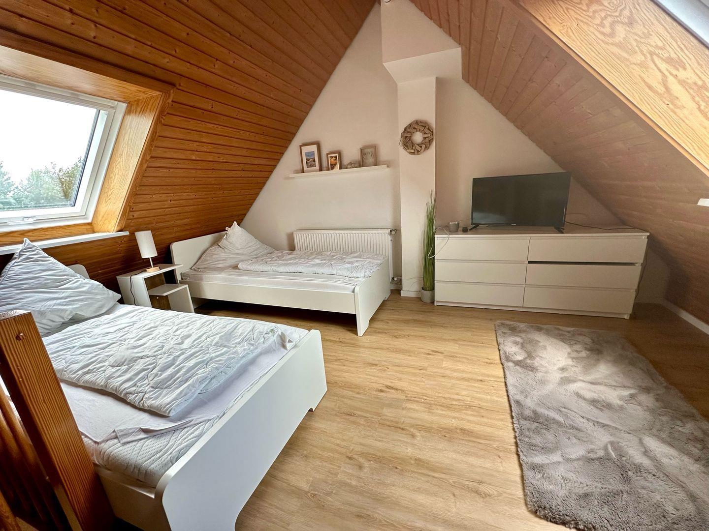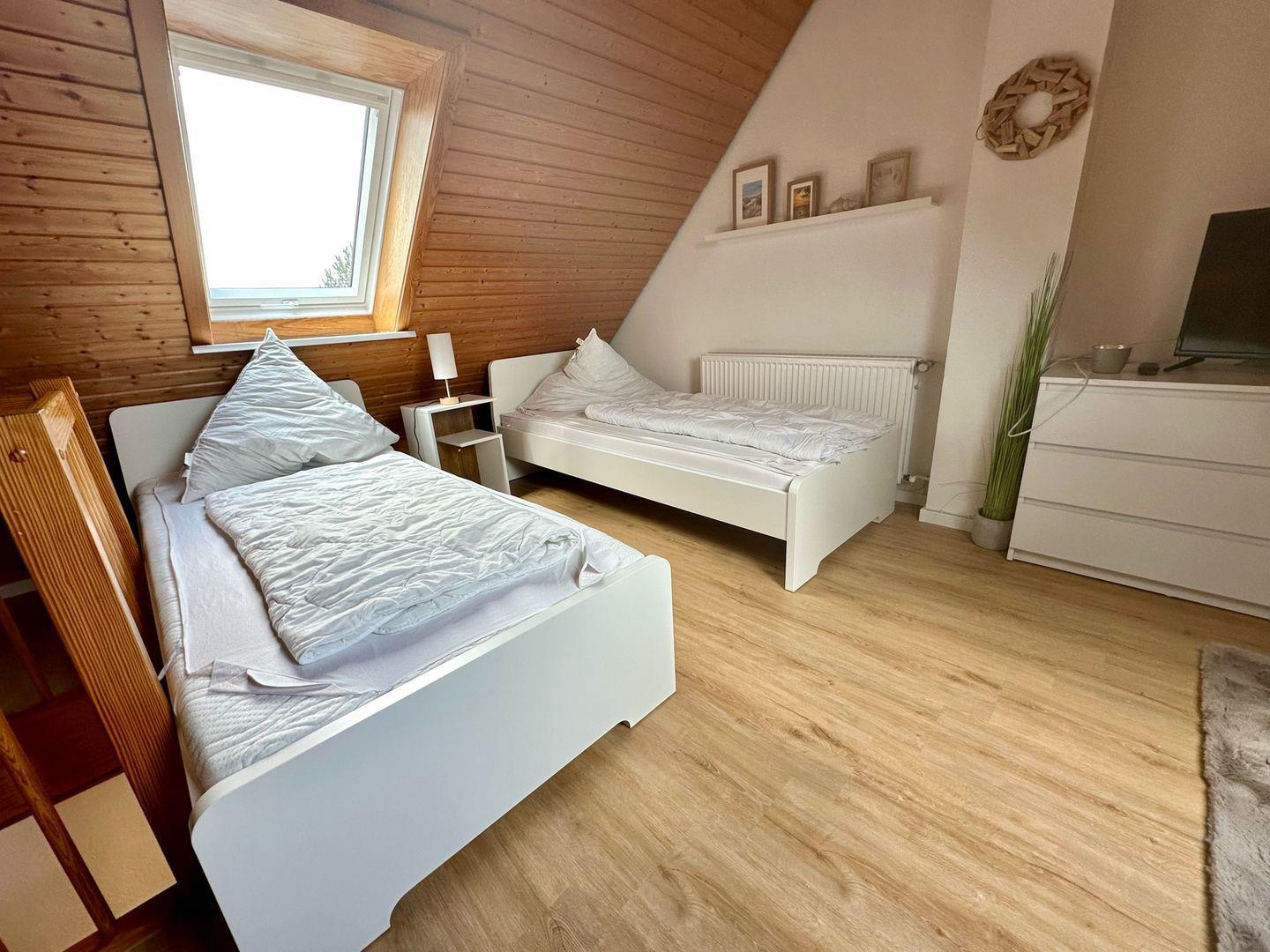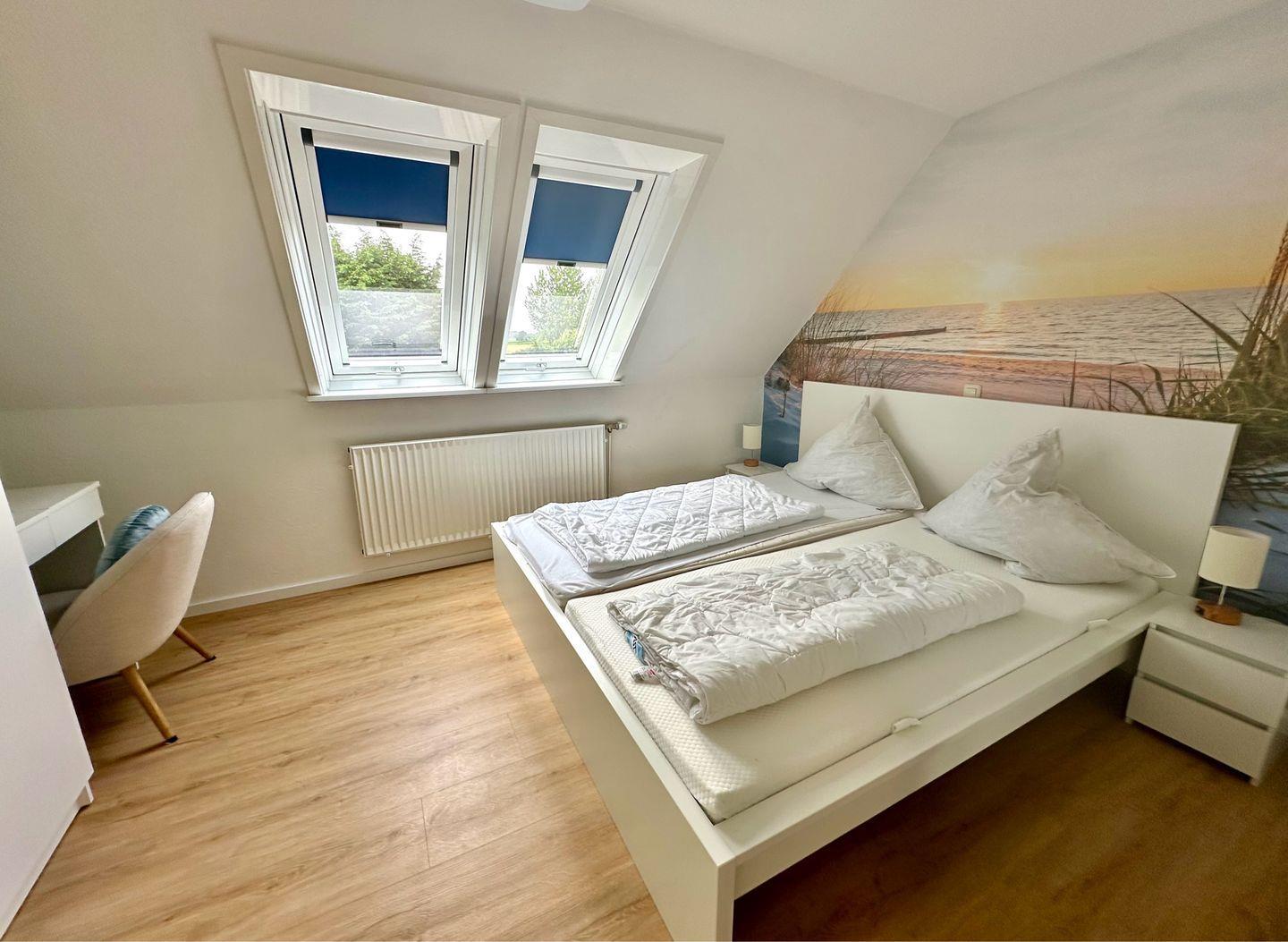 Die Unterkunft verfügt über drei geschmackvoll eingerichtete Schlafzimmer, die sich perfekt für einen angenehmen Schlaf nach einem ereignisreichen Tag am Strand eignen. Das 3. Schlafzimmer mit Fernseher im Dachgeschoss ist über eine offene , schmale Treppe erreichbar. Ein Badezimmer sowie ein Gäste-WC sorgen für zusätzlichen Komfort. Der helle Wohnbereich inklusive eines einladenden Sofas, Sessel und einem Esstisch lädt dazu ein, entspannte Abende zu verbringen. Die technische Ausstattung ist ebenso zufriedenstellend: Ein Fernseher, Radio, Waschmaschine und kostenfreies WLAN stehen zur Verfügung, um auch im Urlaub gut informiert zu bleiben oder die Lieblingsserien zu genießen.