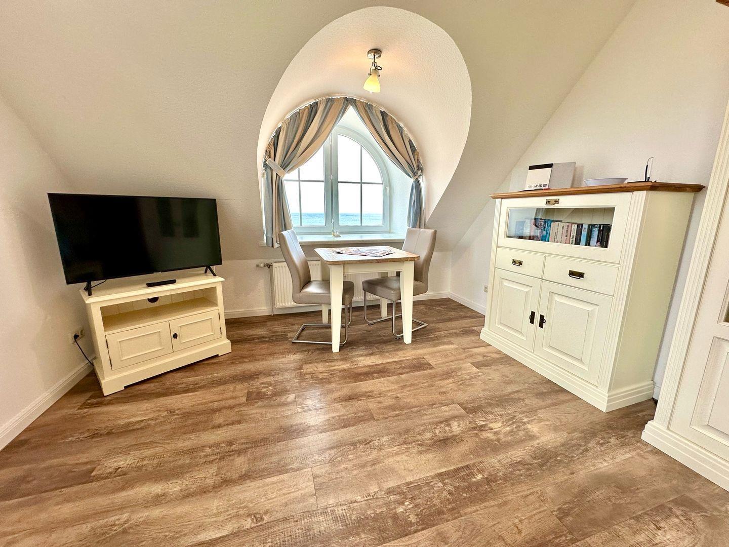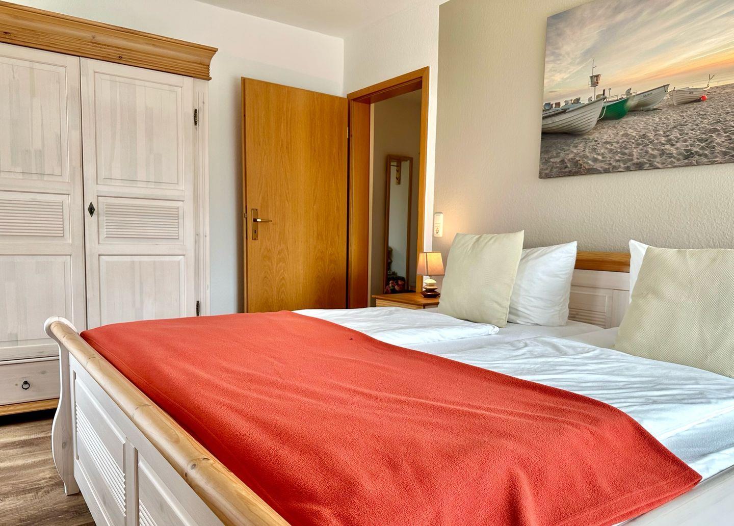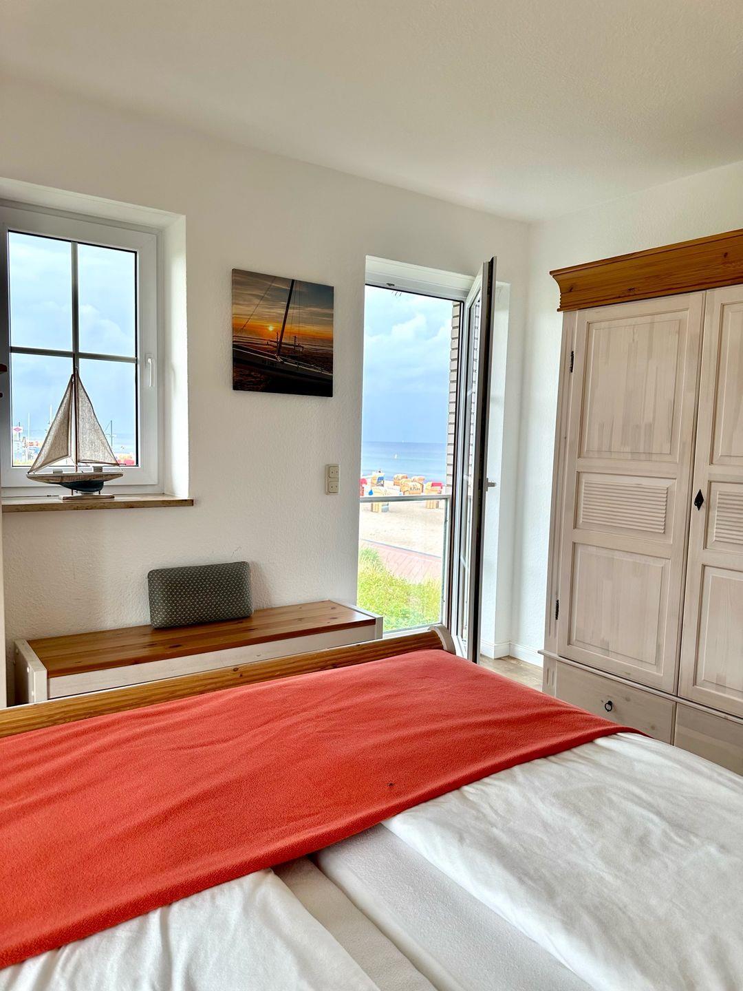 Das Wohnzimmer ist offen gestaltet und bietet durch seine großen Fenster einen herrlichen Panoramablick auf die Ostsee – an klaren Tagen reicht die Sicht sogar bis zur Insel Fehmarn. Der Wohnbereich ist stilvoll mit einem bequemen Ledersofa, einem Esstisch für gemeinsame Mahlzeiten und einem modernen Sat-TV ausgestattet. Das separate Schlafzimmer - ebenfalls mit sensationellem Blick auf die Ostsee - verfügt über ein komfortables Doppelbett, Nachttische, einen geräumigen Kleiderschrank mit Spiegel und einen direkten Zugang zum Balkon zur Westseite, sodass Sie den Tag mit Meeresrauschen beginnen und ausklingen lassen können.