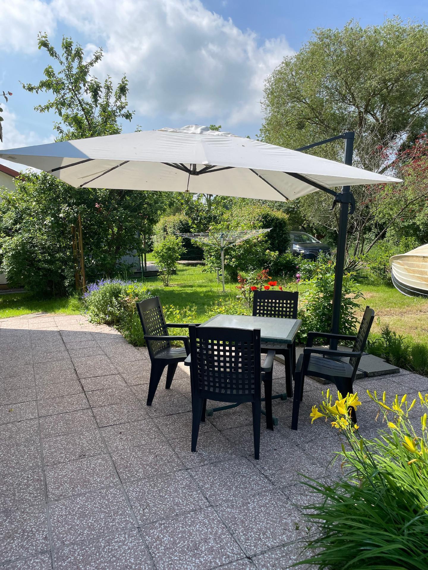 Terrace with garden furniture and parasol.sun loungers are available.charcoal grill is available.rotary dryer
