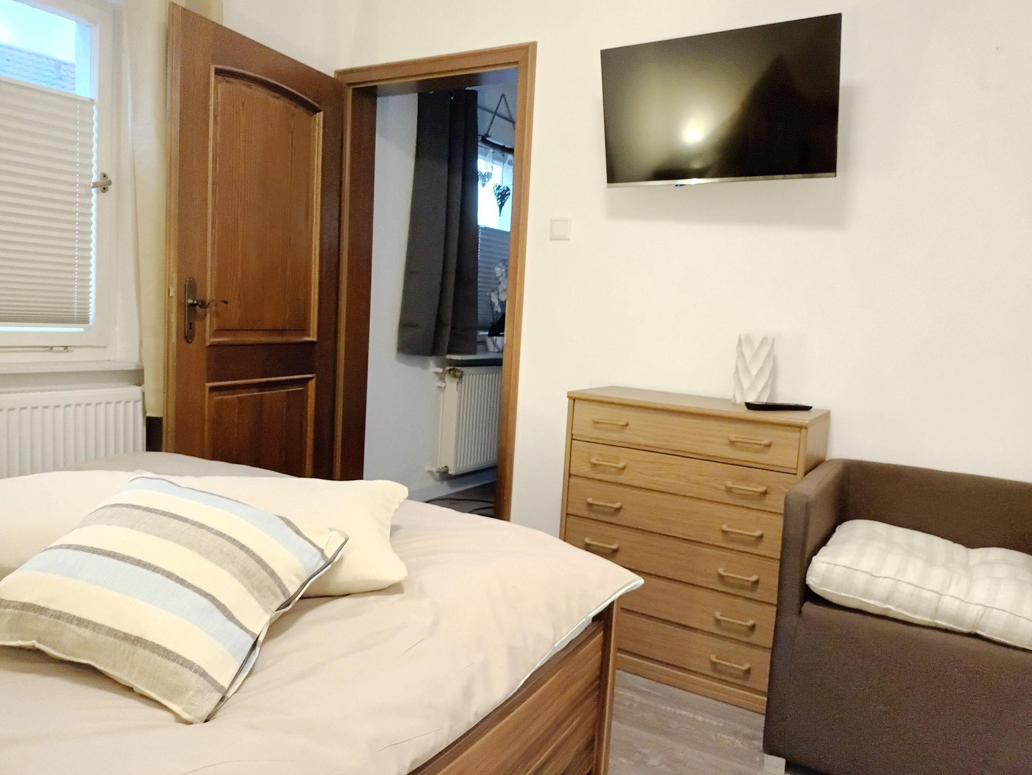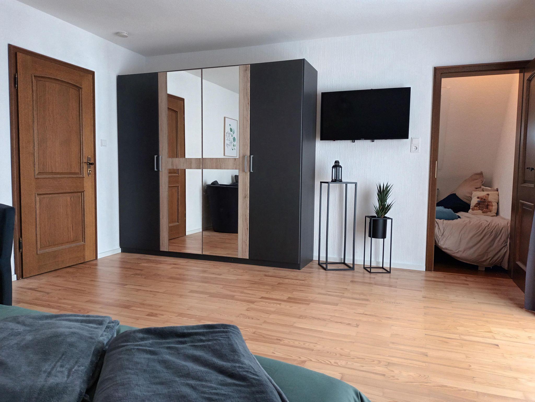 Der Familienbereich Schäfer ist ebenfalls ca 22 qm groß und besteht aus 2 Zimmern. Im 1. Schlafzimmer steht ein Kleiderschrank und ein Doppelbett 180x200cm mit getrennten Matratzen und Bettdecken in Komfortgrößen. Von diesem Zimmer kommt man in einen weiteren Raum, ausgestattet mit einem Bett 140x200cm, Kommode und Flachbild-TV.