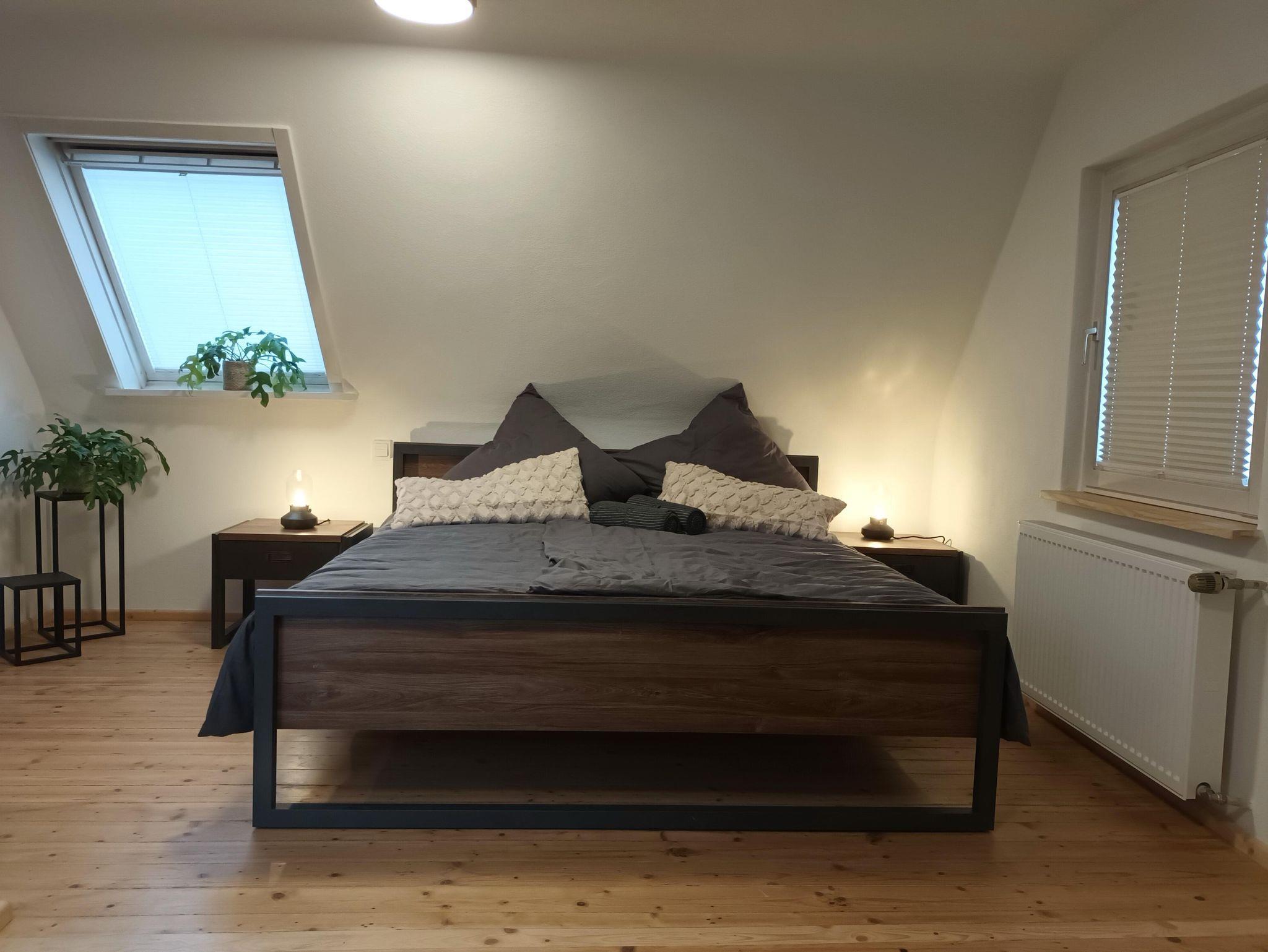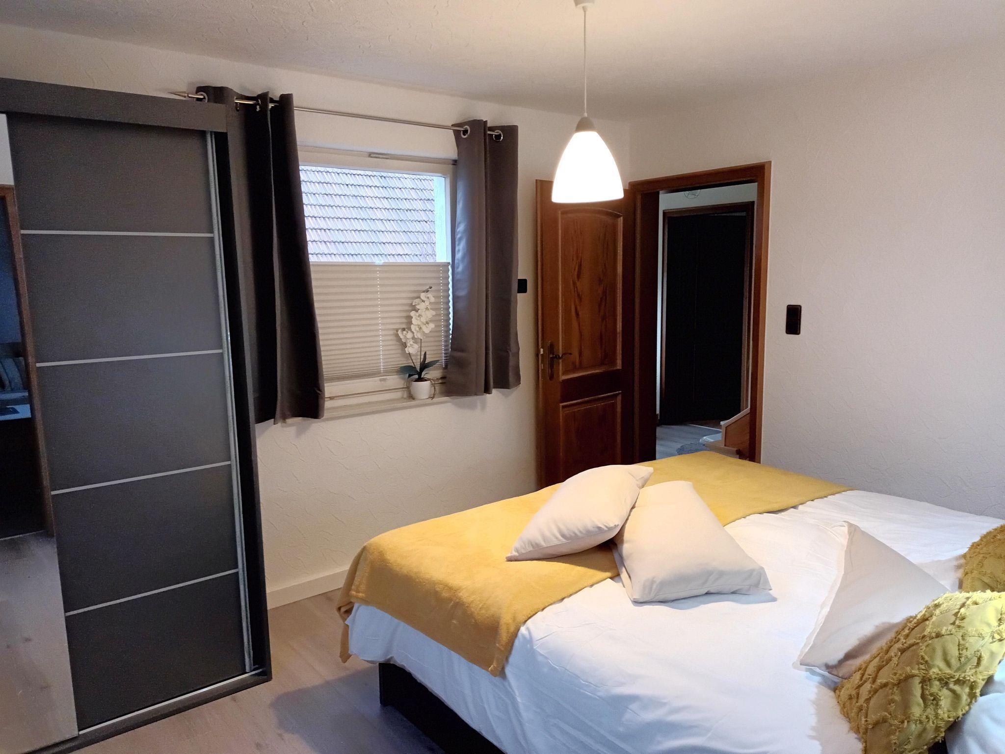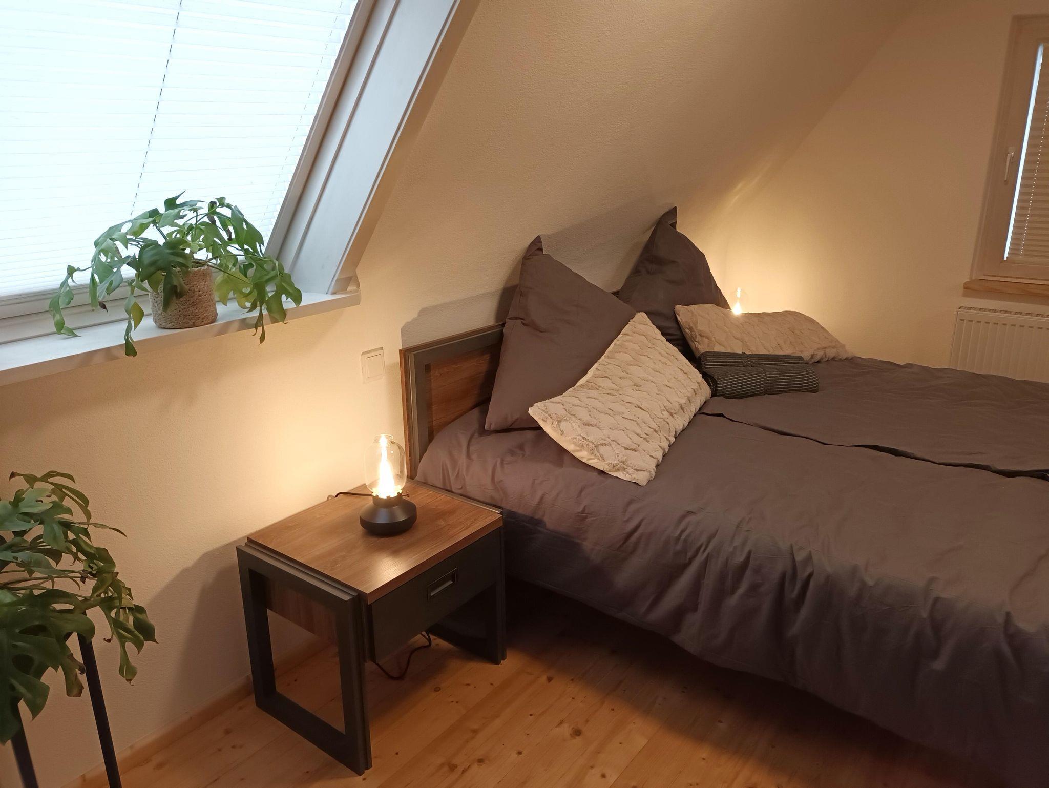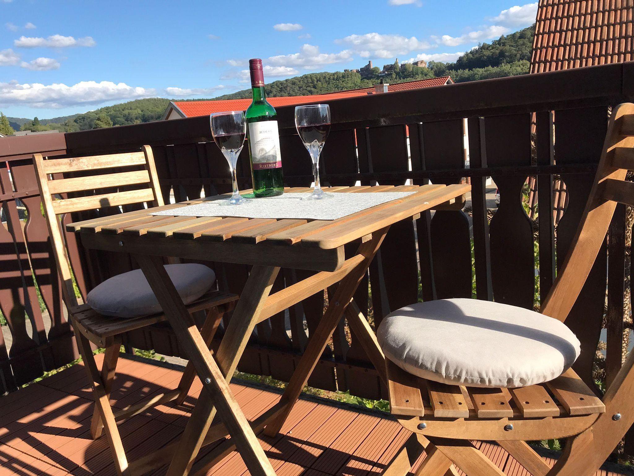 Im Schlafzimmer steht ein Doppelbett 180x200 cm. Getrennte Matratzen, 2 Bettdecken in Komfortgrößen 155x220, inkl. Bettwäsche laden zum Kuscheln ein. Zudem ist das Zimmer ausgestattet mit einem großen Kleiderschrank, 2 Sessel und einem Flachbild-TV. Auf dem Balkon können Sie an einem Tisch mit 2 Stühlen den Ausblick auf den Hochstein und die Burgengruppe Altdahn, die abends beleuchtet ist, genießen.