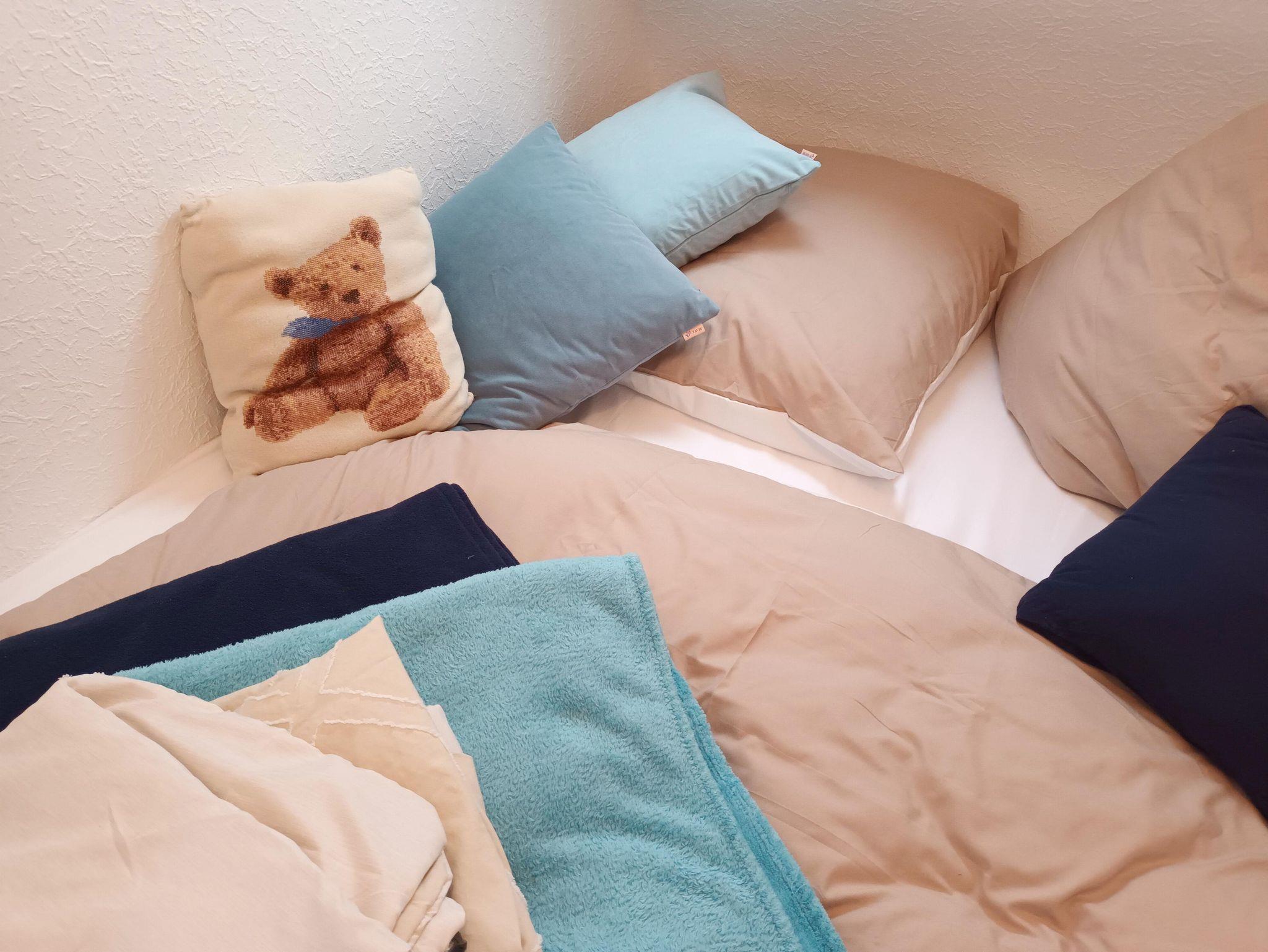 An das Schlafzimmer ist eine Kuschelhöhle angebaut. Ein kleines Zimmer mit Dachfenster, dass ganz mit einer Matratze, 140x180cm, ausgefüllt ist. Eine Schlaf-und Kuschelzone für 1-2 Kinder.