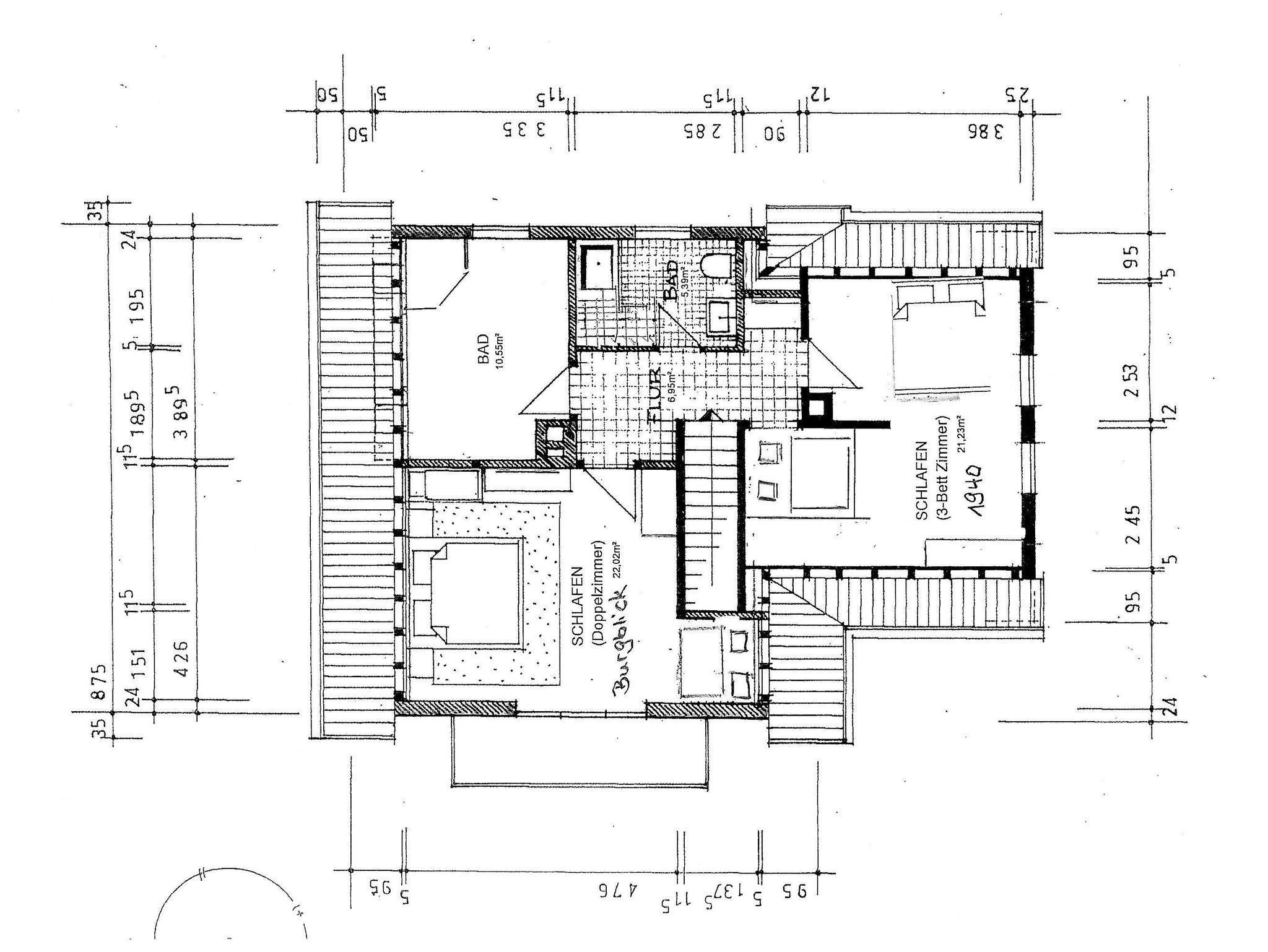 Das Familienzimmer ist ca. 22 qm groß, ausgestattet mit einem Doppelbett 180x200 und einem Boxspringbett 140x200 – wie 1940 schlafen alle in einem Raum. Damals mein Vater mit seinen 8 Geschwistern. Heute bietet das Zimmer viel Platz für 3-4 Personen. Den alten Dielenboden von 1940 haben wir freigelegt. Das Zimmer ist durch 2 Fenster und 2 Dachfenster sehr hell. Einen schönen Ausblick auf Burg Altdahn haben Sie durch das Dachfenster.