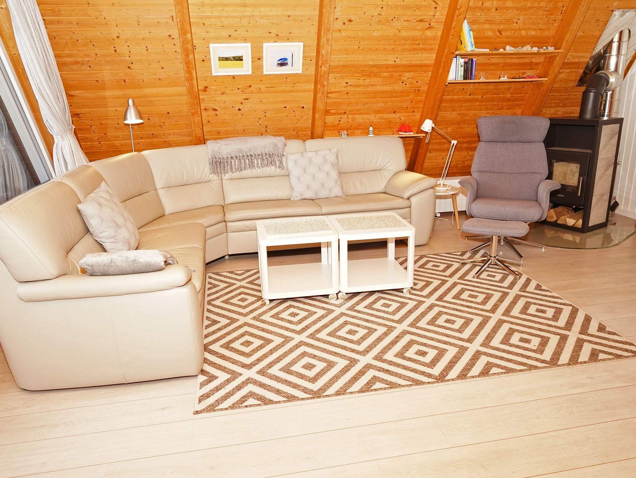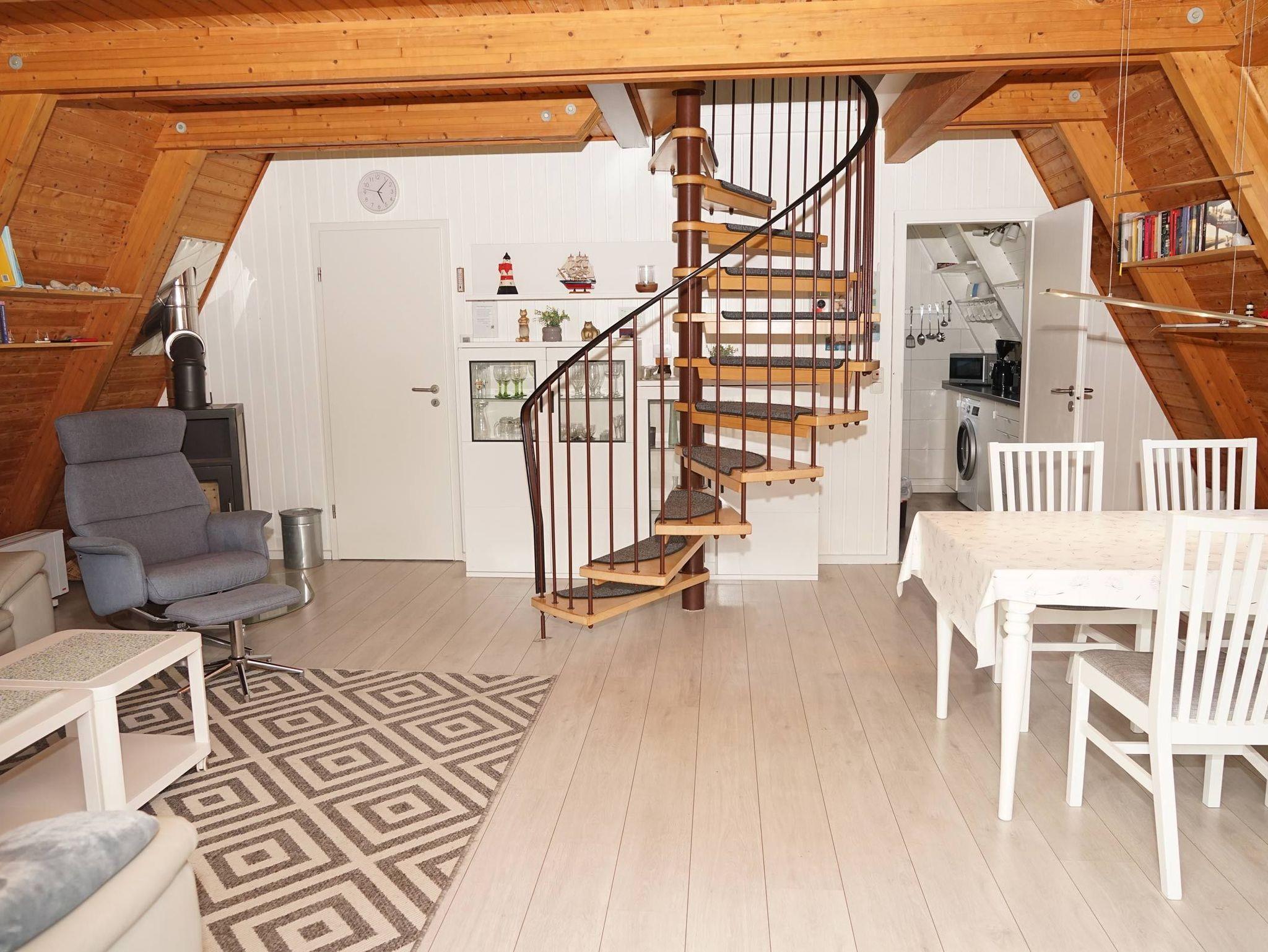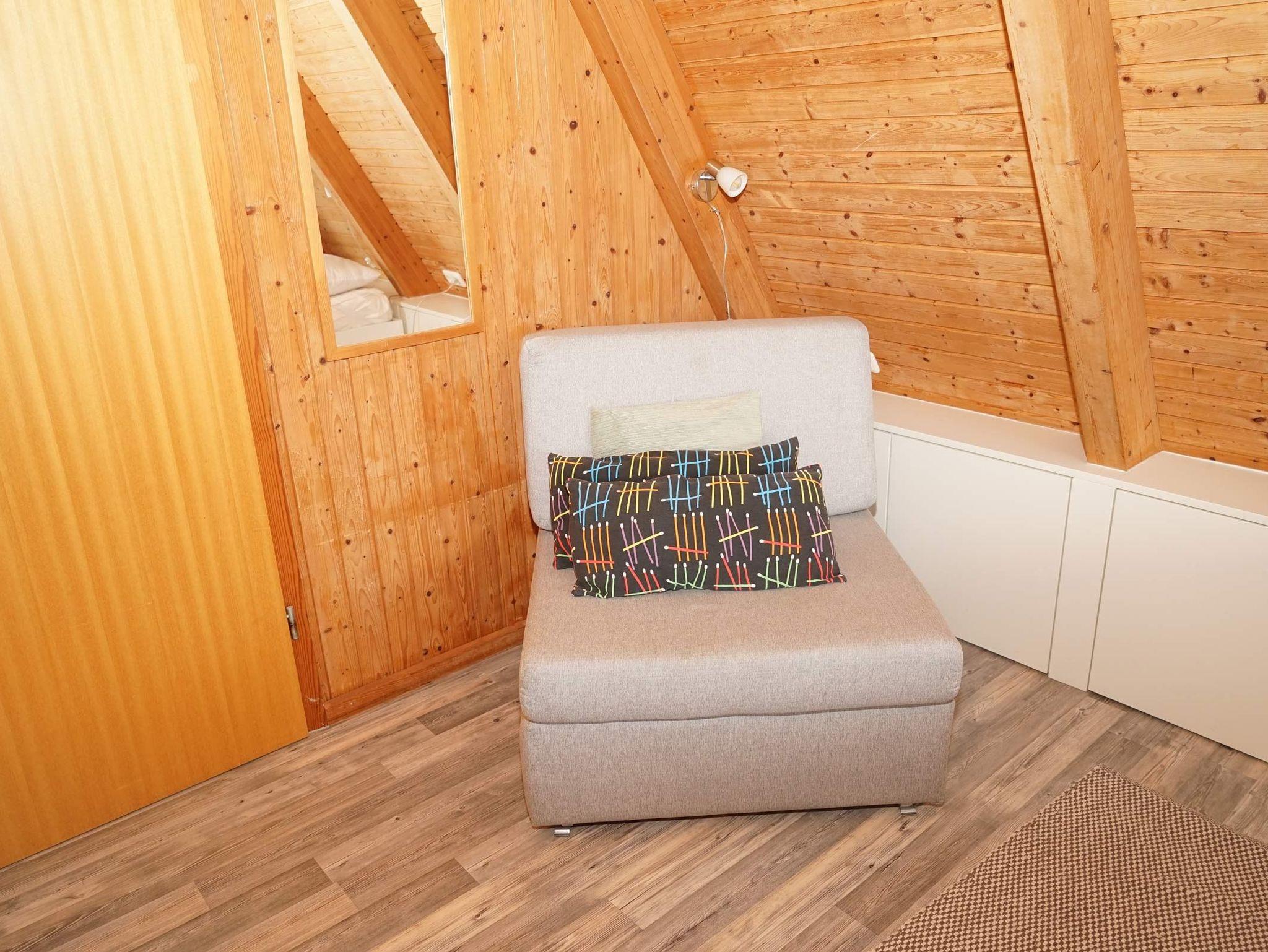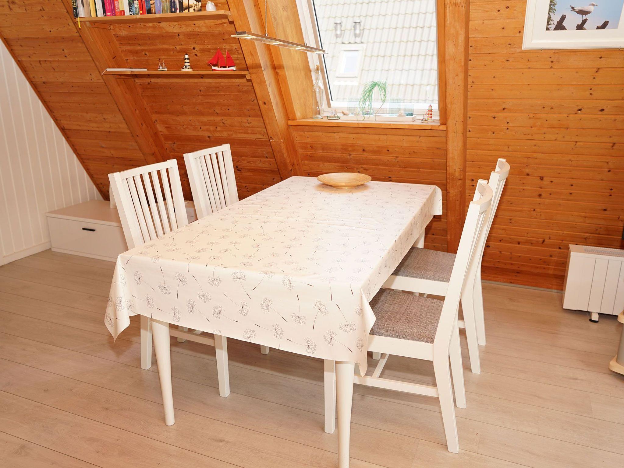 Das Zeltdachhaus verfügt über zwei getrennte Schlafräume (im oberen Bereich des Hauses), kombiniertes Wohn- und Esszimmer, vollwertige Küche und Terrasse. Ein Kinderreisebett und Kinderhochstuhl sind immer vorhanden und kostenlos nutzbar.