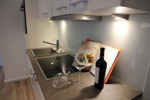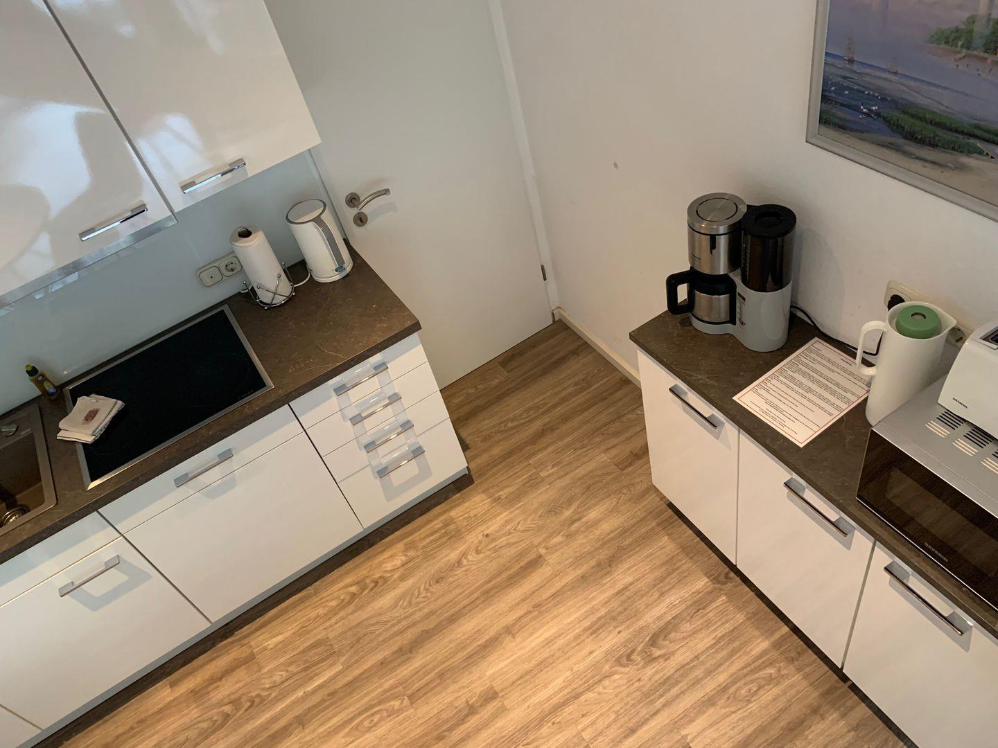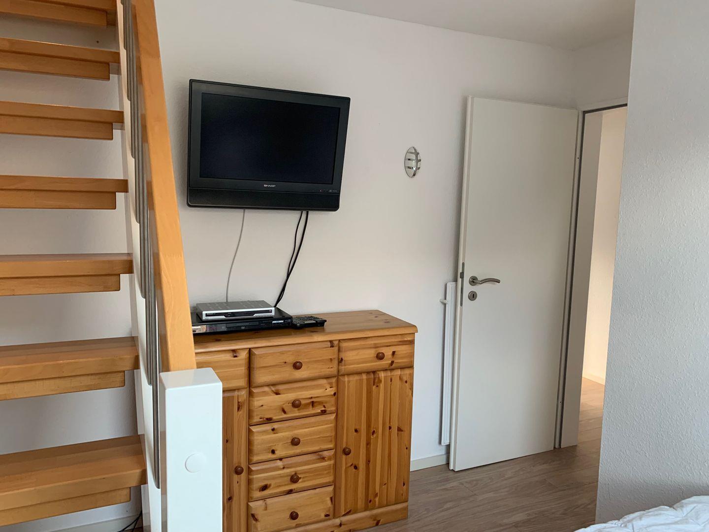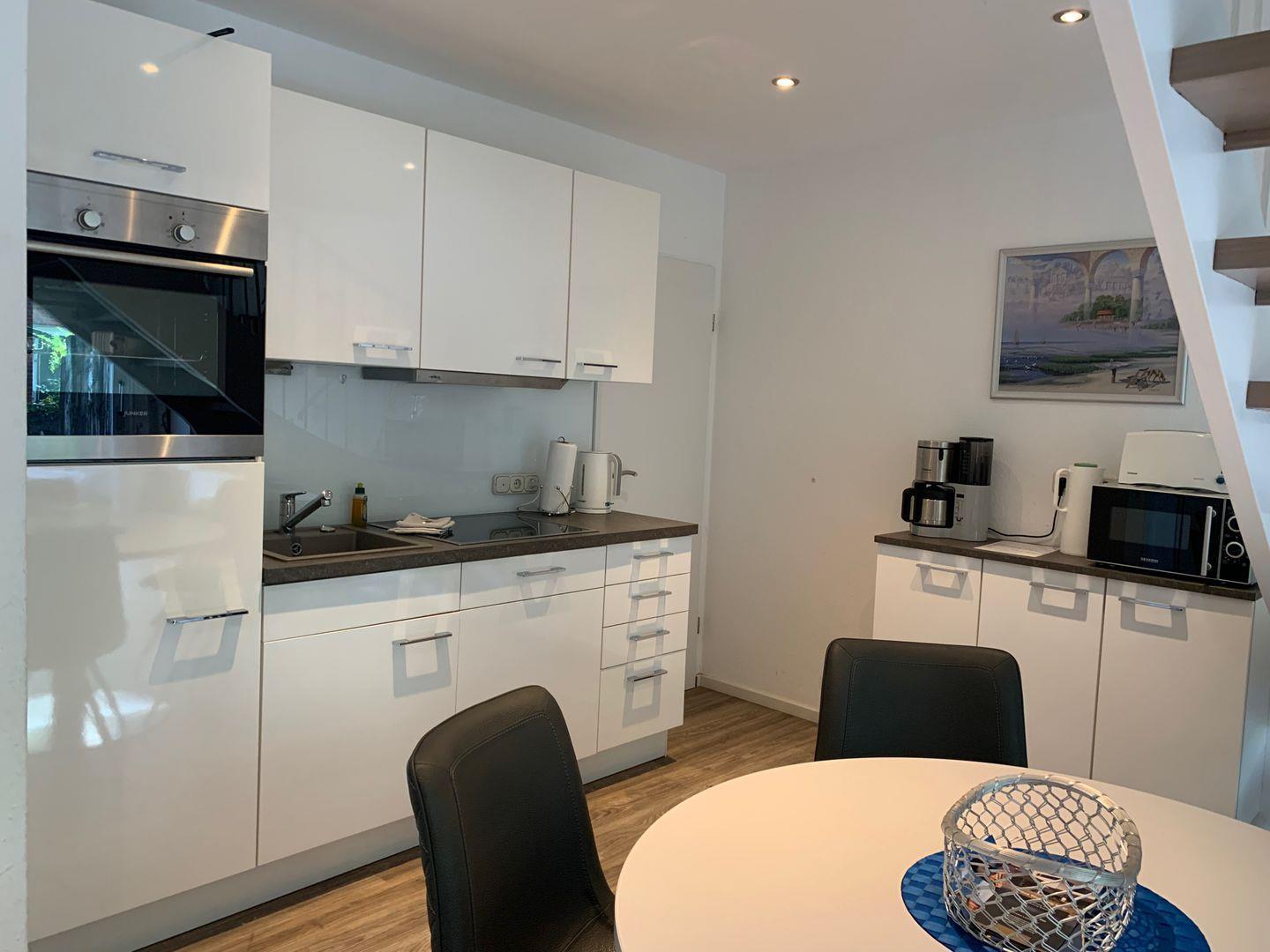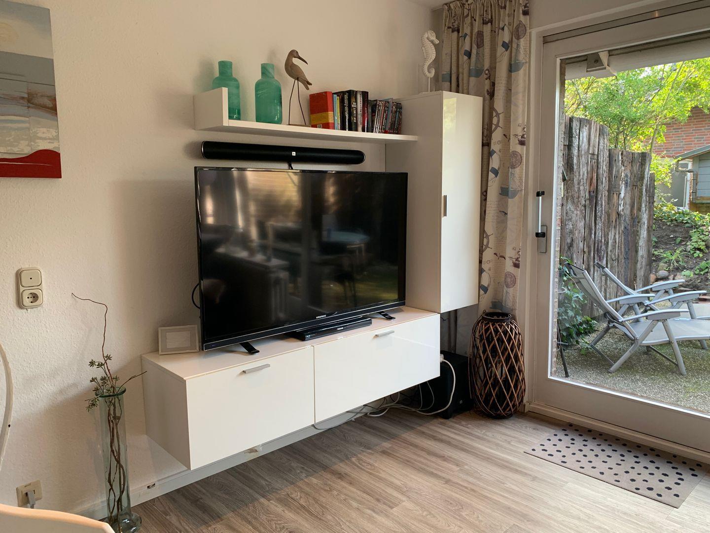 Es erwartet Sie der Eingangsbereich mit Gäste-WC und Garderobe, der Zugang zum großzügigen Wohn-und Essbereich mit einem großen 140 er Flachbildschirm 3D und einer moderne Einbauküche mit Blick und Zugang zur gemütlichen uneinsehbaren und überdachten Süd-Terrasse.