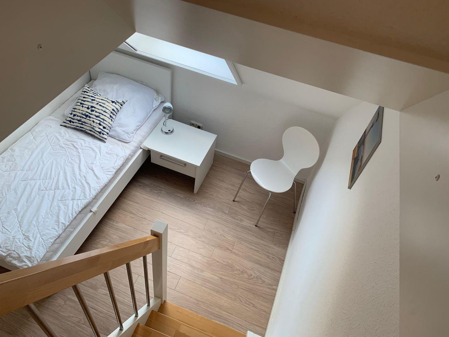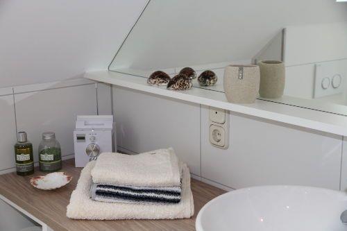 Eine geschwungene Treppe führt in das Obergeschoss. Hier befindet sich das große Schlafzimmer mit (Flatscreen) und Einbauschränken. Besonderen Wert wird auf das Designer-Badezimmer mit Sommerregendusche der besonderen Fliesenkunst gelegt. Ein Fenster ist ebenfalls im Bad vorhanden. Es gibt ein Einzelzimmer mit Einzelbett. Von dort gelangen Sie über eine fest installierte Holztreppe in die ausgebaute Dachgalerie mit 2 Einzelbetten.
