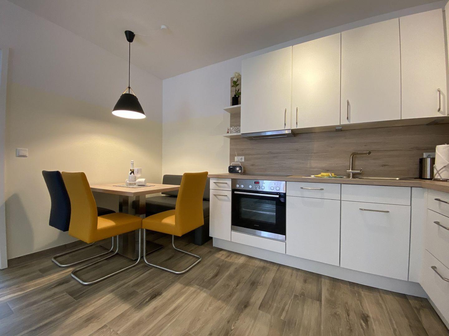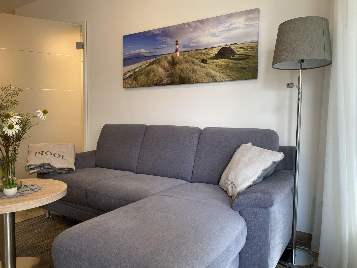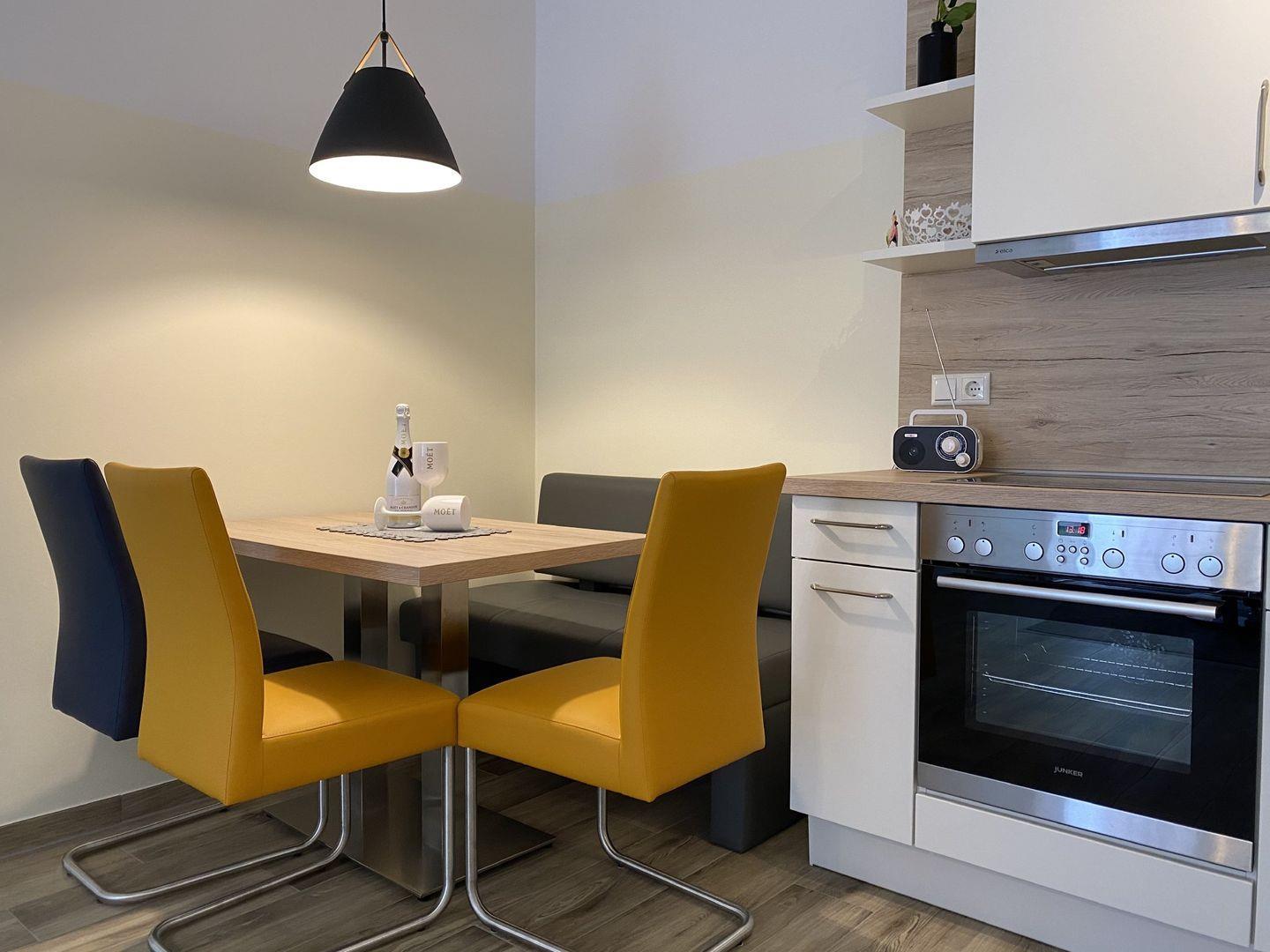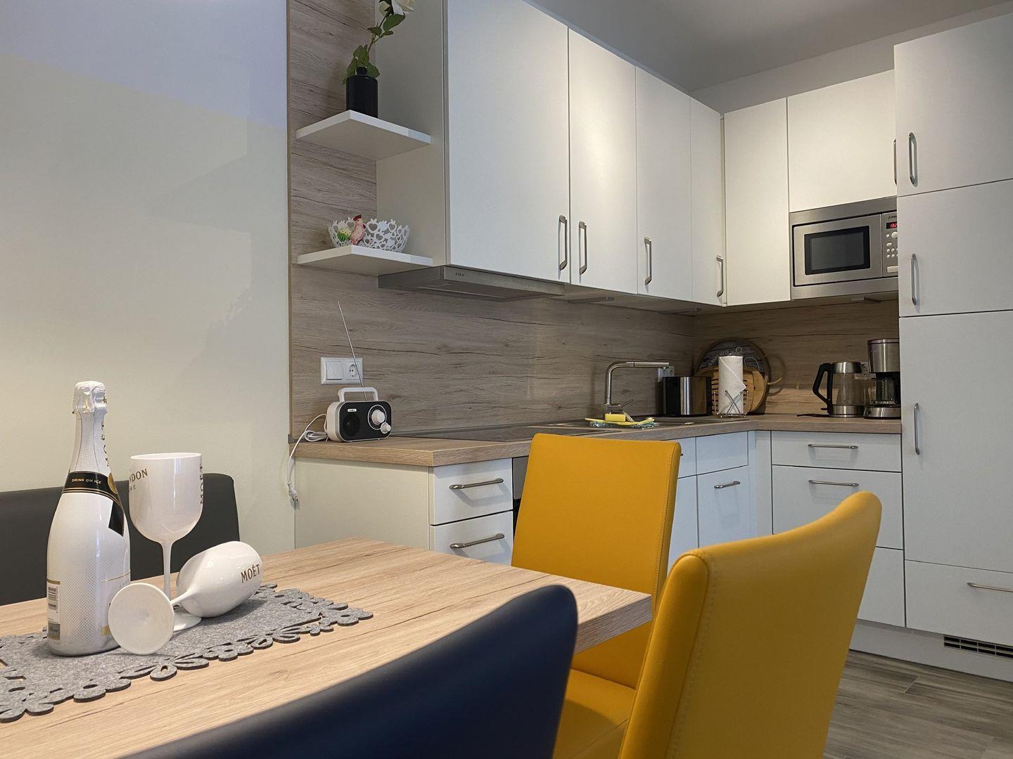 Das Herzstück der Ferienwohnung bildet der einladende Wohnbereich, der mit einem bequemen Sofa, einem Esstisch und einem TV ausgestattet ist. Hier können Sie gemeinsam den Abend ausklingen lassen, während Sie sich über die Erlebnisse des Tages austauschen.