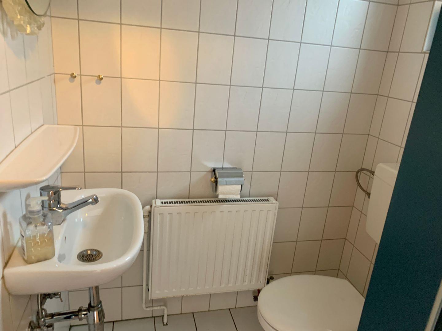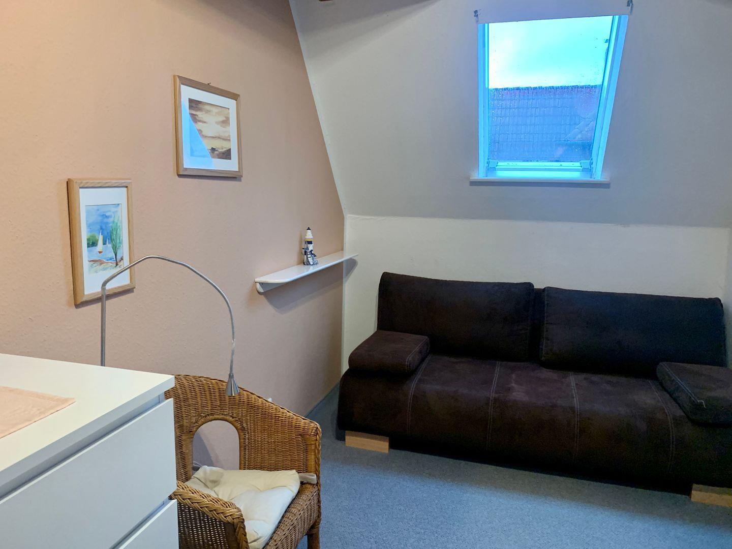 Das helle, durch das Dachfenster lichtdurchflutete Badezimmer, besitzt neben einer Dusche auch eine Waschmaschine, sodass lebendige Ausflüge an den Nordseestrand ohne Bedenken erlebt werden können.