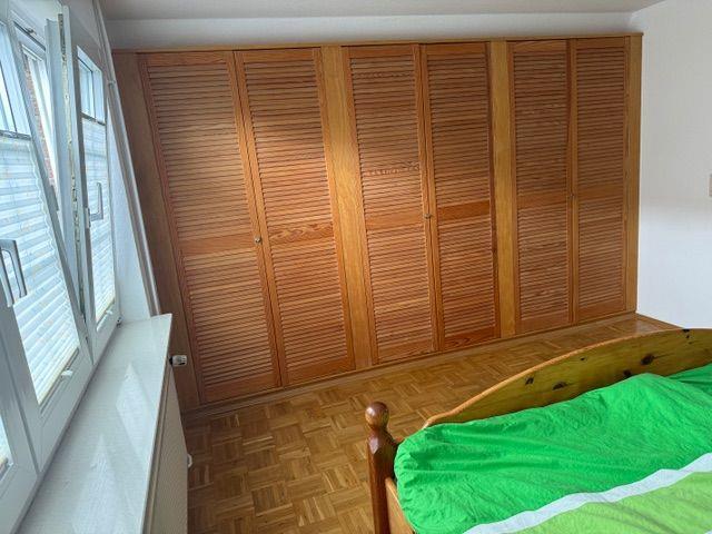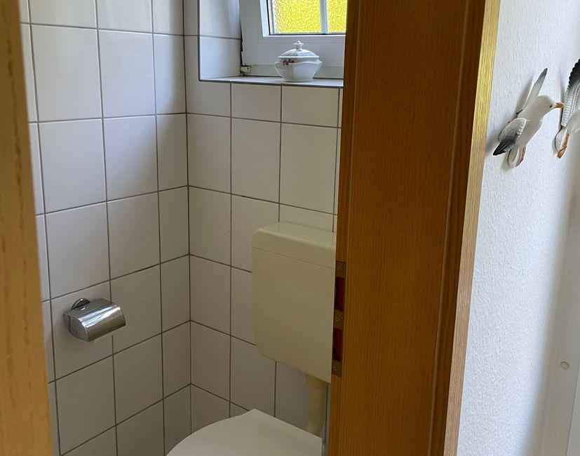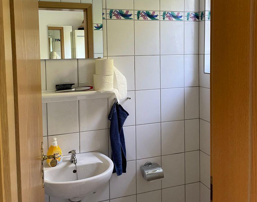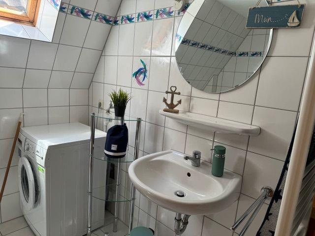 Eine geschlossene Treppe führt in das Obergeschoss. Hier befindet sich das Schlafzimmer mit einem Doppelbett gegenüber ist das kleinere Schlafzimmer mit 1 Einzelbett, auf der gleichen Ebene ist das Duschbad mit Fenster und eine Waschmaschine.
