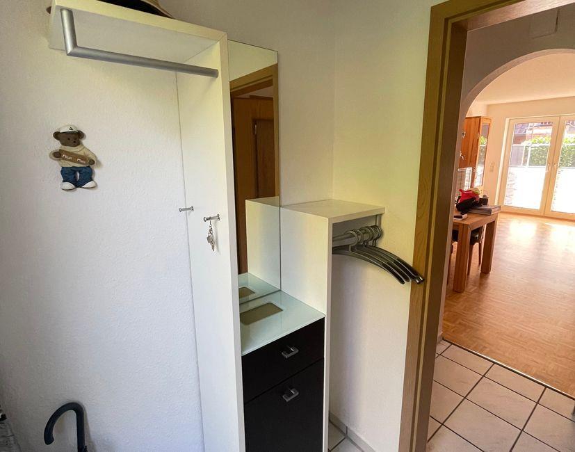 Es erwartet Sie der Eingangsbereich mit Gäste-WC und Garderobe, der Zugang zum großzügigen Wohn-und Essbereich mit einem TV und Blick auf die großzügige Terrasse mit elektrischer Markise. Eine Einbauküche mit allen notwendigsten Utensilien laden zum Kochen ein, ob ein Toast am Morgen und den leckeren Kaffee aus der Filterkaffemaschine oder die Pasta mittags.