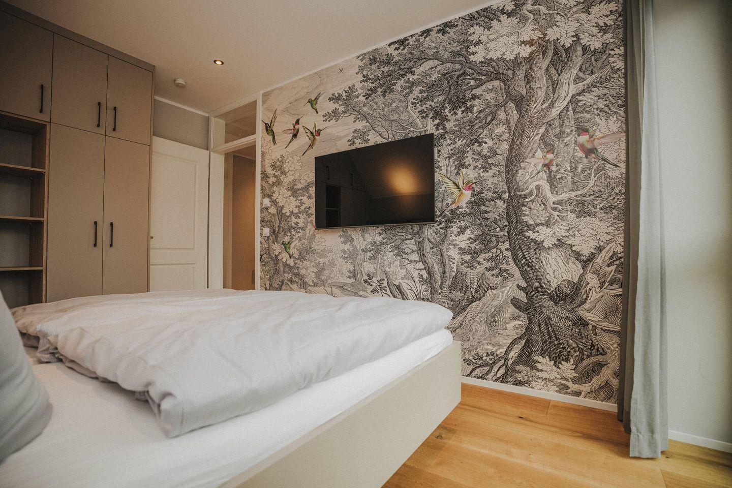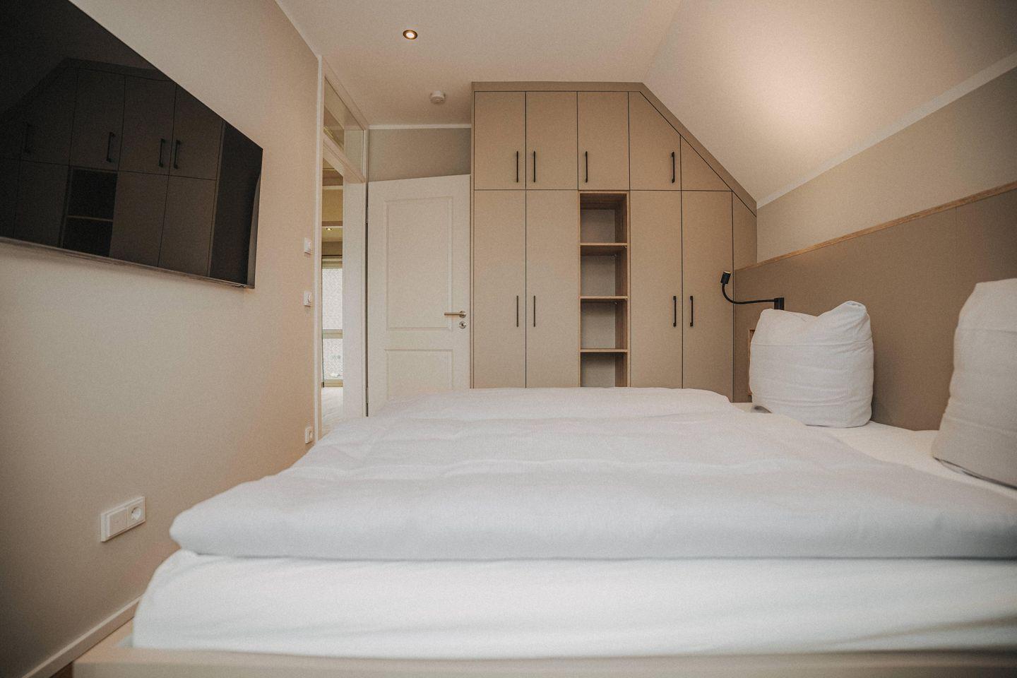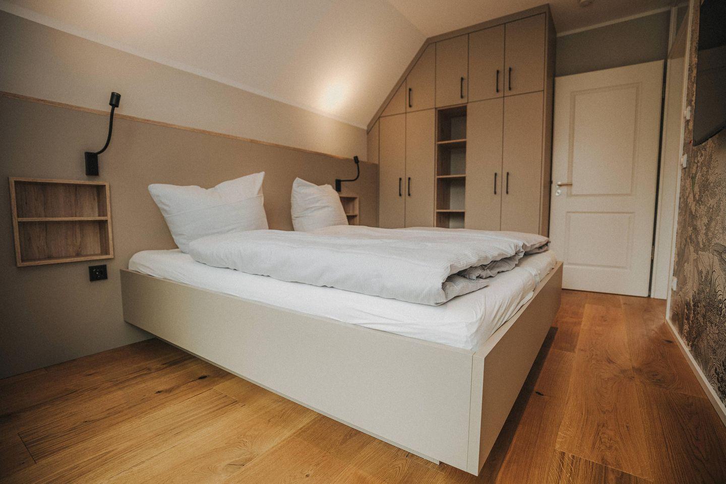 Im Obergeschoss befinden sich drei Schlafzimmer, deren maßgefertigte Einbauschränke viel Stauraum bieten. Zwei Schlafzimmer sind mit ebenfalls maßgefertigten hochwertigen Doppelbetten (1,80 m x 2,00 m) ausgestattet. In den beiden Zimmern befindet sich ebenfalls ein LED-TV. Das vom Schreiner angefertigte zweigeschossige Hochbett im dritten Schlafzimmer bietet ausreichend Platz für kleine und große Gäste.