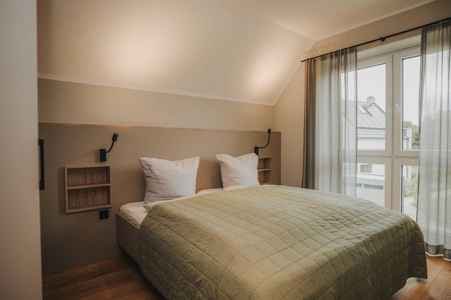 Schlafzimmer 1: Doppelbett (Maße: 180 x 200 cm / 2 Einzelmatratzen 90 x 200 cm), Nachttische, Leselampen, Kleiderschrank, Smart-TV, Verdunklungsmöglichkeit