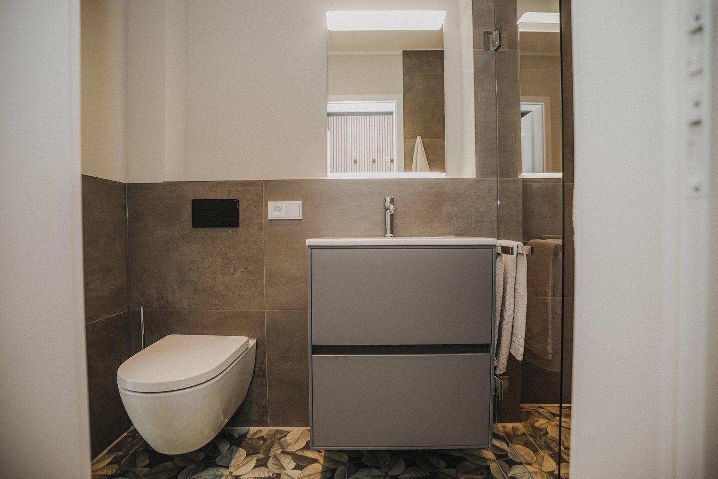 Das Bad im Eingangsbereich verfügt auch über eine großzügige Dusche und im Hauswirtschaftsraum befinden sich Waschmaschine und Trockner, damit Sie sich im Urlaub um nichts sorgen müssen.