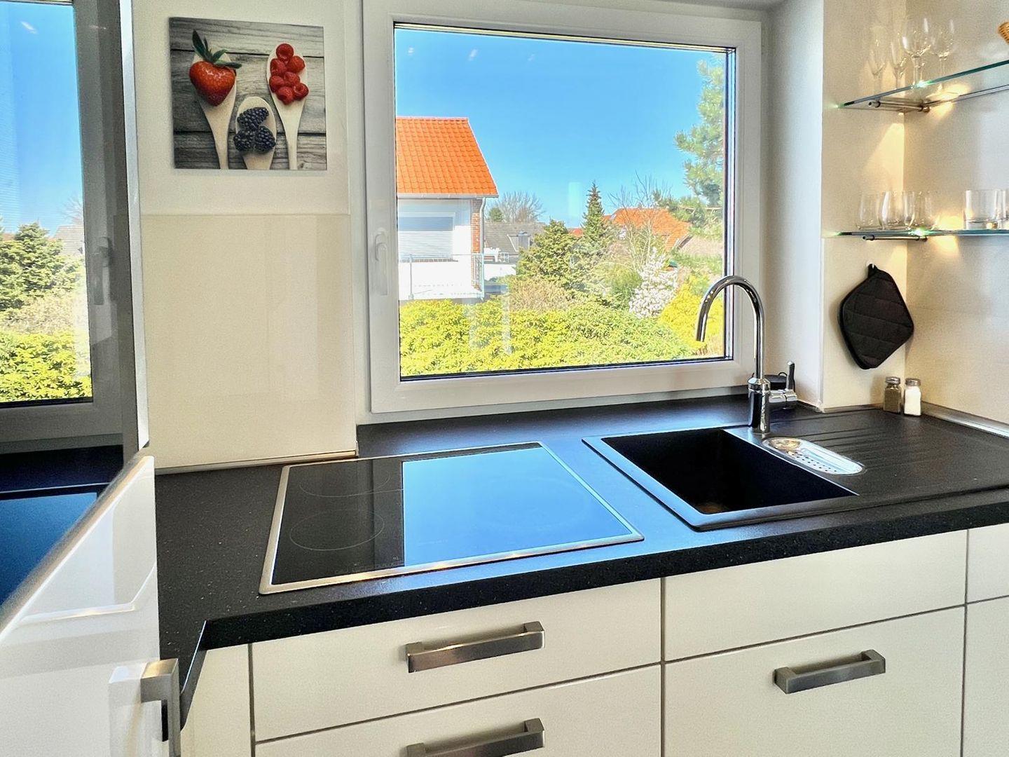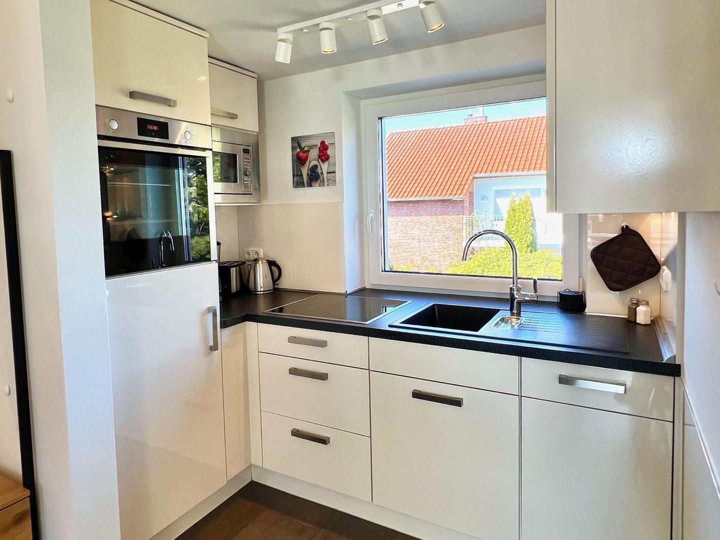 Die voll ausgestattete Küche lässt keine Wünsche offen: Sie ist mit einem Cerankochfeld, einem Backofen, einer Spülmaschine und einem Kühlschrank mit Gefrierfach ausgestattet. Auch eine Mikrowelle, ein Wasserkocher, ein Toaster und eine Kaffeemaschine stehen Ihnen zur Verfügung. Geschirr und Besteck sind ebenfalls vorhanden, sodass Sie sich hier wie zu Hause fühlen können.