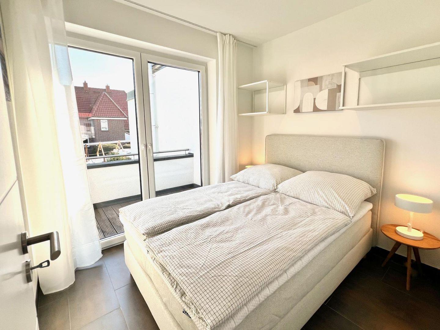 Im ersten Schlafzimmer steht ein Boxspringbett in der Größe 180 x 200 cm (1 Matratze 180x200 cm). Ein großer Kleiderschrank bietet viel Stauraum für Ihre Kleidung.