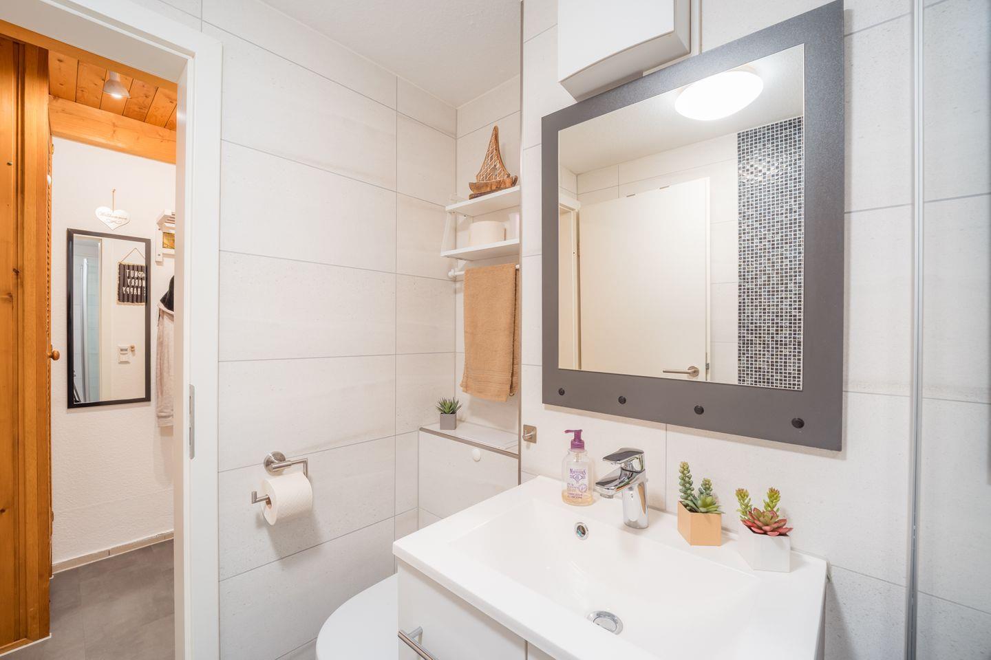 Das Badezimmer ist mit einer bodengleichen Dusche, WC, Waschbecken und Spiegel modern und funktional ausgestattet.