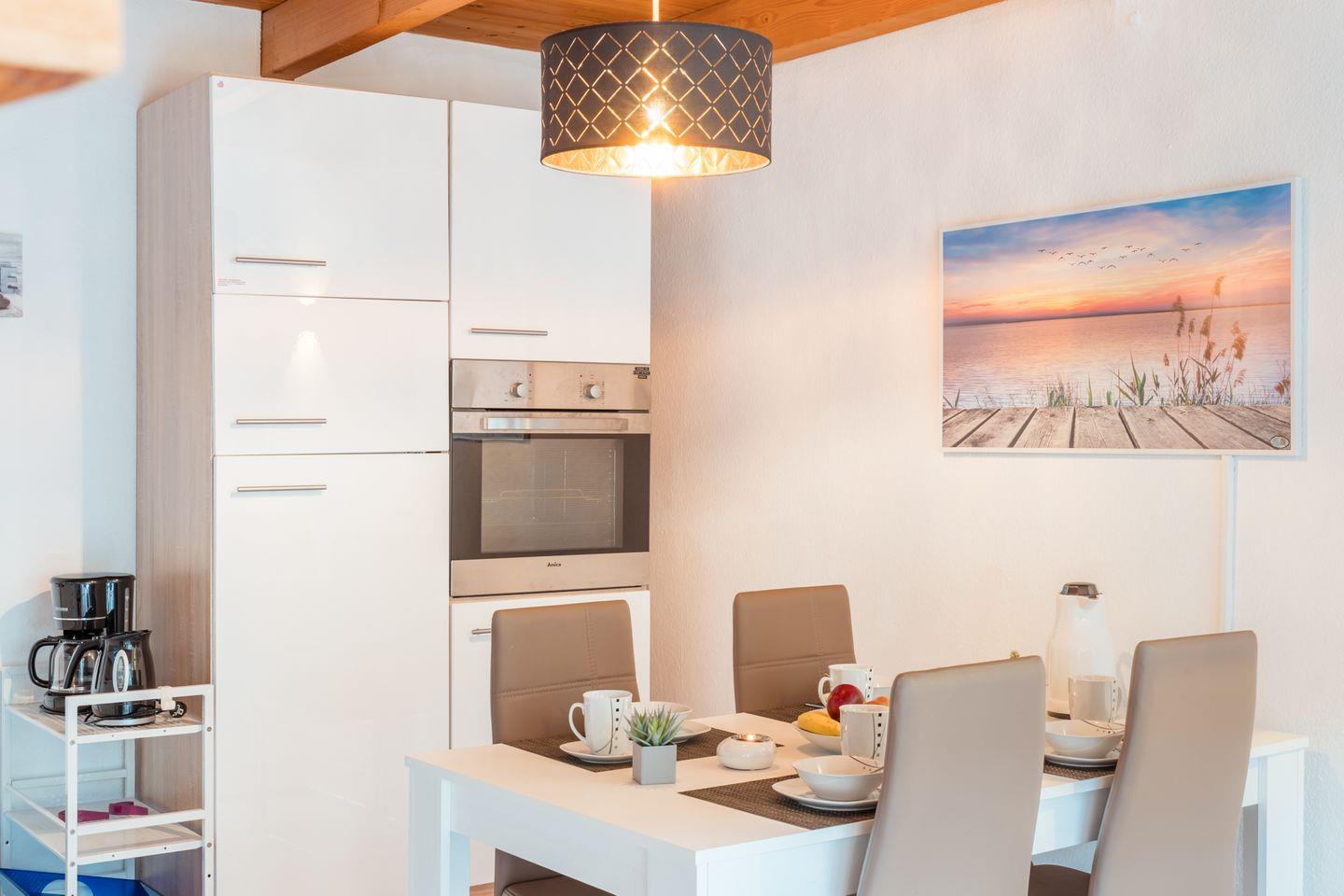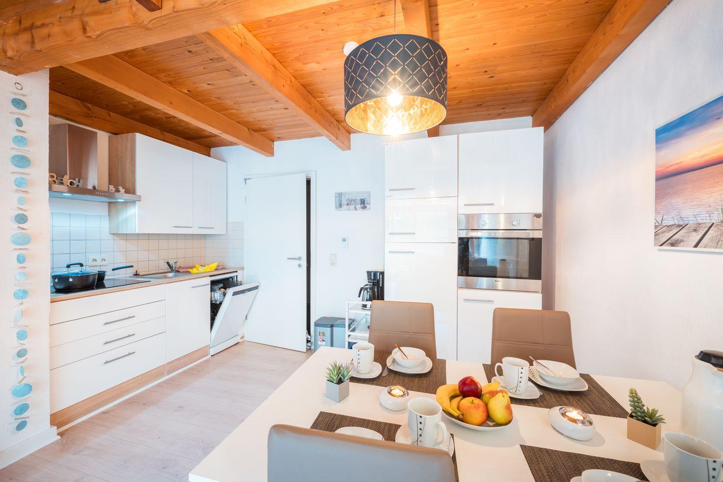 Die Küche ist zum Wohnzimmer hin offen und besticht durch ein umfangreiches Angebot an modernen Geräten. Dazu gehören eine Kühl-Gefrierkombination, ein Ceranherd mit Elektro-Backofen, eine Mikrowelle, eine Kaffeemaschine sowie eine Tassimo-Espressomaschine. Geschirrspüler, Toaster, Wasserkocher und alle nötigen Küchenutensilien sind vorhanden, damit Sie problemlos auch während des Urlaubs Ihre Lieblingsspeisen zubereiten können.