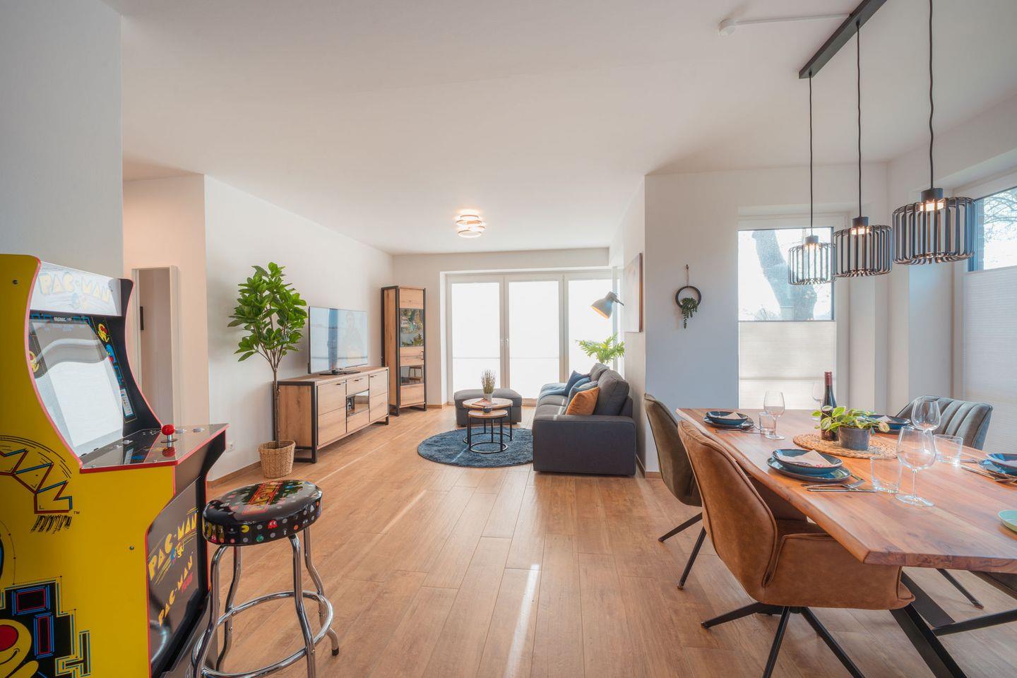 Der Außenbereich lädt mit einer eigenen Terrasse, Gartenmöbeln und einer Liegewiese zum Entspannen ein. Der Privatparkplatz direkt am Haus bietet Bequemlichkeit bei der Anreise. Die Unterkunft ist rollstuhlfreundlich gestaltet und bietet somit auch für Gäste mit eingeschränkter Mobilität angenehme Bedingungen.