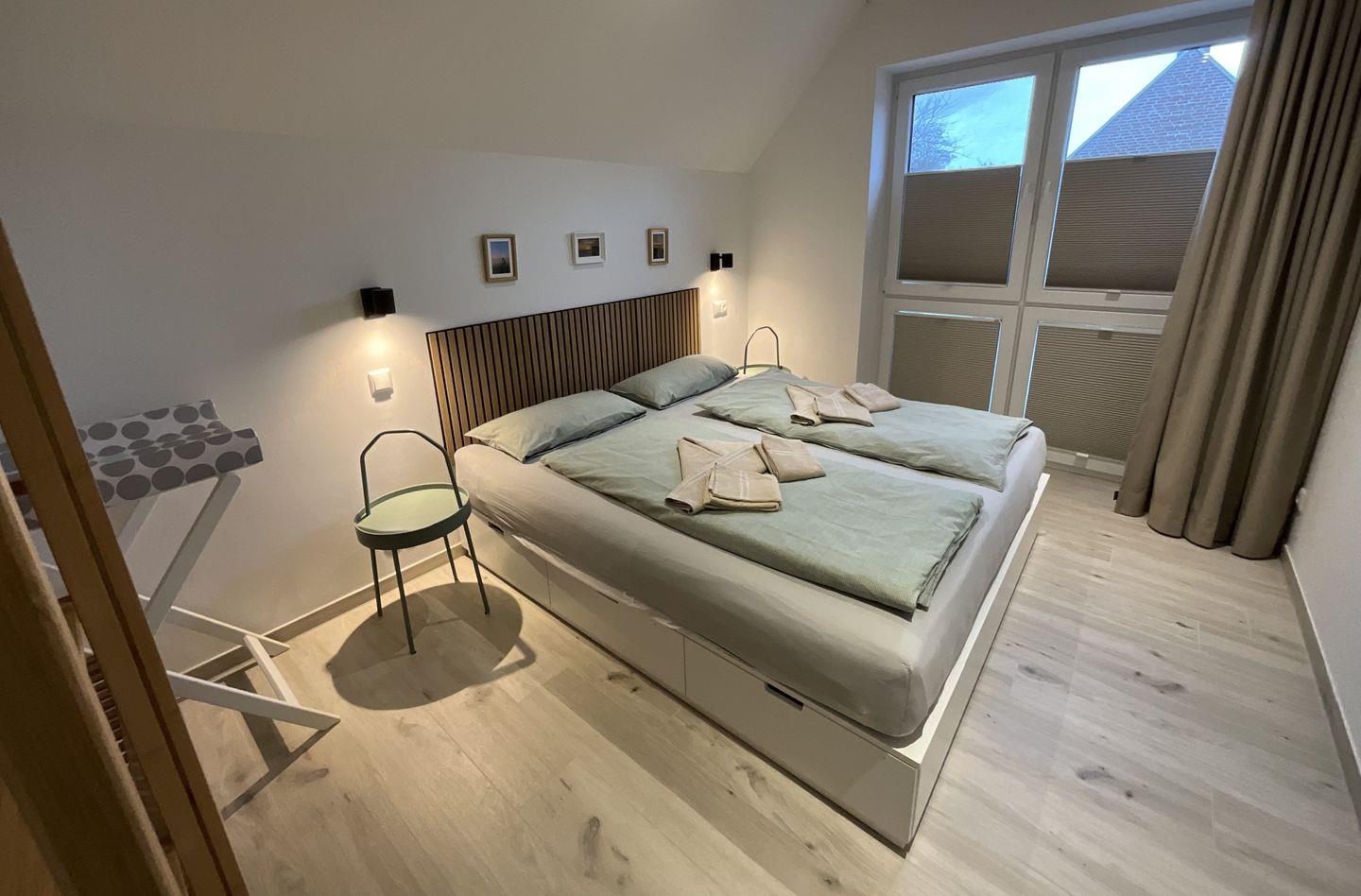 Schlafzimmer 2: Doppelbett (Maße: 180 x 200 cm, eine durchgängige Matratze), Nachttische, offener Kleiderschrank / Regal , Plissees, Verdunkelungsvorhänge