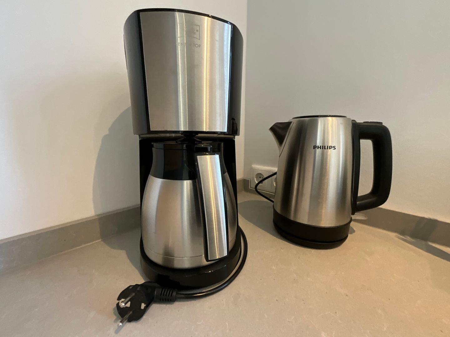 Die modern ausgestattete, offene Küche ist zum Wohnzimmer hin gestaltet und mit einem Ceranherd, Elektro-Backofen, Kühlschrank mit integriertem Gefrierfach, Spülmaschine, Wasserkocher, Toaster, Kaffeefiltermaschine und Nespresso-Espressomaschine ausgestattet. Geschirr, Besteck und alle notwendigen Küchenutensilien sind vorhanden.