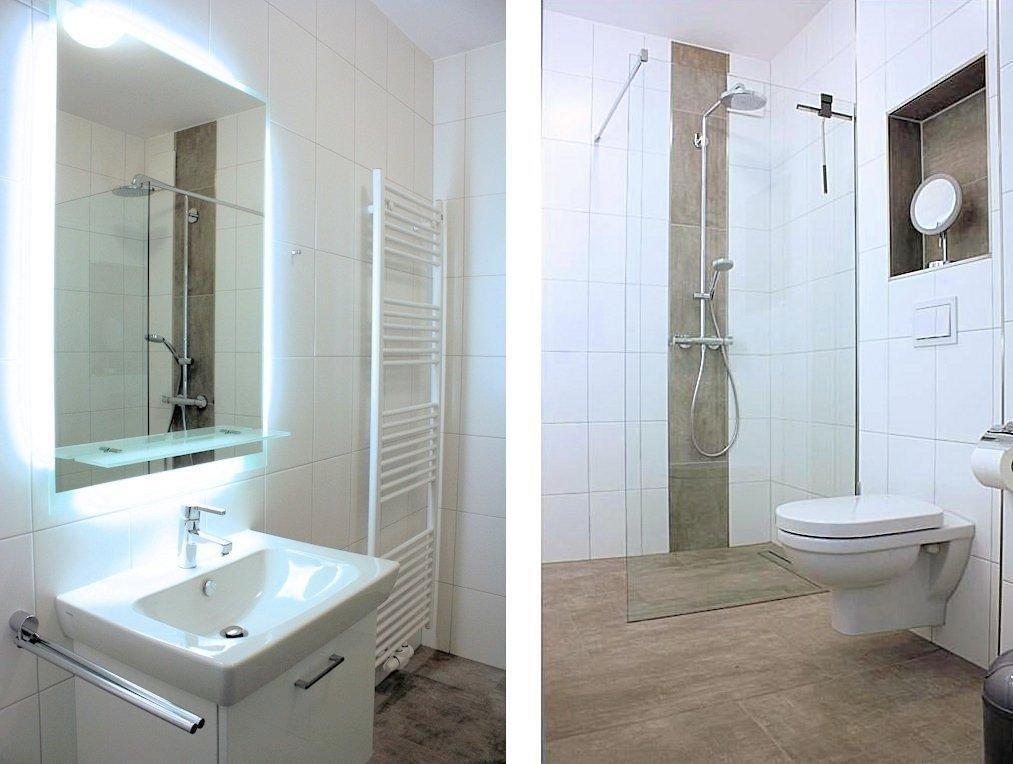 Beide Bäder verfügen über eine großzügige Dusche, WC und Waschbecken. Das große Bad ist dem östlichen Schlafzimmer angeschlossen. Es bietet außerdem eine komfortable Badewanne. Zu jedem Bad gehören je ein Föhn und ein beleuchteter Kosmetikspiegel.