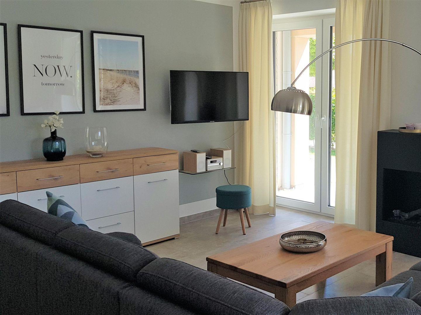 Wohnzimmer: Eckcoach mit Schlaffunktion für max. 2 Personen, Kamin (elektrisch, mit moderner Opti-Myst-Technik), SAT-TV deutschsprachig, HiFi-Anlage