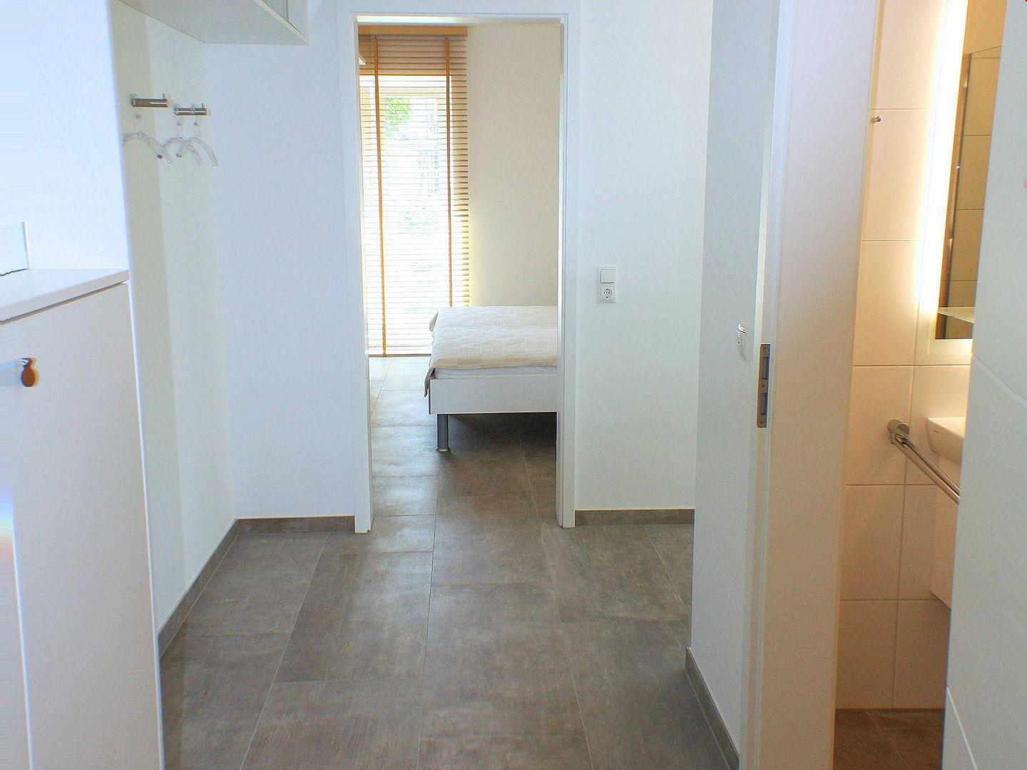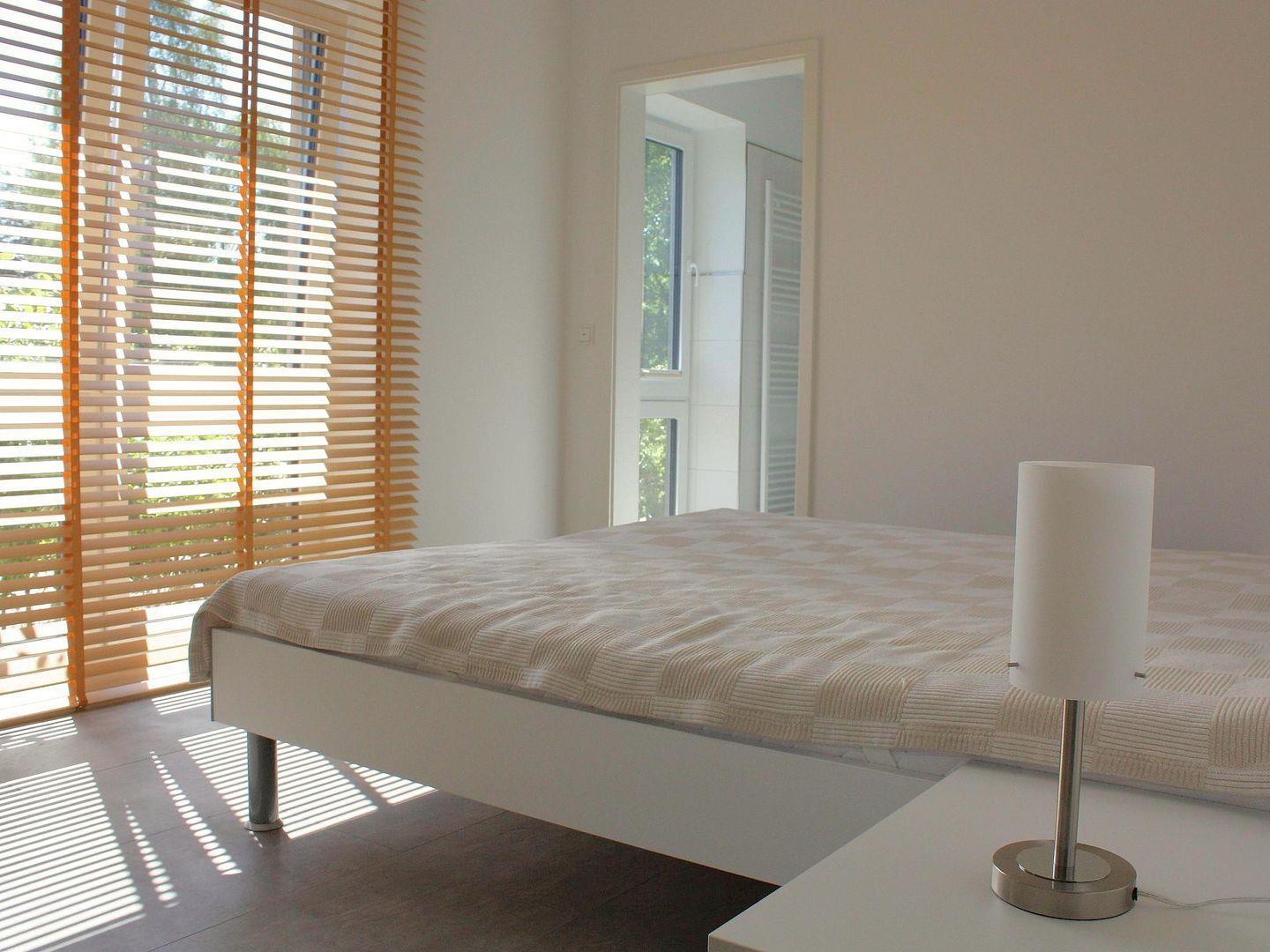 Schlafzimmer Ost: Doppelbett (Maße: 180 x 200 cm) mit 2 Einzelmatratzen, angeschlossenes Bad