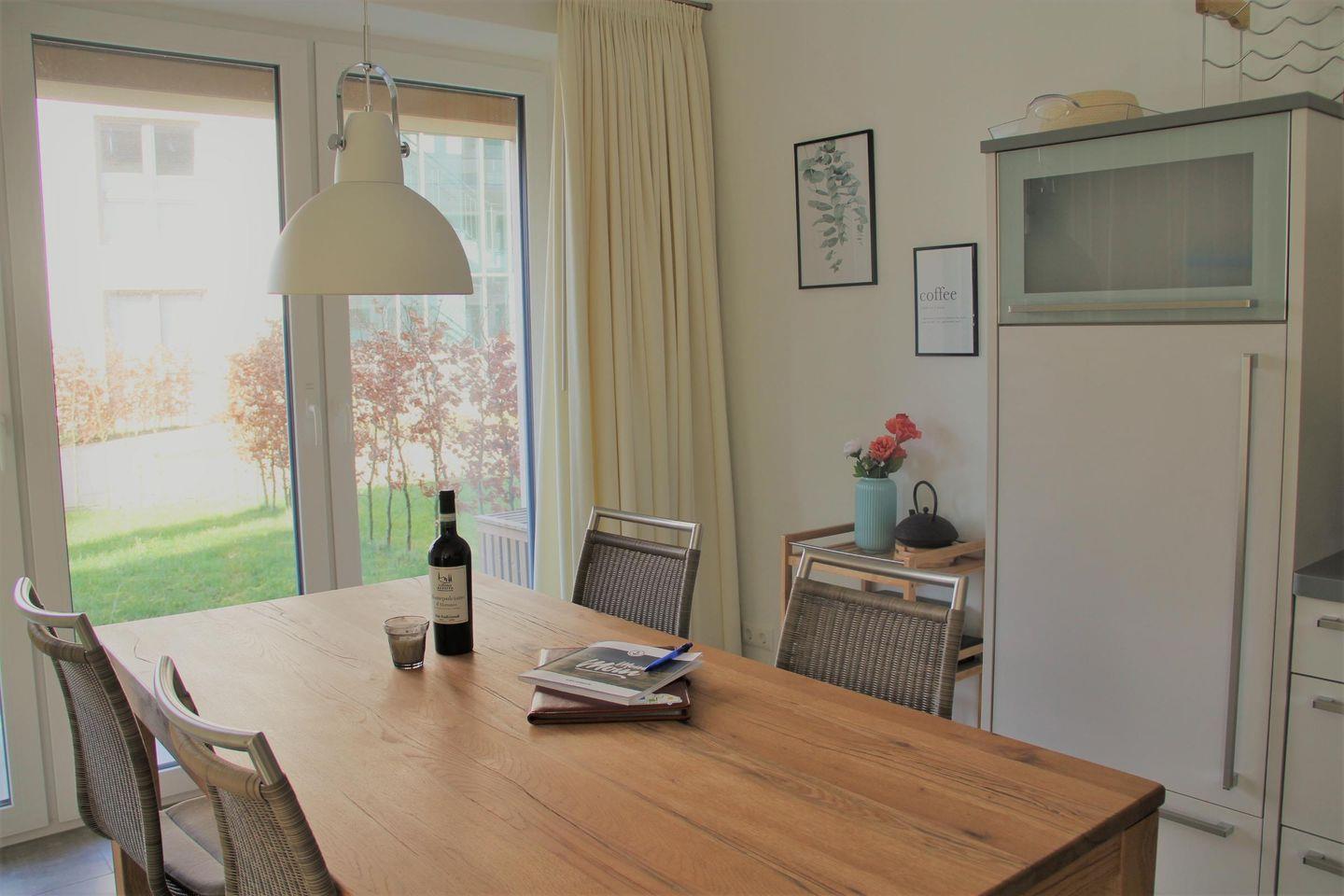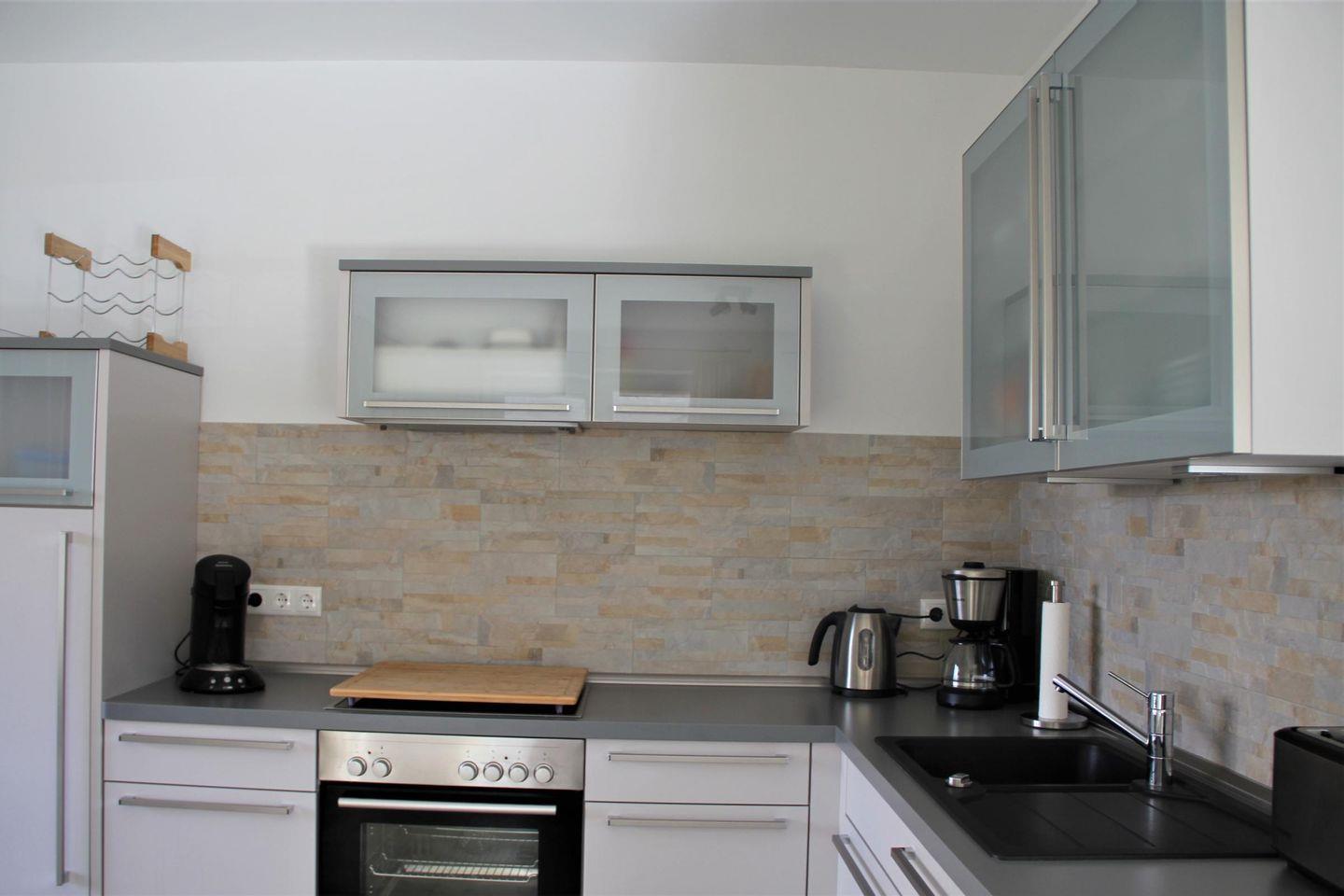 Küche und Haushalt: Vollausgestattete Küche mit E-Herd, Ceranfeld, Kühlschrank mit Tiefkühlfach, Filterkaffee- und Kaffeepadmaschine, Wasserkocher, Esstisch drinnen und draußen, Mikrowelle