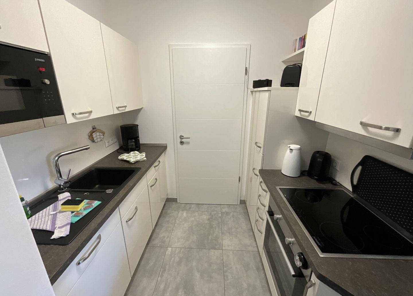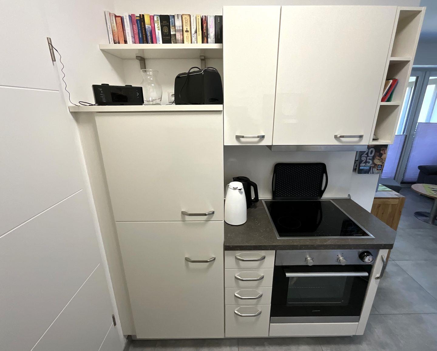 Küche und Haushalt: Einbauküche, Kühlschrank mit Gefrierfach, 4-Zonen Cerankochfeld, Backofen, Dunstabzugshaube, Geschirrspüler, Kaffeefiltermaschine, Toaster, Wasserkocher, hochwertiges Geschirr und Besteck