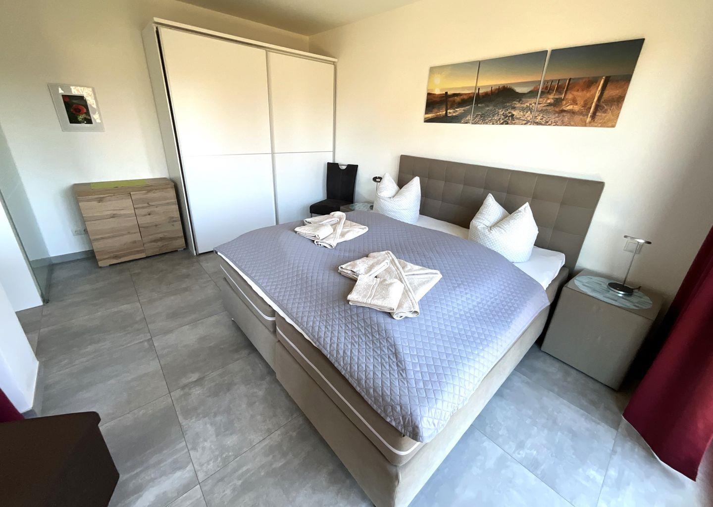 Vom Wohn-Essbereich gelangen Sie in Ihr Schlafzimmer. Das Schlafzimmer mit komfortablem Doppelbett und großem Kleiderschrank bietet viel Tageslicht, ist aber schnell und einfach zu verdunkeln dank blickdichter Vorhänge. Es wäre auch ausreichend Platz für ein zustellbares Kinderbett vorhanden.