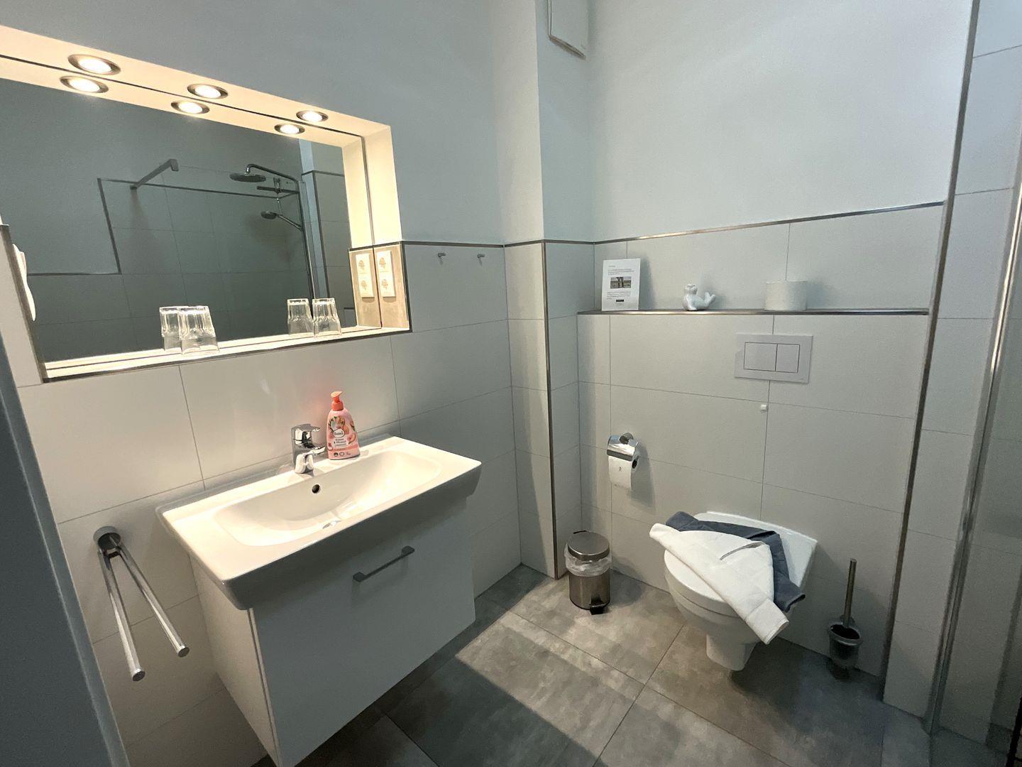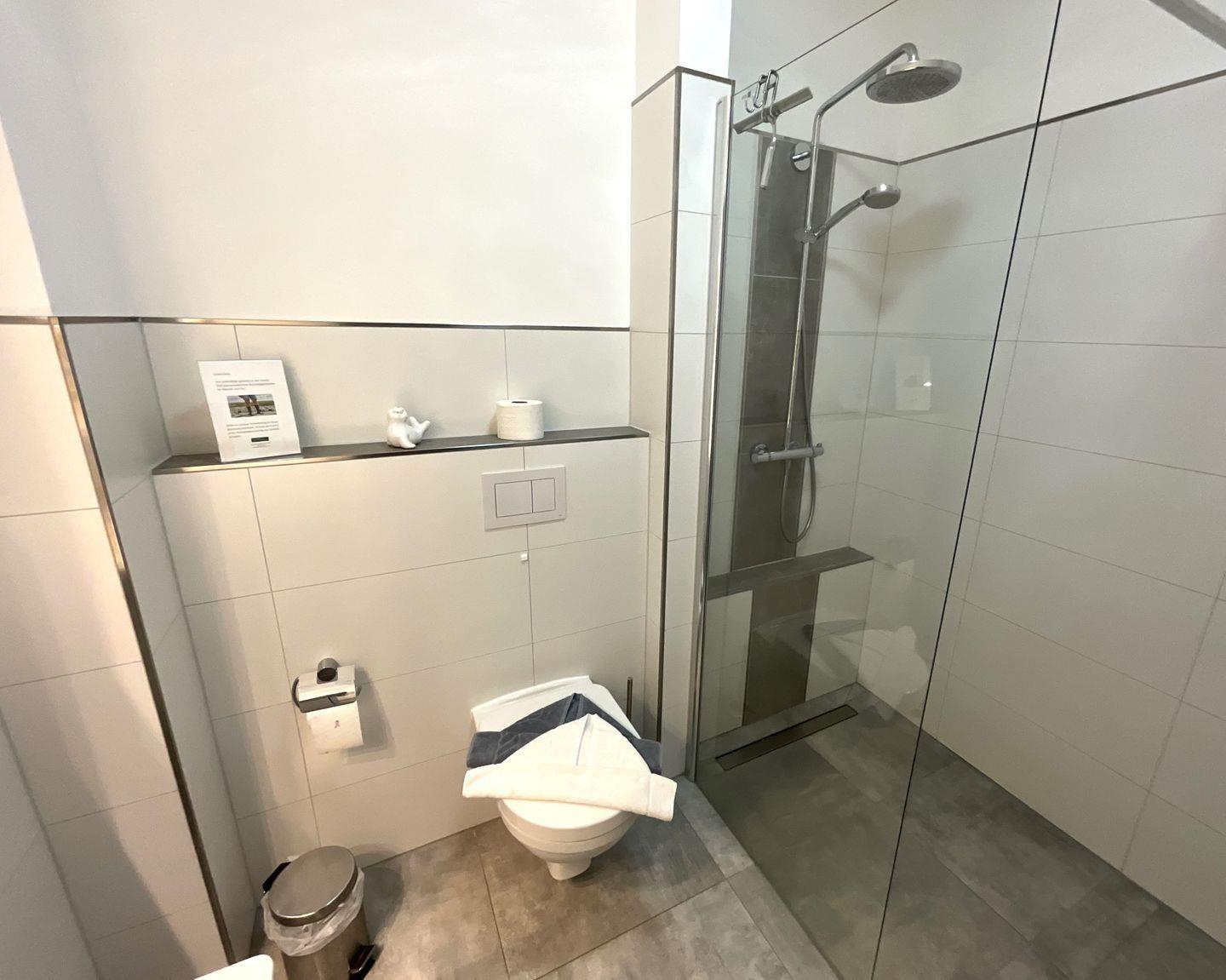 Über den Aufzug oder über die Treppe gelangen Sie in Ihr Urlaubsdomizil. Vom Eingangsbereich links gehalten geht es in das schicke Duschbad mit WC. Die große, bodengleiche Dusche, eine Handtuchheizung sowie der beleuchtete Spiegel als Nische über dem Waschbecken bieten allerhöchsten Komfort. Die begehbare Dusche ist auch für Gäste mit Einschränkungen bestens geeignet.