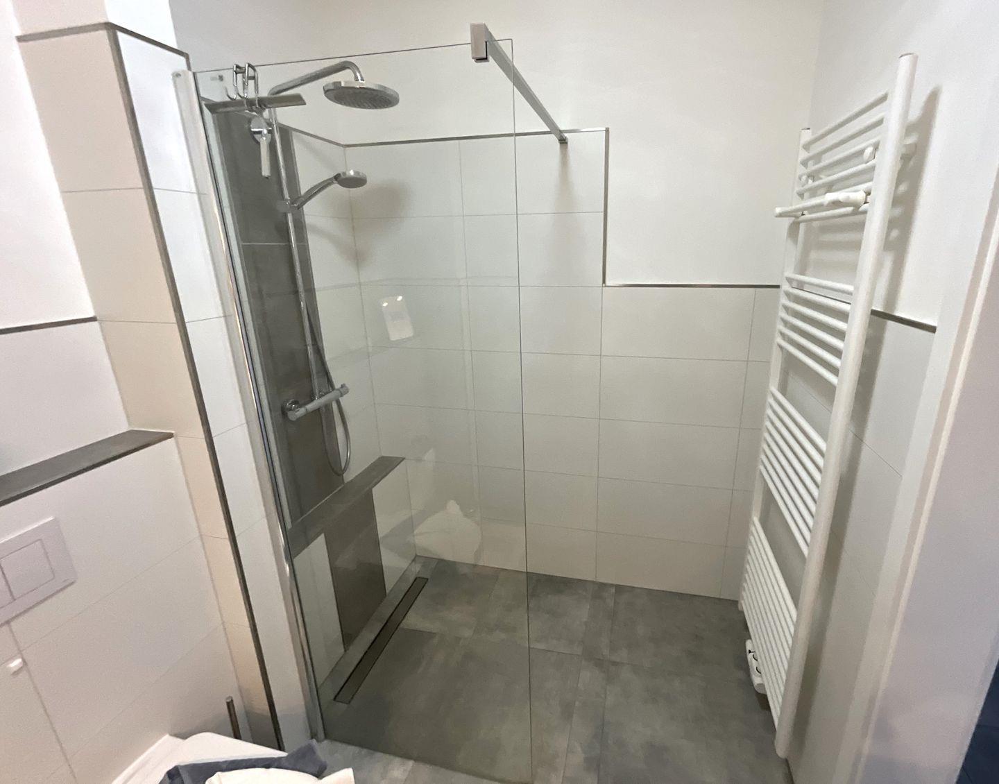 Bad und Sanitär: bodentiefe, barrierefreie Sommerregendusche, Waschtischanlage mit Spiegel, WC, Handtuchheizung, Handtücher auf Anfrage