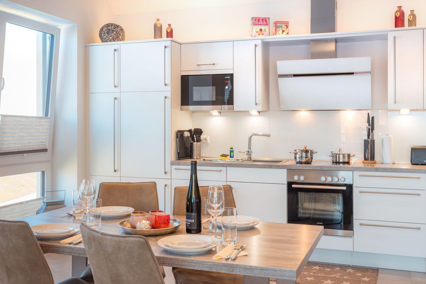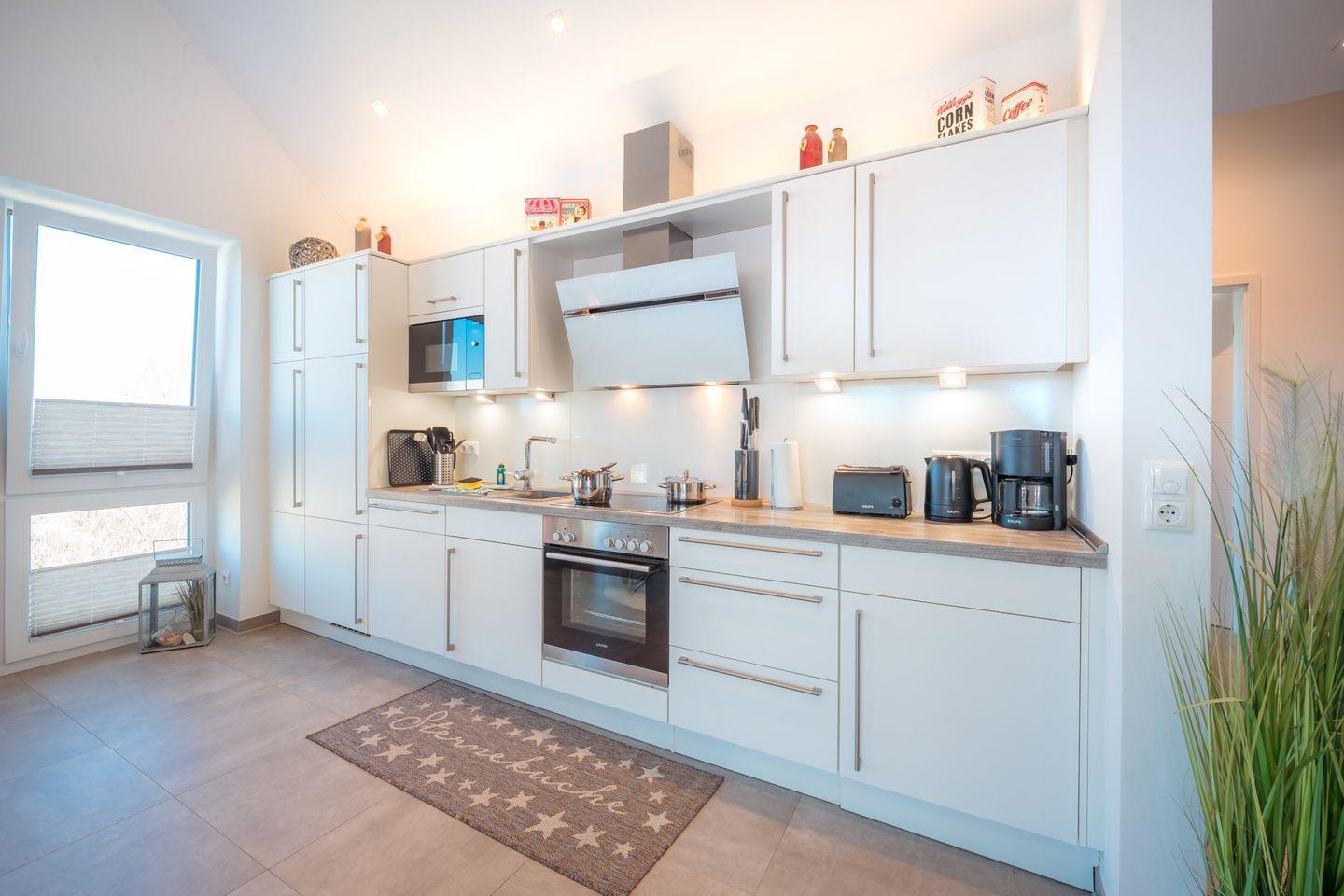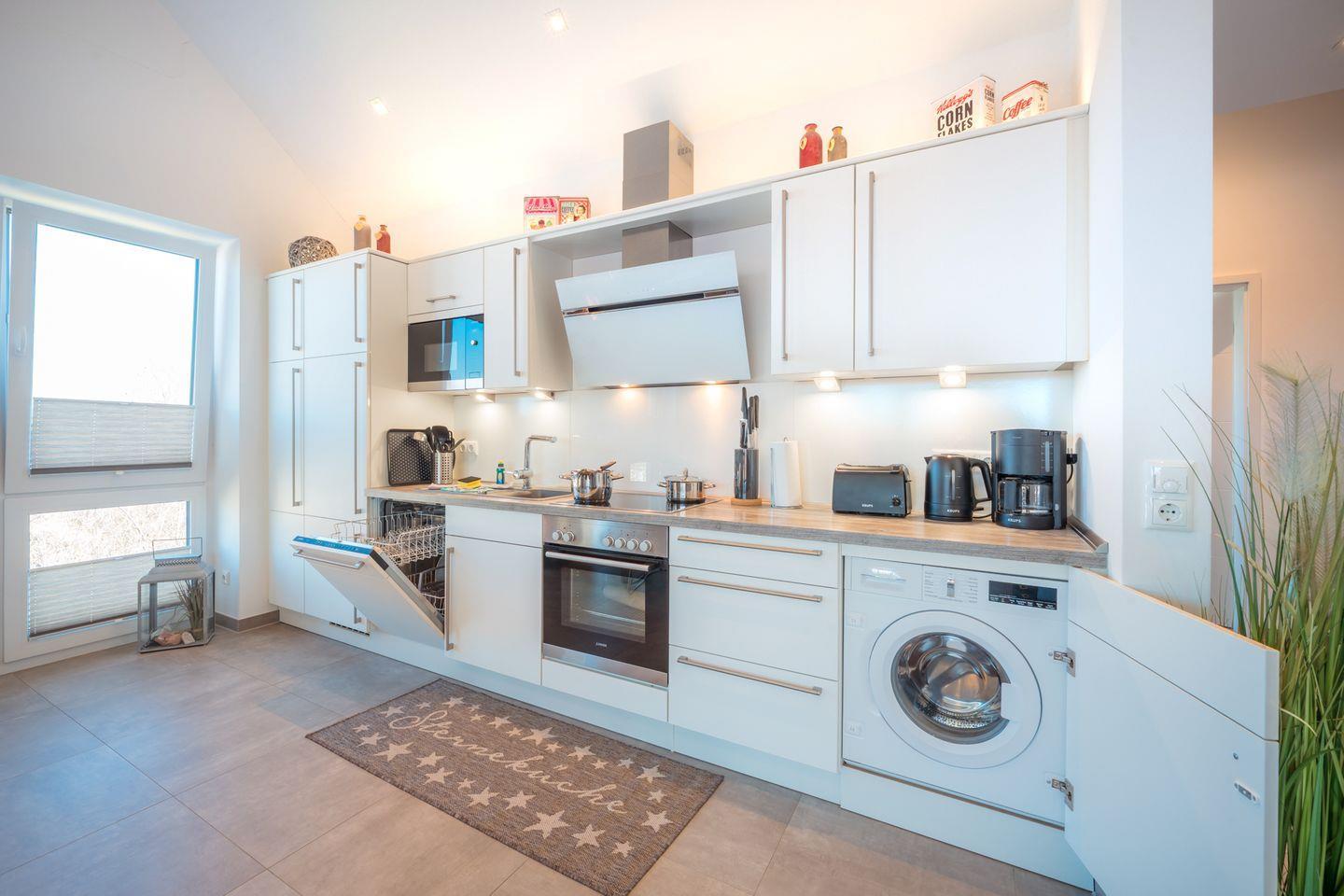 • Moderne, voll ausgestattete Küche mit Geschirrspüler, Mikrowelle, Cerankochfeld, Backofen, Kühlschrank mit TKFach, Waschmaschine, Kaffeemaschine, Wasserkocher, Toaster, Eierkocher, und vielem mehr.