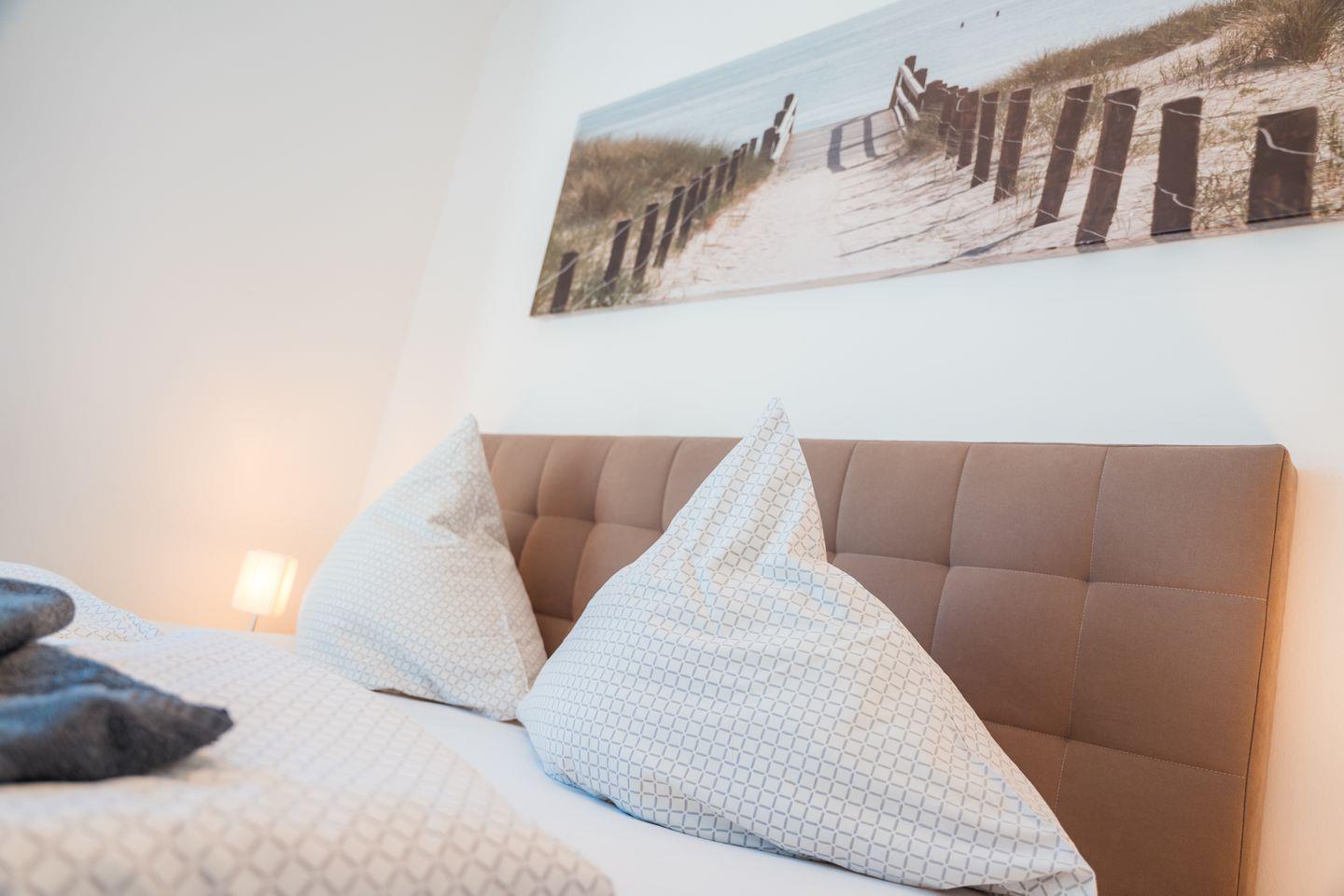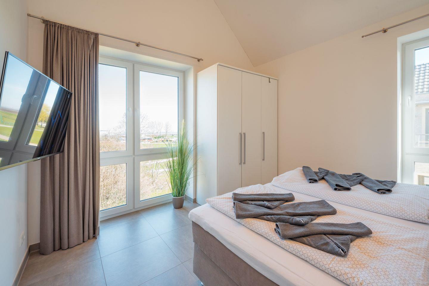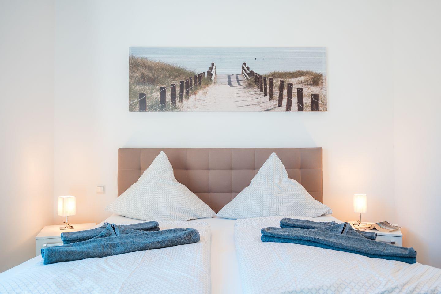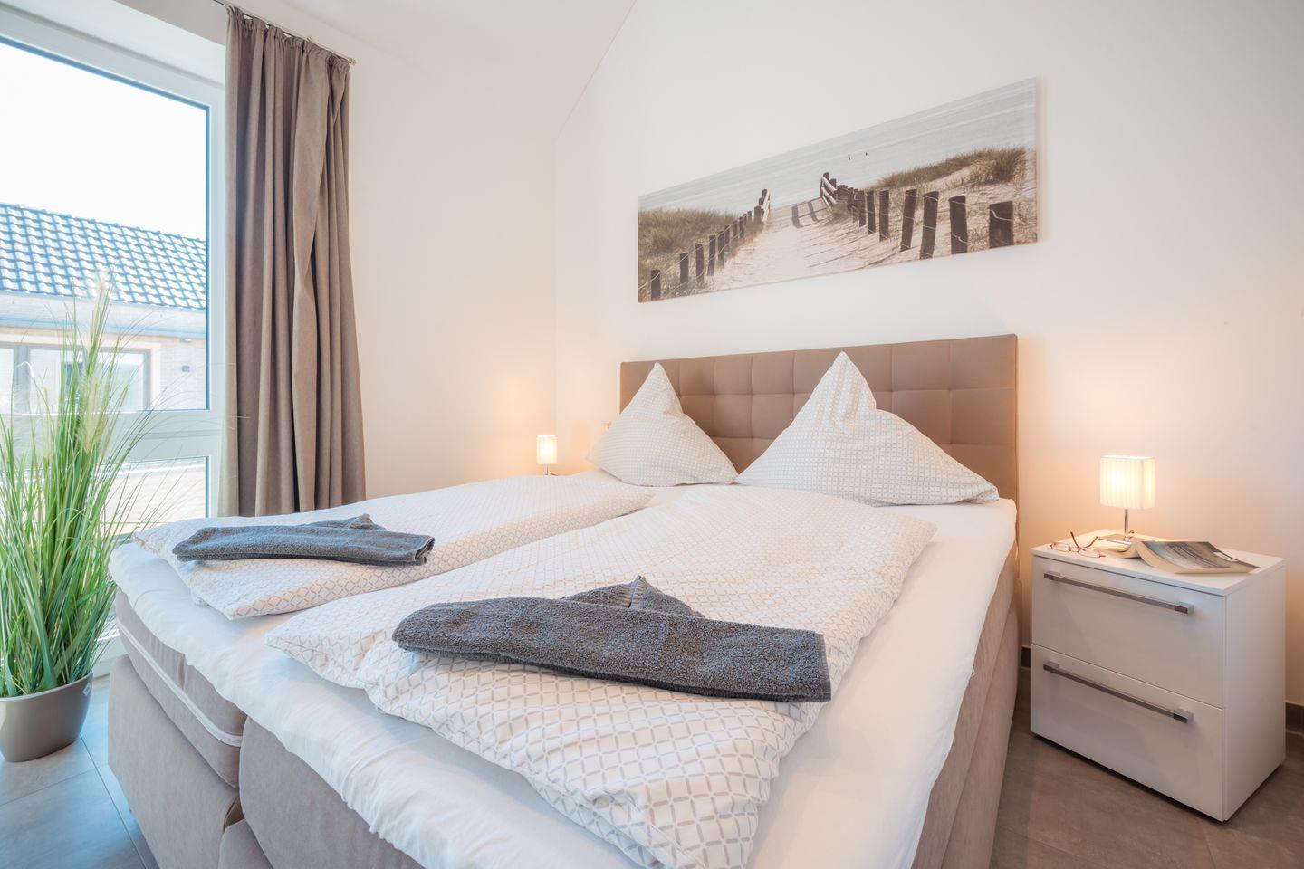 In dem Penthouse befinden sich zwei Schlafzimmer mit je einem Boxspring-Doppelbett (jeweils ein durchgehender Topper 180x200 cm). Extra hohe Komfortmatratzen mit zusätzlichen kuschelig-weichen Toppern sowie Fenster mit lärm- und wärmedämmender Dreifachverglasung sorgen für entspanntes Schlafen. Beide Schlafzimmer sind mit Full-HD-Flachbild-TV und Fliegengittern ausgestattet.